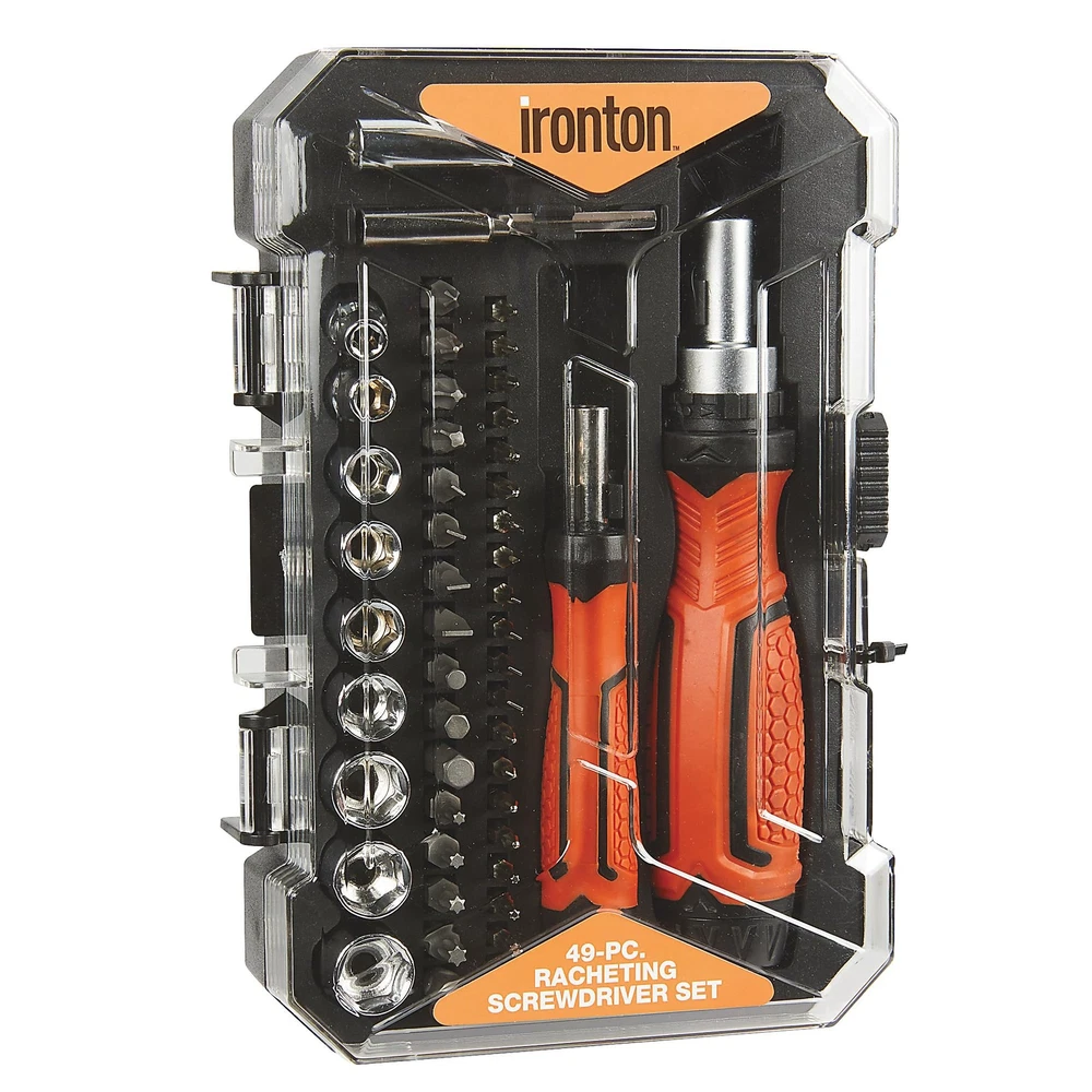 Ironton Ratcheting Screwdriver Bits are made from high-density chrome vanadium steel. 20 precision bits can be easily replaced and are suitable for home maintenance of small products. From standard sized driver bits for regular screws, 1/4in.-drive 6-point socket attachments and precision driver bits, this 49-pc. kit has everything the do-it-yourselfer or hobbyist could need for a project or craft. The ratcheting screwdriver handle features an ergonomic design that fits your hand comfortably to reduce user fatigue. The ratcheting feature also allows for the application of extra torque and precision. This kit comes in a compact hard-plastic case, so you’ll be able to keep it in your truck, camper or office. The front of the case is clear, so you can take Ironton Ratcheting Screwdriver Sockets, 49-Pc. Set Northern Tool Item# 5710853 Item Weight: 1.4000 lb(s) Manufacturer: MPN: Warranty: Mishandling, operation outside of design limits,misaaplication, improper repair, unauthorized modifications voids warranty. Product Summary: Ironton Ratcheting Screwdriver Bits are made from high-density chrome vanadium steel. 20 precision bits can be easily replaced and are suitable for home maintenance of small products. From standard sized driver bits for regular screws, 1/4in.-drive 6-point socket attachments and precision driver bits, this 49-pc. kit has everything the do-it-yourselfer or hobbyist could need for a project or craft. The ratcheting screwdriver handle features an ergonomic design that fits your hand comfortably to reduce user fatigue. The ratcheting feature also allows for the application of extra torque and precision. This kit comes in a compact hard-plastic case, so you’ll be able to keep it in your truck, camper or office. The front of the case is clear, so you can take inventory briefly. Includes (1) Precision ratcheting screwdriver; (1) ratcheting screwdriver; (2) Extensions; (1) Adapter; (20) Precision ratcheting screwdriver bits: SL: 1, 1.5, 2, 2.5, 3, 3.5; PH: 000, 00, 0, 0, 1, 1; PZ: 0, 0, 1, 1; Torx: 7, 8, 9, 10; (15) ratcheting screwdrivers bits: SL: 3, 4, 5, 6; Hex: 4, 5, 6; Torx: T10, T15, T20, T25; PH: #0, #1, #2, #3; (9) Sockets: 5mm, 6mm, 7mm, 8mm, 9mm, 10mm, 11mm, 12mm and 13mm. Payment Instructions You can pay us securely through eBay. All orders will contain an invoice/receipt. IMPORTANT: We will not honor requests to remove invoices or receipts from packages. No exceptions ON U.S. PURCHASES, Northern currently collects sales tax on purchases shipped to all states except: Alaska, Delaware, Montana, New Hampshire, Oregon Shipping Information This product will be shipped by Parcel. Parcel Shipping: Ground shipped items must be sent to a physical address and cannot be sent to a PO box. If a PO box address is submitted without a physical address, it may delay your order. We cannot ship to APO/FPO boxes. Please note that we do not ship items on weekends or holidays. More information on shipping and handling times can be found on our Store Policies Page . Customer Care We want you to be satisfied with your purchase; please notify us by email if you have any concerns. Before you send an email message, please check our Help Section . We may already have an answer to your question! We are available to answer your email questions Monday through Friday from 8am - 3pm CST, excluding holidays. If your email is sent on a weekend, holiday or after business hours, we will respond to you on the following business day. Returns may be accepted on most items within 30 days of receipt of the item. All returns require authorization from us. Some returns are charged a 15% restocking fee. Please click the Shipping and Payments tab on this item for specific return information and full details. About Our Products Product Warranty: Mishandling, operation outside of design limits,misaaplication, improper repair, unauthorized modifications voids warranty Warranty information and contact details can be found on our Store Policies Page. We are working hard to ensure that the information provided on the eBay product advertisements is accurate and up-to-date. We reserve the right to correct ad errors and/or omissions. Pricing and availability is subject to change without notice. Yes
