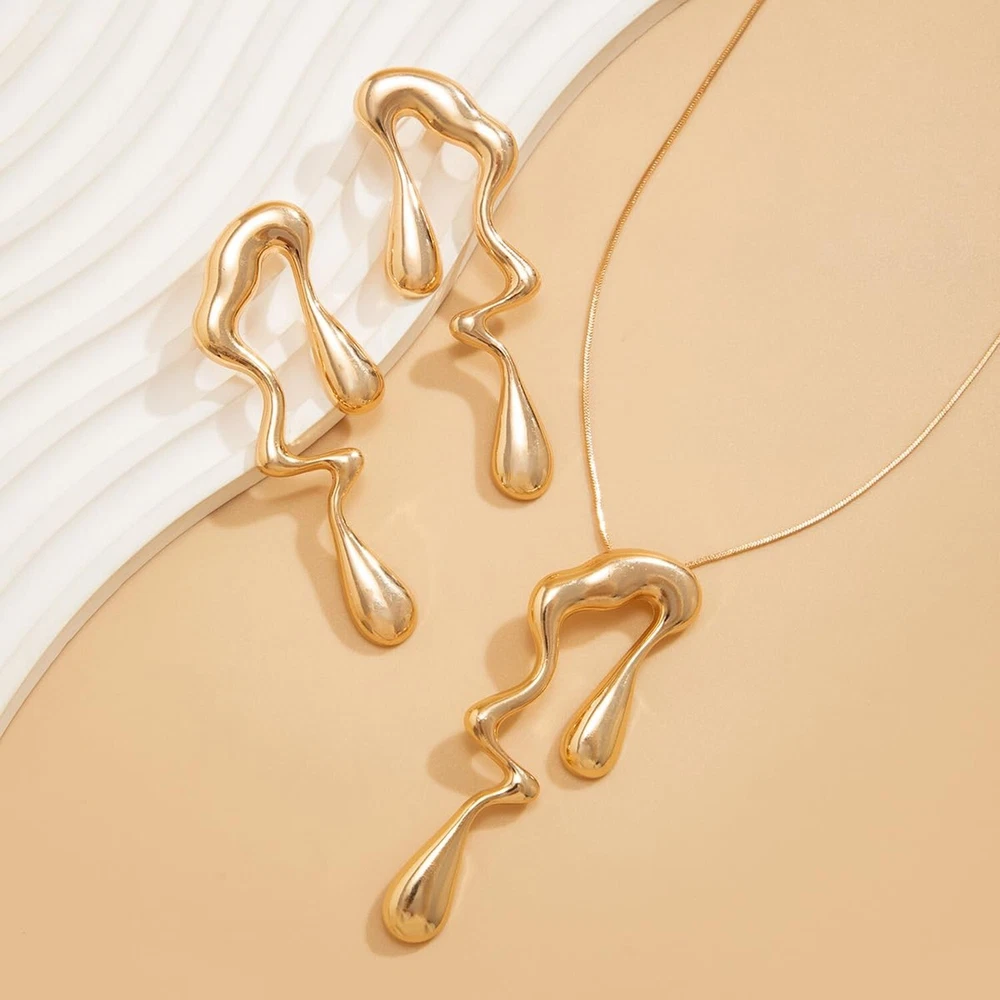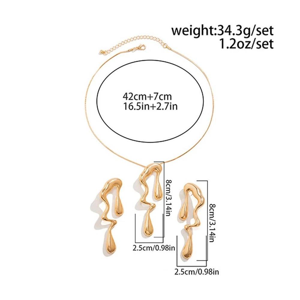 Irregular Gold Statement Earring Necklace Set for Women Chunky Teardrop Dangle Earrings Liquid Metal Thick Geometric Necklaces Dainty Jewelry Gifts Product Details Color: Gold1 Brand: Uarein MPN: Does not apply UPC: Does not apply EAN: Does not apply Product Dimensions : 3 x 1 x 0.1 inches; 0.8 ounces Department : womens Date First Available : April 16, 2024 Brand, Seller, or Collection Name: Uarein Metal: Copper Material: Copper Alloy Gem Type: No Gemstone Item Length: 3 inches Clasp: Lobster Clasp This is a unique shaped jewellery set you can get a delicate earrings and a charming necklace. These melting liquid metal teardrop earrings and necklace look very stylish and glamorous. The irregular geometric shape of the jewelry set allows you to have more ways of matching them and you can choose how to match them according to what you are wearing and your mood.