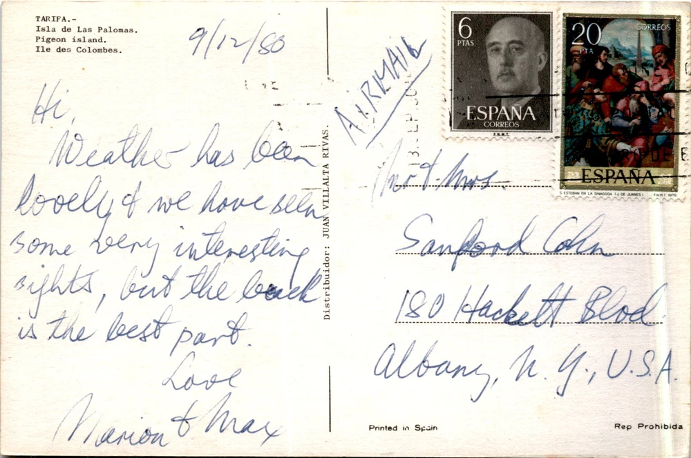 MAKE AN OFFER. THE MORE YOU BUY THE BETTER DEAL I WILL ACCEPT The postcard is from KC Tarifa, featuring the Isla de Las Palomas (Pigeon Island) and mentioning the weather on 9/12/80. The postcard is an airmail with a distributor named Juan Villalta Rivas. The sender, Marion & Max, express their love and mention some interesting sights they have seen.