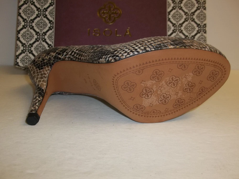 Isola Size 6.5 M Cagney Snake Print Sand Leather Platform Pumps New Womens Shoes. Leather snake print upper. Remainder is man made materials. Actual heel height is approx 4 inches. Platform is approx 3/4 inches. Euro 37.5.