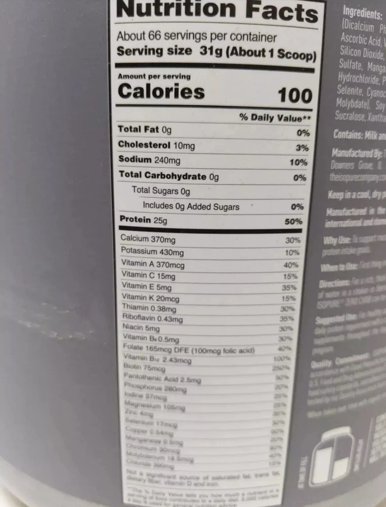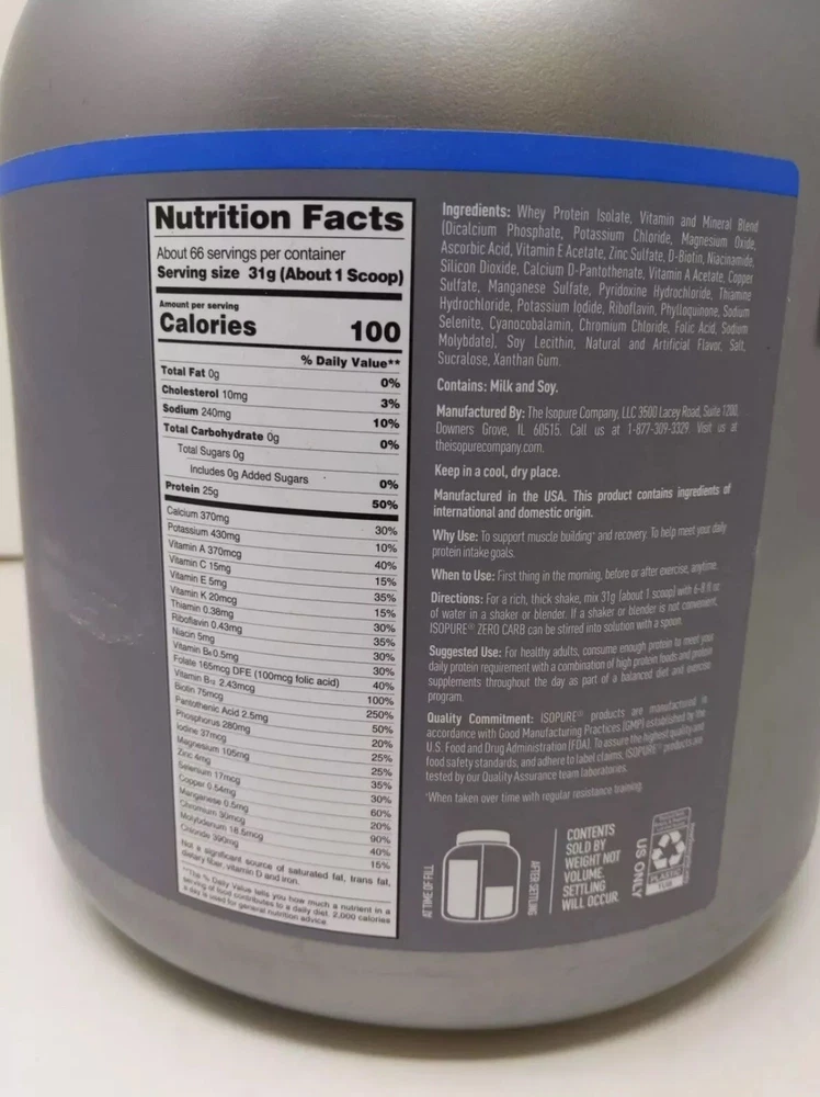 Dosage: 5 mg Flavor: Vanilla Features: Gluten-Free, Alcohol Free, Low Carb, Lactose-Free, Zero Carb When to Take: After Meal gtin13: 0089094022938 Main Purpose: Gym & Training, Weight Management, Baseball, Appetite Control, Bodybuilding, Fitness UPC: 0089094022938 Type: Soy Protein Number of Pills: 1 Formulation: Bar, Powder MPN: NBT02293 Item Weight: 4.5 lb Department: Men, Unisex, Women Brand: Isopure Supply: Up to 1 Month Ingredients: Whey Protein, Vanilla, 1-Deoxynojirimycin (DNJ), Dicalcium Phosphate, Potassium, Protein, Zinc Active Ingredients: Vitamin A, Vanilla, 1-Deoxynojirimycin (DNJ), Protein, Zinc Country/Region of Manufacture: United States