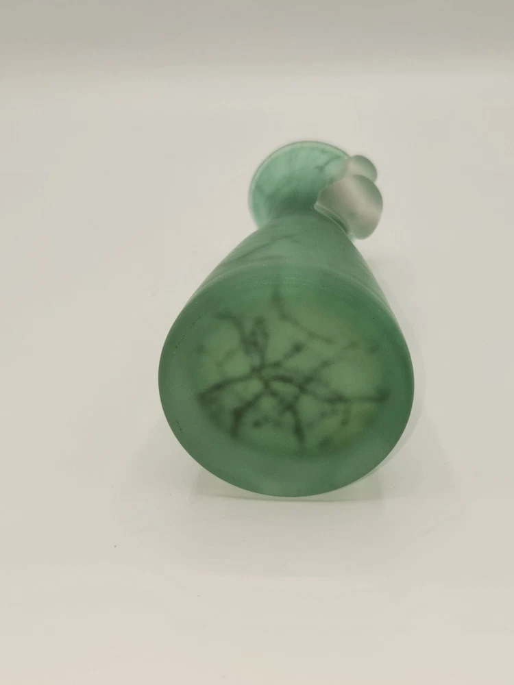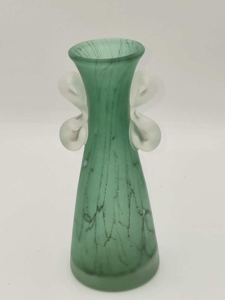 This Israeli Glass Satin Green Bud Vase features an abstract asymmetrical shape with frosted handles, hand-blown from green satin glass in Israel during the 1950s. Standing at 6.5 inches tall, this small vase showcases a unique artistry that makes it suitable for all occasions. With its mid 20th-century origins and original handmade construction, this piece exudes a vintage charm perfect for collectors or those appreciative of abstract art.