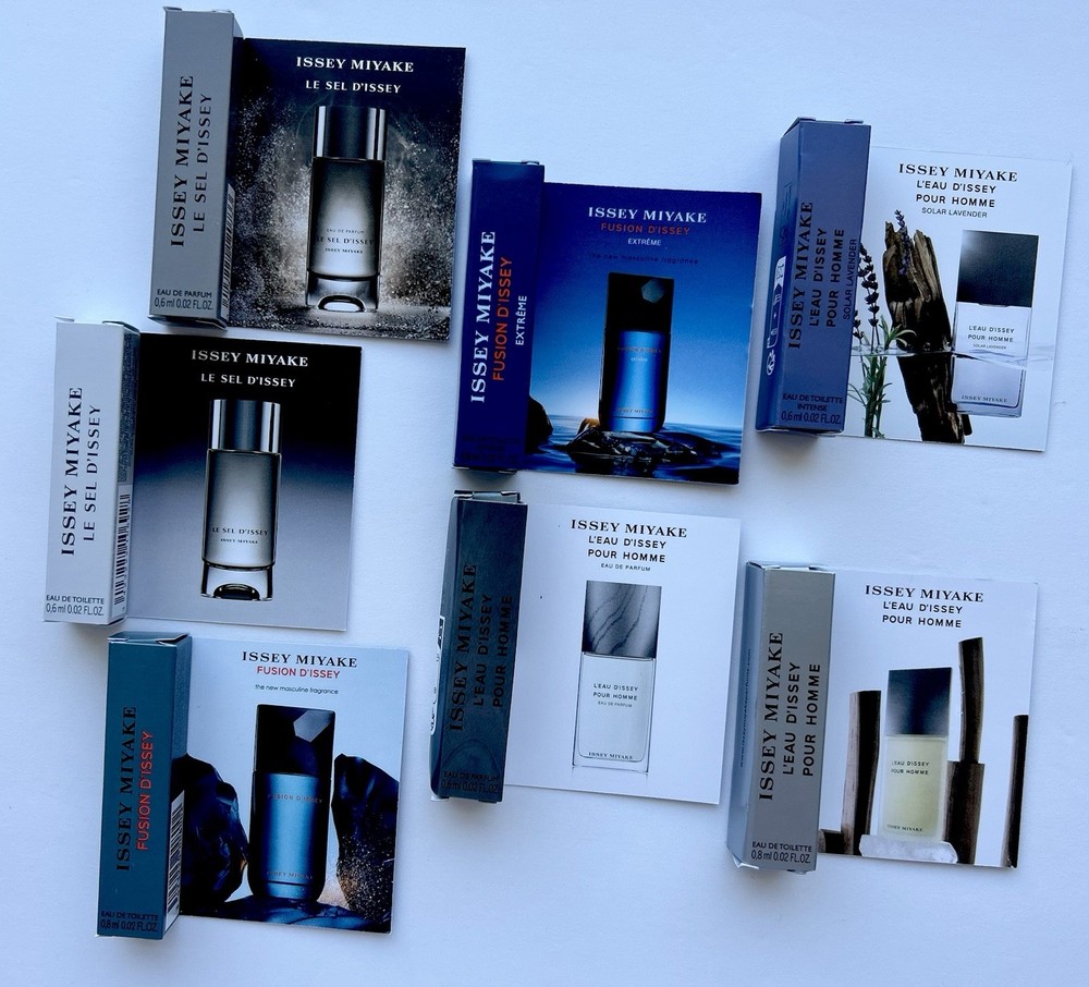 - Le Sel D'Issey Eau de Parfum 0.6ml - Le Sel D'Issey EDT 0.6ml - L'Eau D'Issey Pour Homme EDT 0.8ml - L'Eau D'Issey Pour Homme Eau de Parfum 0.8ml - L'Eau D'Issey Pour Homme Solar Lavender 0.6ml - Fusion D'Issey EDT 0.8ml - Fusion dD'Issey Extrême 0.8ml