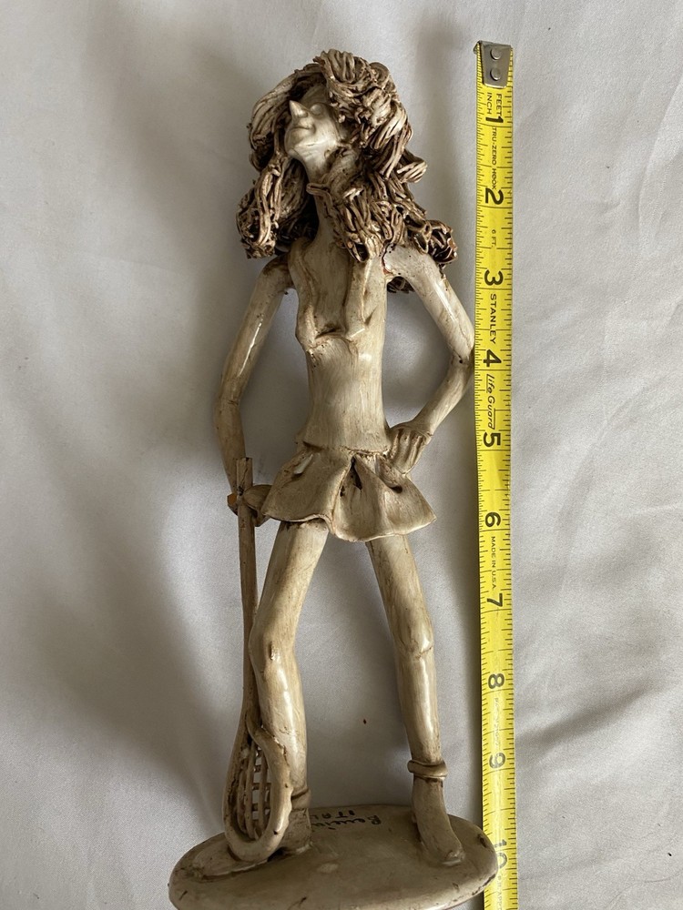 This is a unique, one-of-a-kind sculpture by Italian artist Dino Bencini. The piece features a woman playing tennis and is made of clay using pottery & sculpting techniques. It is a medium-sized, figurative art piece that was produced in the 70’s. This artist made a man playing a piano and when Barry Manilo visited Italy, he bought it and put it on his 1975 album cover, bringing this artist much popularity.