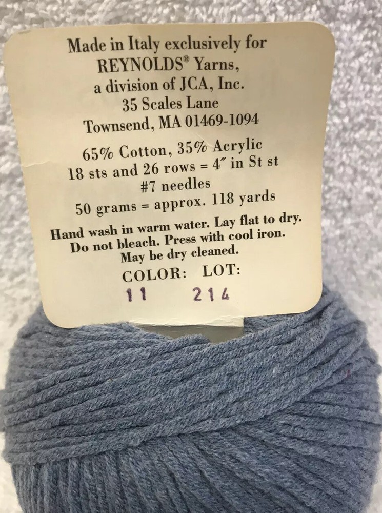 Country/Region of Manufacture: Italy Fiber Content: Cotton / Acrylic Model: Tucson Color: Blue Style: Solid Weight: Aran Weight Shape: Ball Unit of Sale: Unit Type: Aran Yarn Brand: Reynolds Product Line: Tucson