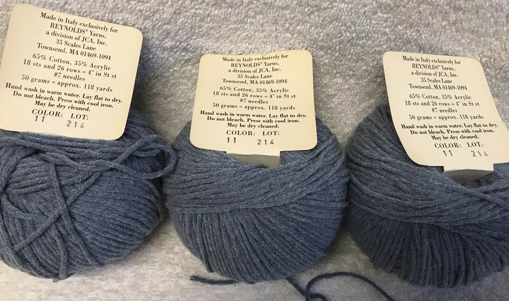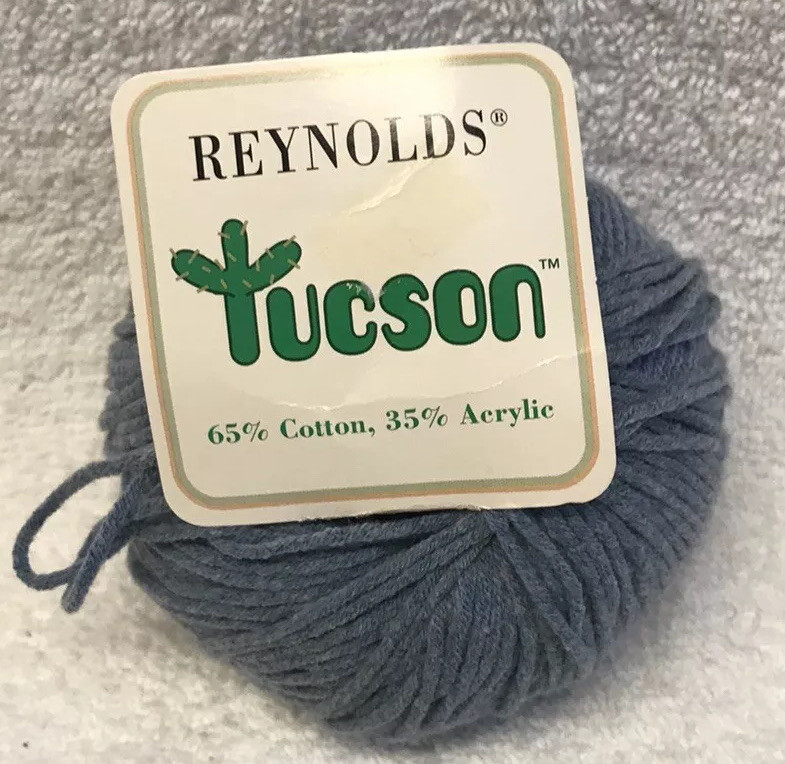 THREE (3) skein Reynolds TUCSON yarn, Cotton/Acrylic, Blue (11), 1.75 oz new in package Tucson (discontinued) Aran weight color: Dusty Blue (11) 65% Cotton / 45% Acrylic made in Italy 1.75 oz / 50g / 118 yards care: Hand wash warm / Flat to dry