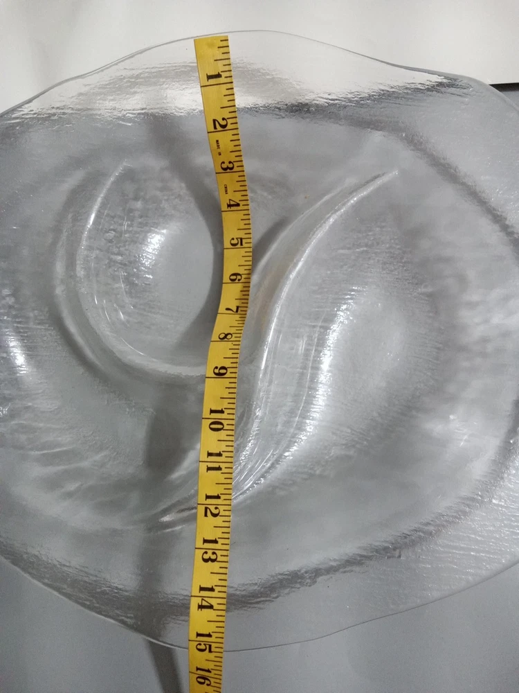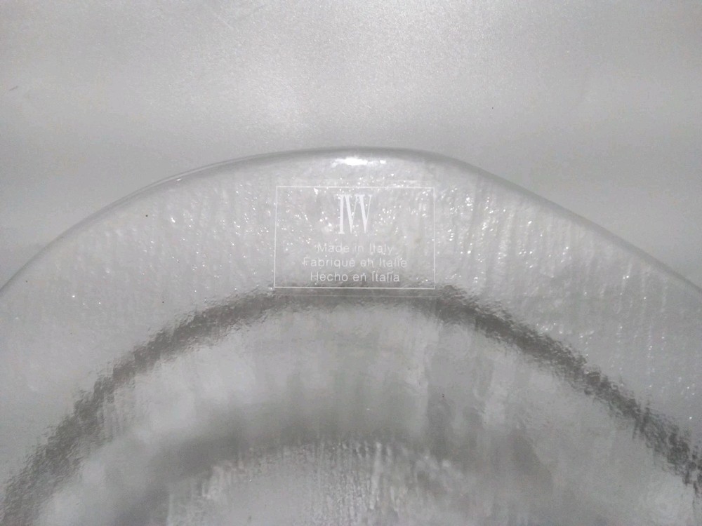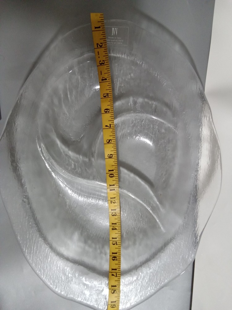 Theme: Serving Dish Platter Features: Dishwasher Safe Type: Serving Bowl Character Family: na Pattern: Abstract Year Manufactured: 1990 Item Height: 19" UPC: Does not apply Character: na Material: Glass gtin13: Does not apply Shape: wavy oblong Model: see pics Personalize: No Number of Items in Set: one piece Brand: IVV Department: Adults Item Weight: see pics Color: Clear MPN: n/ a Custom Bundle: No Country/Region of Manufacture: Italy Item Width: 14" Style: Art Deco Item Diameter: 14" Finish: glass Item Depth: 2" Manufacturer Warranty: na Occasion: All Occasions Original/Reproduction: Original