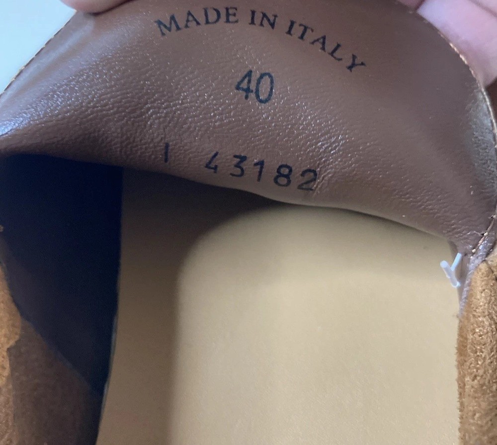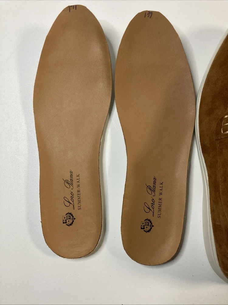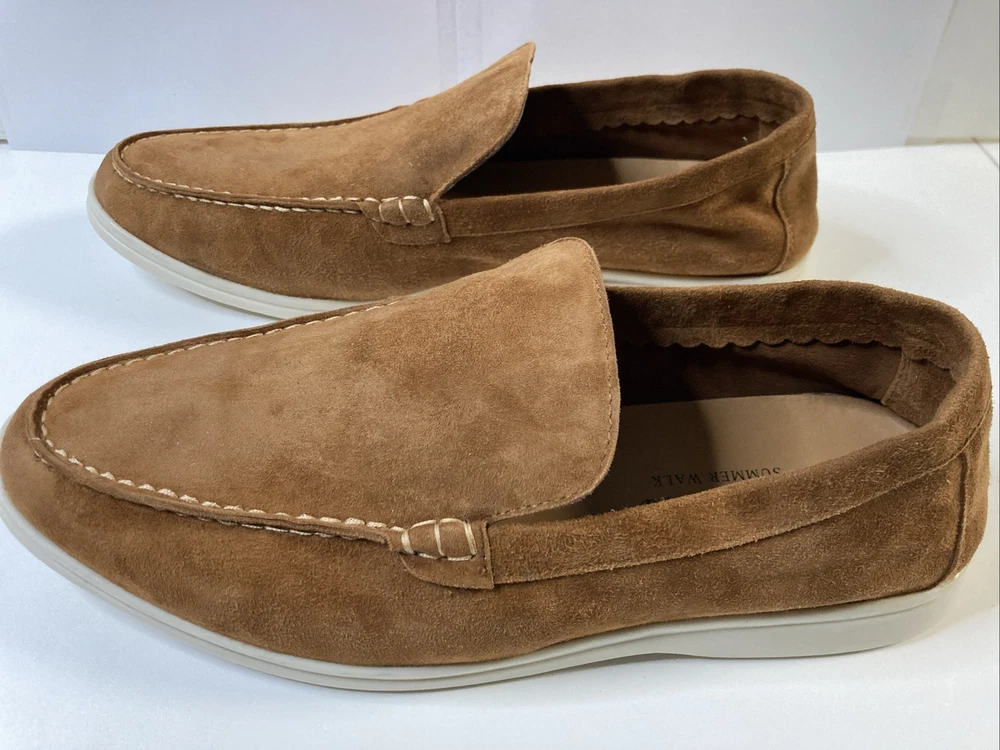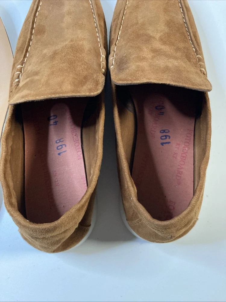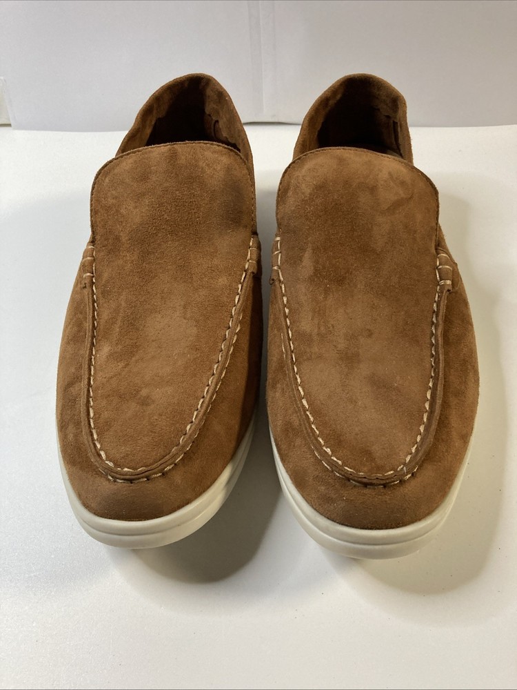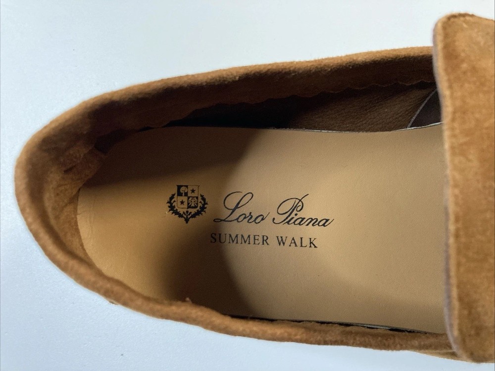 The product is a pair of Italian hand-made Loro Piana summer walk women's suede loafers in a stylish brown color. Crafted with high-quality materials, these loafers are designed to provide comfort and sophistication for any summer outing. The size is 8.5, narrow which is equivalent to a European 40, making them a versatile choice for various occasions. Perfect addition to any woman's shoe collection, these loafers embody Italian craftsmanship and timeless style. Only worn once so this is someone’s good fortune if looking for hand made Italian loafers Thanks for looking