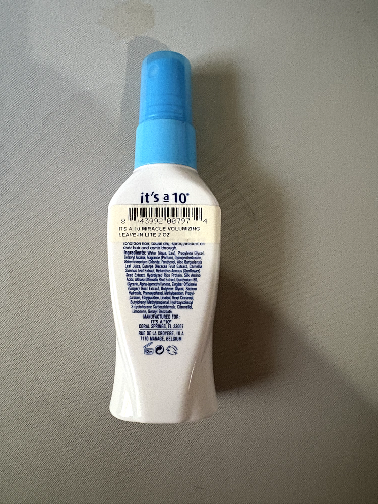 It's A 10 Miracle Leave In LITE 2 fl oz Travel Size Brand New Without Box. Want the power of our classic Miracle Leave-In Product without all the heaviness? Miracle Leave-In Lite is just the answer. This unique, ultra-light formula is designed for those with fine or short hair and uses some of the lightest yet most effective ingredients available. Chamomile extract serves as a gentle, soothing treatment for both hair and scalp, while hydrolyzed silk restores moisture, strength, and shine. Combined with a number of other natural ingredients, our Miracle Leave-In Lite is just the pampering product your hair deserves. Althaea Officinalis (Marshmallow) Root Extract: this natural hair care powerhouse offers numerous benefits such as lift, body, volume and lightweight conditioning with absolutely zero build-up or heaviness. It also works to improve hair’s health by reducing scalp irritation and dryness – imparting even more weightless volume Acai Extract: improves tensile strength and shine Chamomile Extract: a gentle, soothing treatment for hair and scalp Green Tea Extract: enhances overall hair health with antioxidants and nutrients Hydrolyzed Rice Protein: light-as-air formula for rebuilding and strengthening damaged hair Hydrolyzed Silk: restores natural lightweight moisture balance while adding strength and shine Sunflower Seed Extract: natural sunscreen that guards against dryness and color fading or brassiness Panthenol: a highly effective strengthener Linalool: plant-based shaper and fragrance Citronellol: a lemony scented oil that strengthens hair against environmental hazards like fungus and dirt build-up