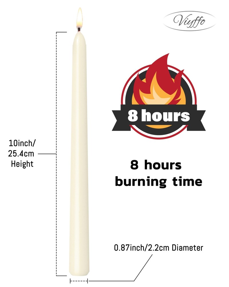 Ivory Taper Candles, 10 Inch Set of 4, Unscented, Dripless, Smokeless, 8 Hours Long Burning, Hand Poured Tall Tapered Candlesticks Wedding Advent Home Decor Dinner Timeless tapered design: these ivory taper candles feature the timeless and elegant design of candlesticks, with a slender and tall shape. Hand-poured taper candle that adds sophistication to any setting. Smokeless, dripless an unscented: crafted with a blend of soy wax, beeswax, and a small paraffin, these candles offer a clean and smoke-free burn. Say goodbye to messy wax drips, as these candles are designed for a smooth and hassle-free experience. Extended burning time: each of these tapered candles offers an impressive 6-8h burning time, ensuring that your candles will provide a warm and inviting glow throughout your event or evening. Their long-lasting performance makes them ideal for extended gatherings and celebrations. These tapered candles are unscented, making them perfect for individuals who prefer a fragrance-free atmosphere. set of 4: this ivory candle set includes a quantity of 4 pieces, offering you ample options for creating beautiful and enchanting decorative arrangements. Whether you want to illuminate a romantic dinner or adorn your event venue, these long taper candles provide versatility. Ideal for home decor and weddings: with their classic ivory, these taper candles are perfect for enhancing the ambiance of your home decor. Additionally, they make an excellent choice for weddings, adding a touch of sophistication and romance to your special day. Whether you place them in candle holders, candelabras, or use them as part of your table centerpiece, these taper candles are a versatile and stylish addition to your decor. Introducing our exquisite taper candle, a perfect blend of elegance and functionality. With a burning time of 6-8 hours, this candle promises to illuminate your special moments with warmth and charm. Whether it's a wedding ceremony, a festive celebration, or a cozy dinner with loved ones, this candle is the ideal choice to set the mood and create a magical atmosphere. Place it on your dining table to add a touch of sophistication to your meals, or use it as a centerpiece to enhance the ambiance of your decorations. Experience the beauty and versatility of our candle, designed to elevate every moment and make memories that last a lifetime. Whether you're planning a romantic evening or hosting a festive party, let this candle be the centerpiece of your cherished moments. Various coccasions: Religious ceremonies, weddings, memorials, holidays, home decor, candlelight vigils Ingredient: soy wax, beeswax and a small amount of paraffin wax Safety Tips Prior to lighting, ensure that all packaging has been removed. Trim the wick to a length of 1/8" to 1/4" and ensure it is centered. Always use appropriate candle holders and place them on a heat-resistant surface. Exercise caution and never leave a burning candle unattended. Keep lit candles away from drafts, flammable materials such as curtains, and out of reach of children and pets. We recommend limiting the burning time to a maximum of 2 hours per session. Shipping We offer FREE shipping on all orders! We ship within Three business days of payment, usually sooner. We use a selection of shipping services such as UPS, FedEx, USPS etc. We only ship to the lower 48 states, no APO/FPO addresses or PO Boxes allowed. Local pickups and combined shipping options are not provided at this time. International buyers – please note: Import duties, taxes, and charges aren't included in the item price or postage cost. These charges are the buyer's responsibility. Please check with your country's customs office to determine what these additional costs will be prior to bidding or buying. Order Cancellation Policy * Order Cancellation Policy ** You can return a product for up to 30 days from the date you purchased it. 1. The seller reserves the right to cancel the special case only due to eBay cancellation fee. 2. The decision of seller is the final. 3. The seller will respond to the cancellation request within 2 business days. Please wait for the result of cancellation. 4. In case the cancellation is not completed by some reasons, the buyer can follow the options below to get the refund. 4.1 The buyer can reject the item when it arrives. 4.2 The buyer can send the item back to the seller within 30 days If the buyer receives item (USA Shipment ONLY). The seller will provide the FREE return label to the buyer when the buyer opens " Return Item" case on eBay by using the reason as "Change my mind" ONLY. 5. When buyer has placed the order. The order will be processed and completed by automatic warehouse system within 5 minutes. In case that buyer sends the cancellation request after 5 minutes of placing the order, the request will be rejected. **Sending direct message to cancel the order is not allowed for every case.* Return Policy - If buyer would like to return the items for refund or replacement, please CONTACT SELLER to receive the free return label from seller. The refund or replacement will be processed with the tracking number of return label which is provided by seller only. The other ways of return which are not approved by seller will not be processed for the refund or replacement. Return You can return a product for up to 30 days from the date you purchased it. Any product you return must be in the same condition you received it and in the original packaging. Please keep the receipt. Payment We accept payment by any of the following methods: eBay Payments Please pay as soon as possible after winning an auction, as that will allow us to post your item to you sooner! Feedback Customer satisfaction is very important to us. If you have any problem with your order, please contact us and we will do our best to make you satisfied. Contact Us If you have any queries, please contact us via ebay. We usually respond within 24 hours on weekdays. Please visit our eBay 