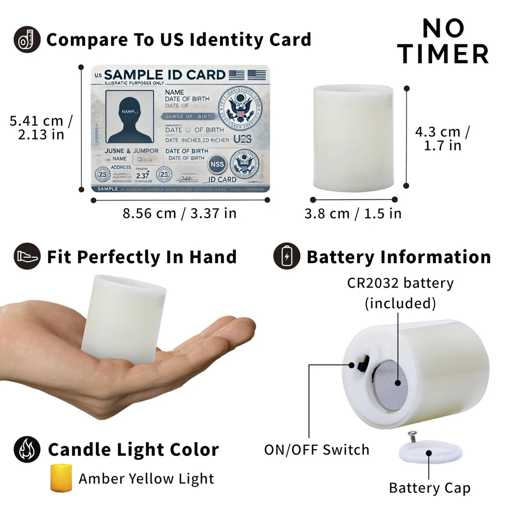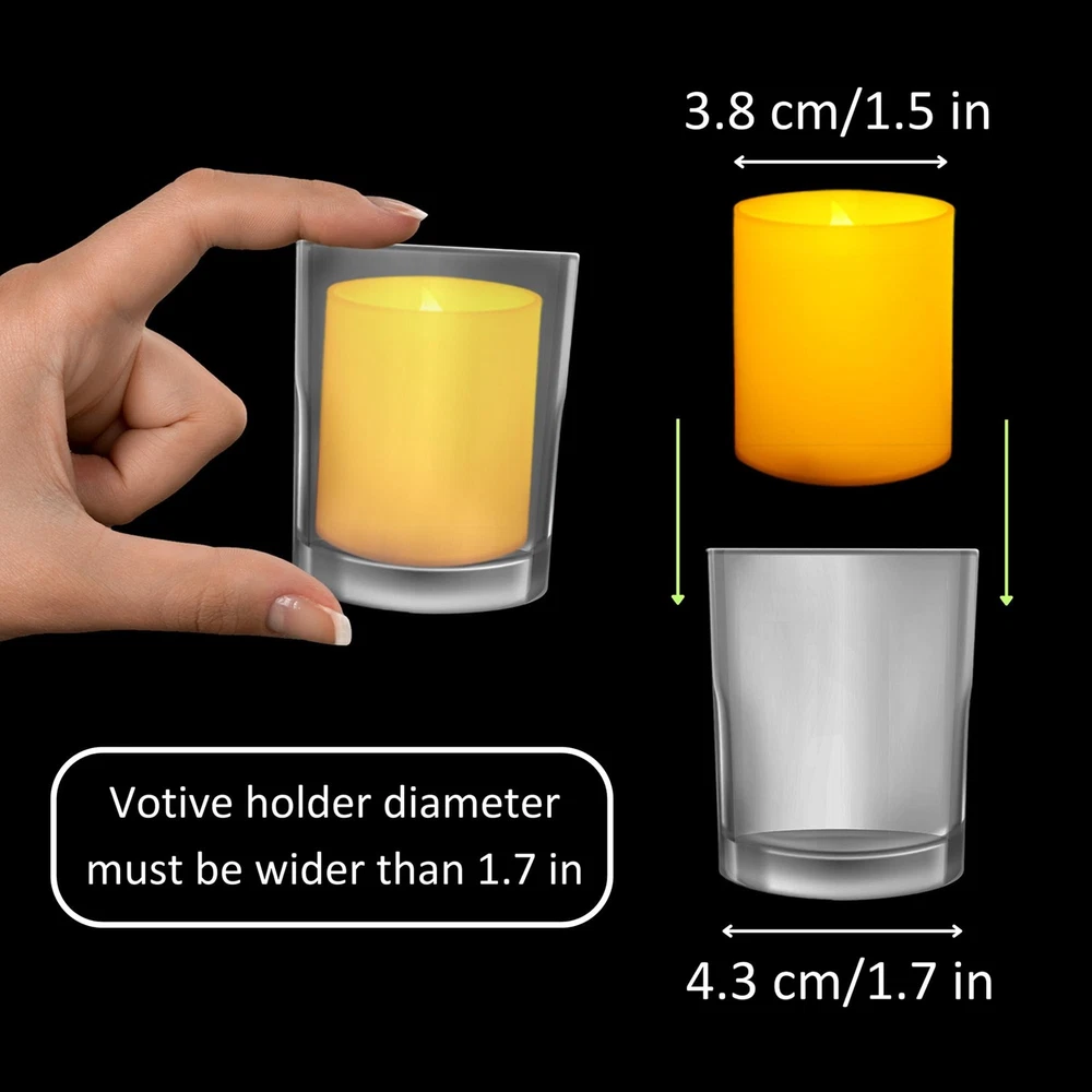 Who is ? is a brand of Tong Yune Industrial Co. was founded in 1994 to the consumers. We operate our own manufacturing facilities, 2 in Zhuhai of China, 1 in Myanmar and with our headquarter in Taipei of Taiwan. We manufacture OEM/ODM for our clients worldwide. Such as Michaels, Walmart, Kmart, JCPenny, GE, etc... With over 25 years of experience, inspiration, and dedication, we have the background and know-how to design, develop, and produce unique and enjoyable LED lighting products to brighten up your life. PRODUCT SPECIFICATION Item: LED Votives Candles Color: Ivory Product Dimensions: 2"Diameter x 2"Height Material: High Quality Plastic, LED LED Color: Warm Yellow Power Source: 1 x CR2032 Battery Per Candle, Pre-Installed Switch Options: Slide ON/OFF QUALITY CERTIFICATION CE Verification CE Mark on our products certifies that products have met EU consumer safety, health and environmental requirements. RoHS(Restriction of Hazardous Substances) and WEEE(Waste Electrical and Electronic Equipment) FCC(Federal Communications Commission) FCC Compliance Testing Verification 👍 SAFE and ENVIRONMENT-FRIENDLY Flickering Flameless LED Candles are ready to use when you open the package. No smoke, No dripping wax, never worry about fire accident, safe to use around children, pets and seniors. CUSTOMER SERVICE If you have any questions or concerns, please contact us at the first time, and we would be more than happy to assist, reply within 24 hours. Thank You for Choosing us! 🕯️ Safe for Kids and Pets: Experience the beauty of candlelight without worries. Our flameless Ivory candles are safe around children and pets—no fire hazards, no messy wax, just peace of mind. 🕯️ Effortless Cozy Glow: Illuminate any space with our charming White battery-powered LED votive candles. Instant warm, flickering light—just pure relaxation. 🕯️ Choose Your Perfect Pack: Available in packs of 6, 12, or 24, select the ideal quantity for intimate settings or larger celebrations. 🕯️ Perfect for Special Moments: Measuring 1.5" x 1.7", these petite White candles add a heartfelt touch to any occasion—romantic dinners, festive gatherings, or peaceful evenings. 🕯️ Quality You Can Trust: Purchase confidently knowing your White votive candles are backed by reliable quality. We're here to ensure your happiness—contact us anytime!