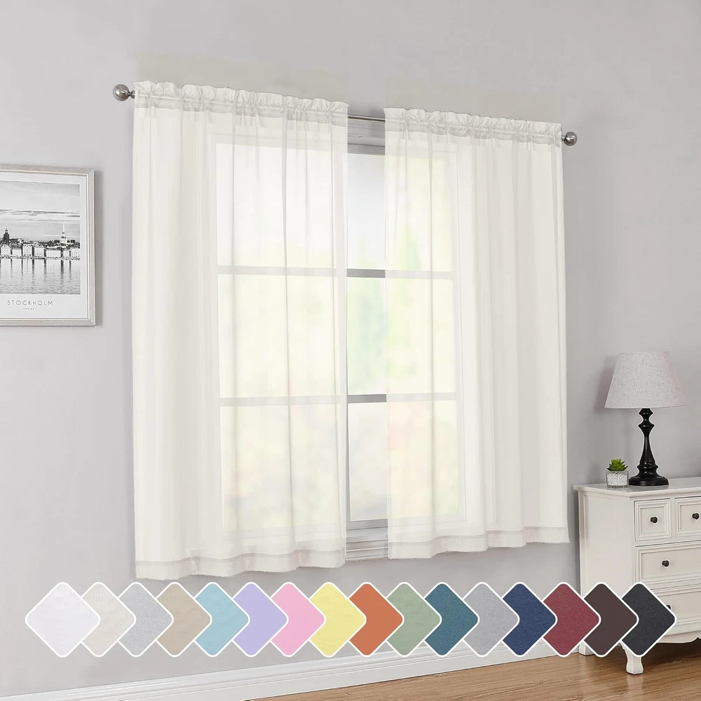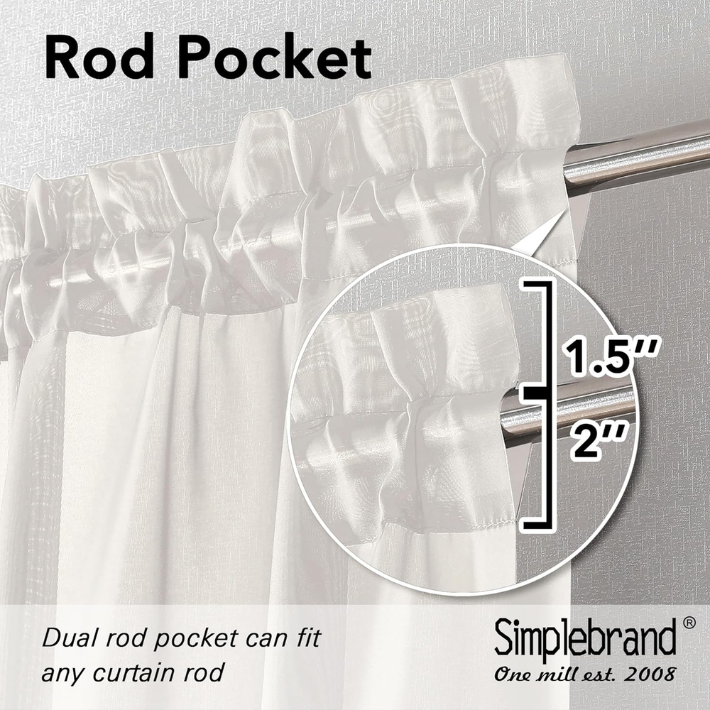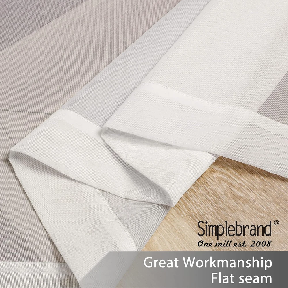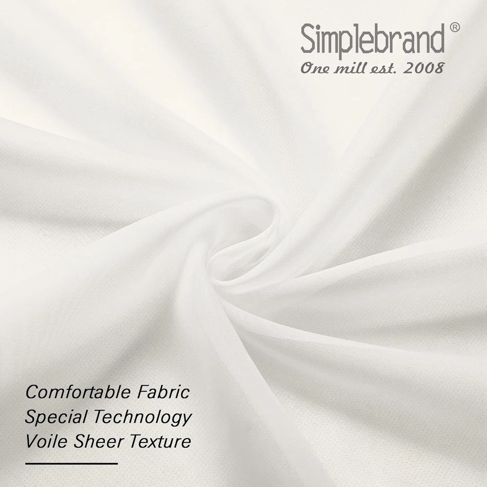 Basic Information: Each panel measures 42 inch wide by 45 inch long (1.5" header not include). Total of two (2) panels - 84" inch Wide x 45" inch long with top dual rod pockets design, makes the ivory sheer curtains appears more beautiful and vivid. It can be used alone or as an added layering piece for added privacy or a more lush look. High-Grade Material: Sheer curtains are made of 100% Polyester with neat stitching. Clean selvedge without extra threads. Very soft, and environmentally friendly is the most classic room decoration curtains & drapes, making your home look more elegant. Through open, half-open, tie-up or close the curtain, you can adjust how much light gets through a soft airy sheer curtain and lighten up the room. Light Filtering & Breathable: Simplebrand curtains sheer are great "light filter". On the basis of excellent air permeability, which is effectively softening the room light. Allowing natural light flowing into your room, while still providing privacy, give you light & airy feel, for living room, bedroom, yard, patio, villa, parlor, giving you a warm and comfortable living environment. Easy to Install & Decorate: Top dual rod pockets design, 2 inch wide rod pocket design makes this light curtains easier to hang and slide to accommodate more sizes of curtain rods. Also the bottom 2 inch pocket allows you to install bottom curtain rods as you need. Care Instructions: Machine wash cold, Gentle Cycle. Use only non-chlorine. Bleach as needed. Tumble Dry Low. Iron on lowest setting as needed. Sheer curtains that dry quickly compared to other type of fabrics for a hassle-free usage every day. Refreshed after washing, the bright colors bring charm and modernity to your interior. Product description 1 Soft Voile Textured 2 Light Filtering 3 Elegant Style 4 Hanging Options The video showcases the product in use. The video guides you through product setup. The video compares multiple products. The video shows the product being unpacked. hero-video Merchant Video Simplebrand Sheer Curtains Add to Cart Customer Reviews 4.7 out of 5 stars 7,560 4.7 out of 5 stars 300 4.5 out of 5 stars 48 4.3 out of 5 stars 18 4.2 out of 5 stars 3 Price $8.07 $ 8 . 07 — — — — Material Polyester Polyester Polyester Polyester/Linen Polyester Opacity Level Sheer Sheer Light Filtering 100% Blackout 100% Blackout Top Design Rod Pocket Rod Pocket Rod Pocket Grommet Grommet Machine Wash ✔ ✔ ✔ ✔ ✔ characteristic Voile Jacquard Clipped 3D Embossed Linen Textured geometric Printed Applicable Bedroom, Living room and more. Bedroom, Living room and more. Bedroom, Living room and more. Bedroom, Living room and more. Bedroom, Living room and more.