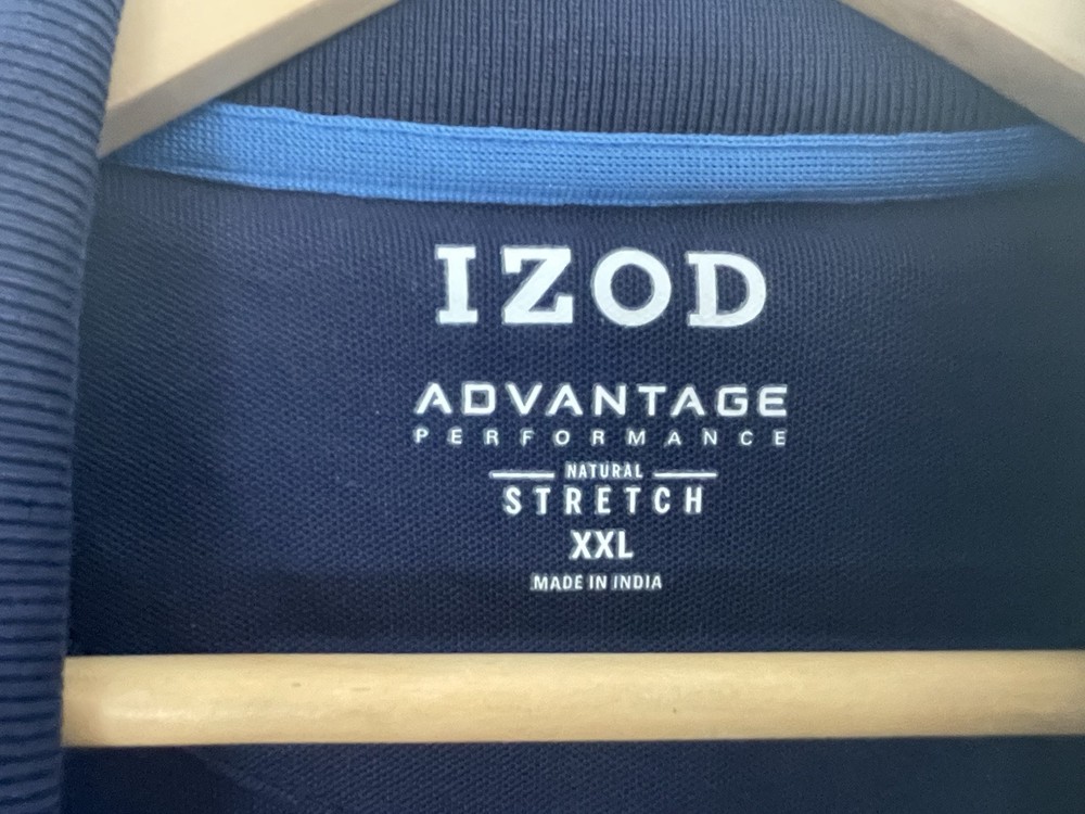 Izod Advantage Performance Natural Stretch Men's Polo Short Sleeve Shirt Navy XXL. Condition is pre-owned. Smoke free, pet free home. Shipped via USPS Ground Advantage. In good condition. There is a stain on the front. Free of rips.