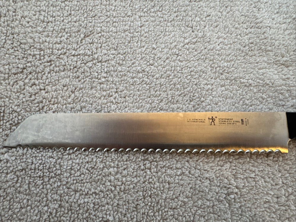 This knife is sharp, gently used, excellent condition. No signs of abuse, misuse, chips, cracked etc. This J A Henckels bread knife is a top-quality stainless steel serrated knife. It is the perfect addition to any kitchen and is great for cutting through bread and other baked goods with ease. The knife is part of the J A Henckels brand, which is known for producing high-quality kitchen products. The knife is an excellent choice for anyone looking for a reliable and durable serrated knife that is made in Germany. Its sharp serrated edge makes it easy to cut through even the toughest of bread and other baked goods. This knife is a must-have for any kitchen and is sure to become a favorite.
