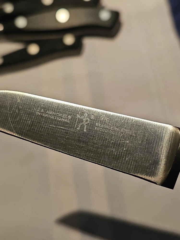 This is a J.A. Henckels International 6-piece knife set from the 19000 series, made in Spain. The knives have black composite handles and are crafted from stainless steel.