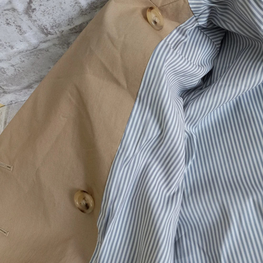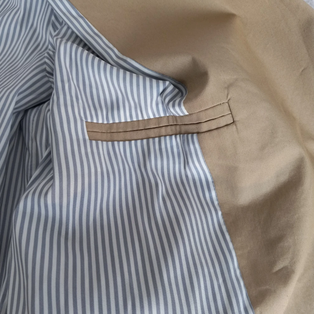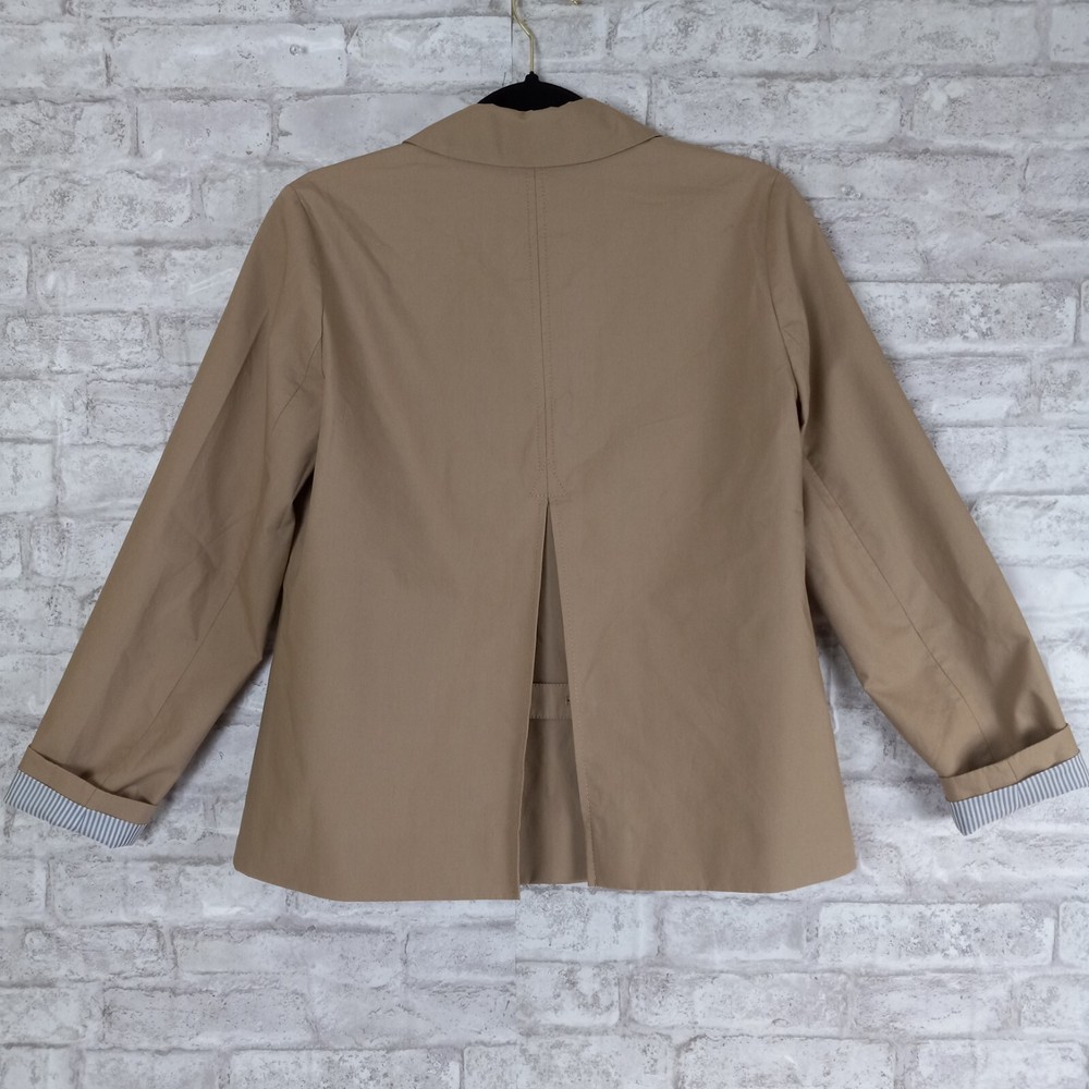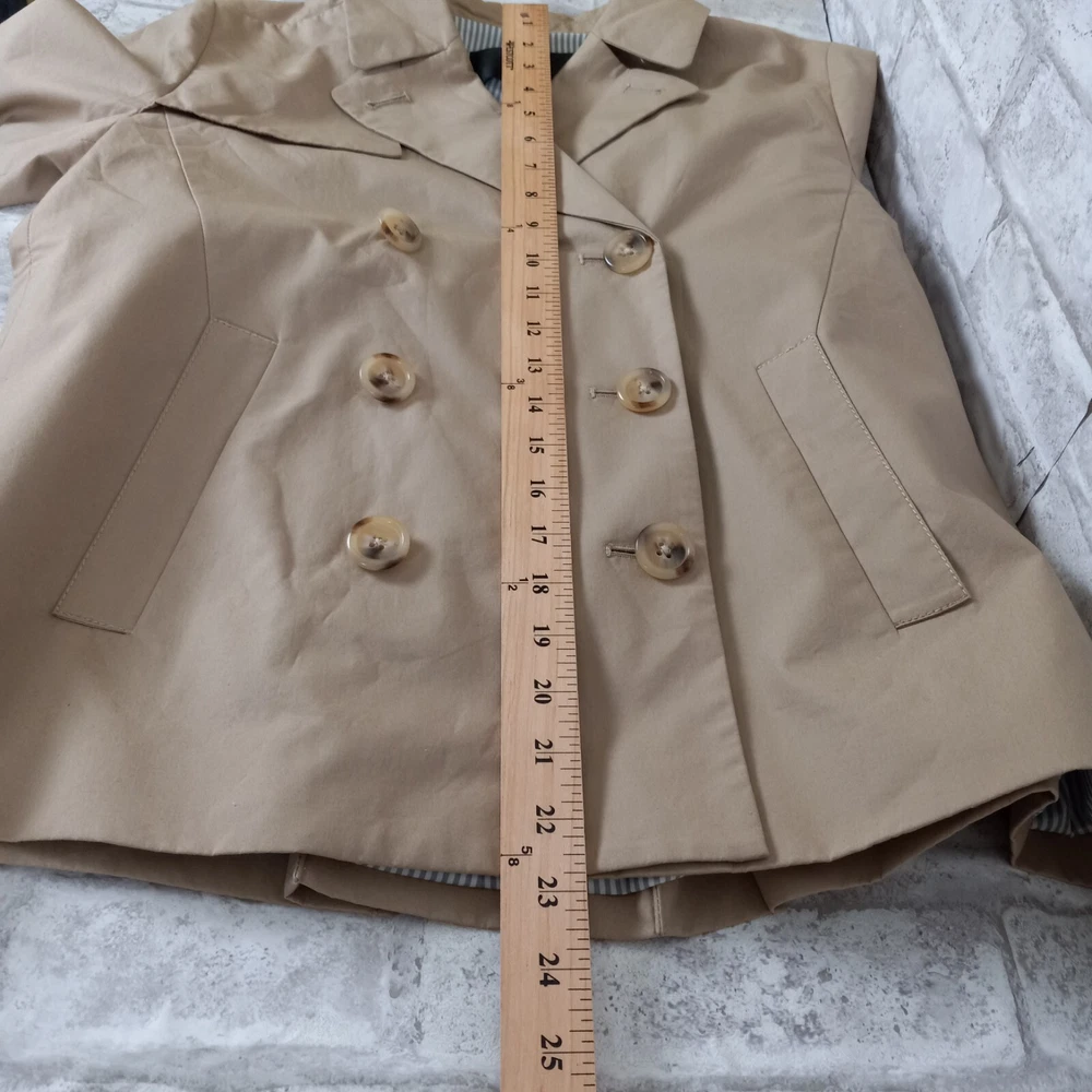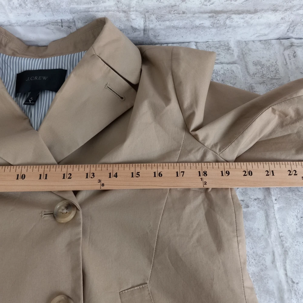 Crafted for the modern professional, this J.Crew Double Breasted Blazer is a versatile addition to your wardrobe. The classic tan color and solid pattern make it an ideal choice for business meetings, travel, or casual office wear. Its short jacket/coat length paired with a three-button front style offers a sleek, tailored fit that flatters a size 4 frame. Functionality meets style with features like a fully lined striped interior with 100% polyester lining for comfort, convenient pockets for essentials, and a touch of stretch for ease of movement. Whether you're dressing for fall, spring, or winter, this blazer is machine washable and ready to complement your everyday and career ensembles.