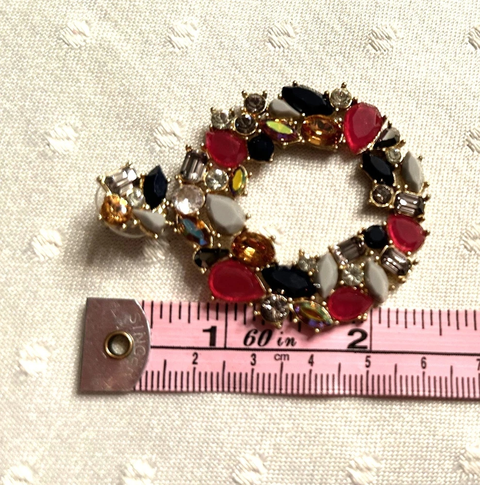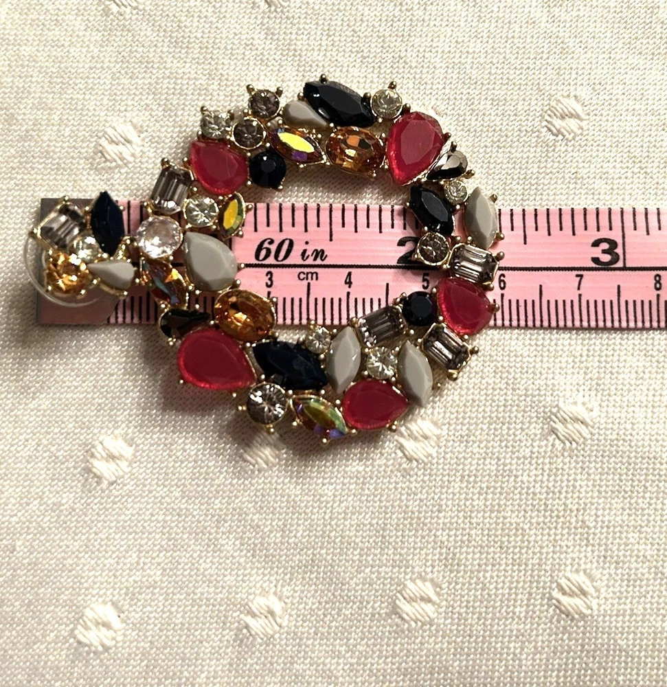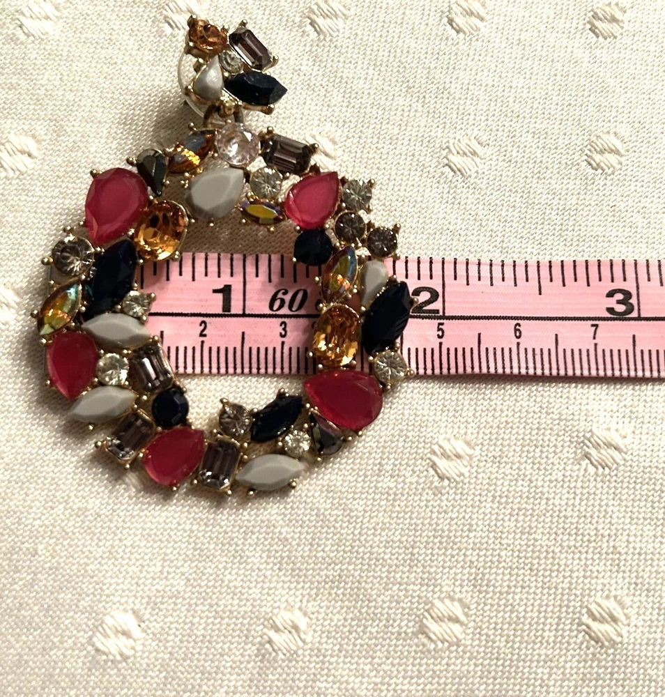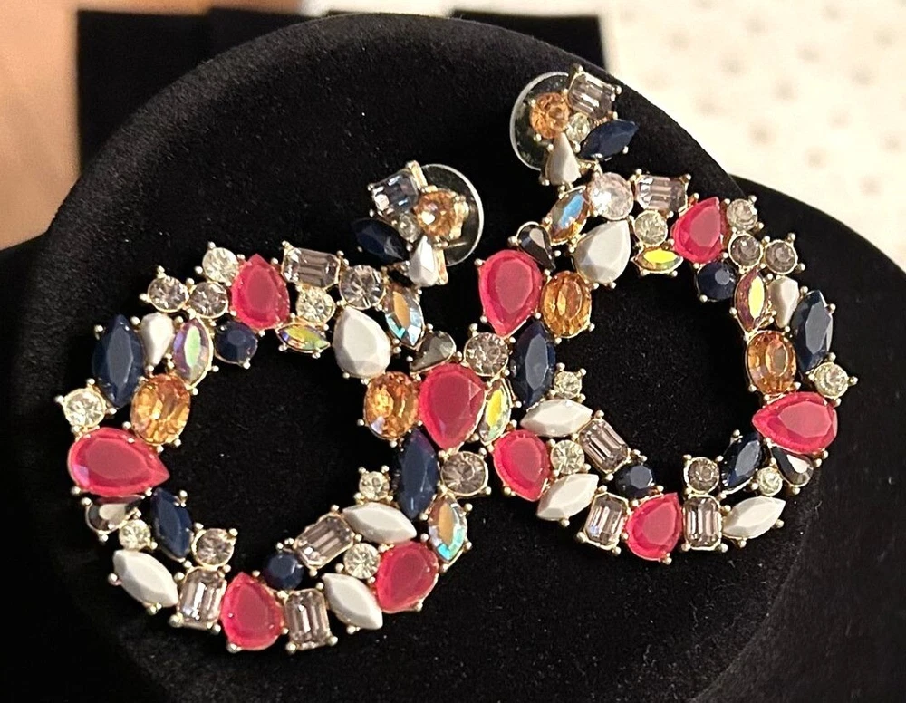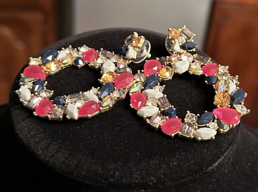 In a whimsical dance of colors, these J. Crew earrings capture the essence of a blooming garden or holiday wreath. Rhinestones and Lucite shapes form a wreath-like hoop, radiating charm and sophistication. The vibrant hues add a playful twist to any ensemble, making them a delightful treasure in any jewelry collection. • Dangle style earrings • Butterfly back closures • Multi-colored rhinestones and Lucite accents • Gold-tone base • Lightweight for comfortable wear Lovely Gold-tone backs and posts. One replaced rhinestone. Top to bottom = 2,5 inches, width = 2 inches.