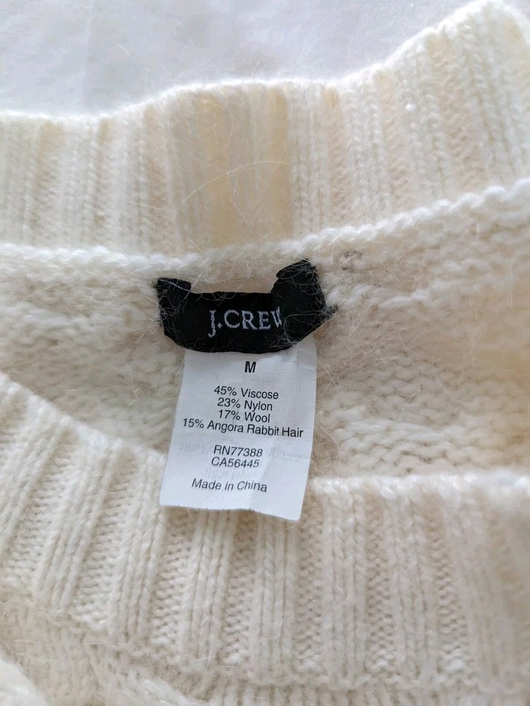 Crafted for comfort and style, the J.Crew Honey Comb Cable Sweater is a chic addition to any wardrobe. Its classic cream hue and solid pattern make it a versatile piece, perfect for layering during the cooler months of fall and winter. The breathable blend of angora, viscose, and wool ensures warmth without the weight. This pullover sweater features a cozy crew neck and long sleeves with a distinctive cable-knit design, embodying a timeless fisherman theme. Preshrunk for ideal fit, it comes in a medium size and is designed to offer a regular fit for women. Whether you're out for a casual outing or enjoying a laid-back day, this sweater's preppy charm will keep you snug and stylish.