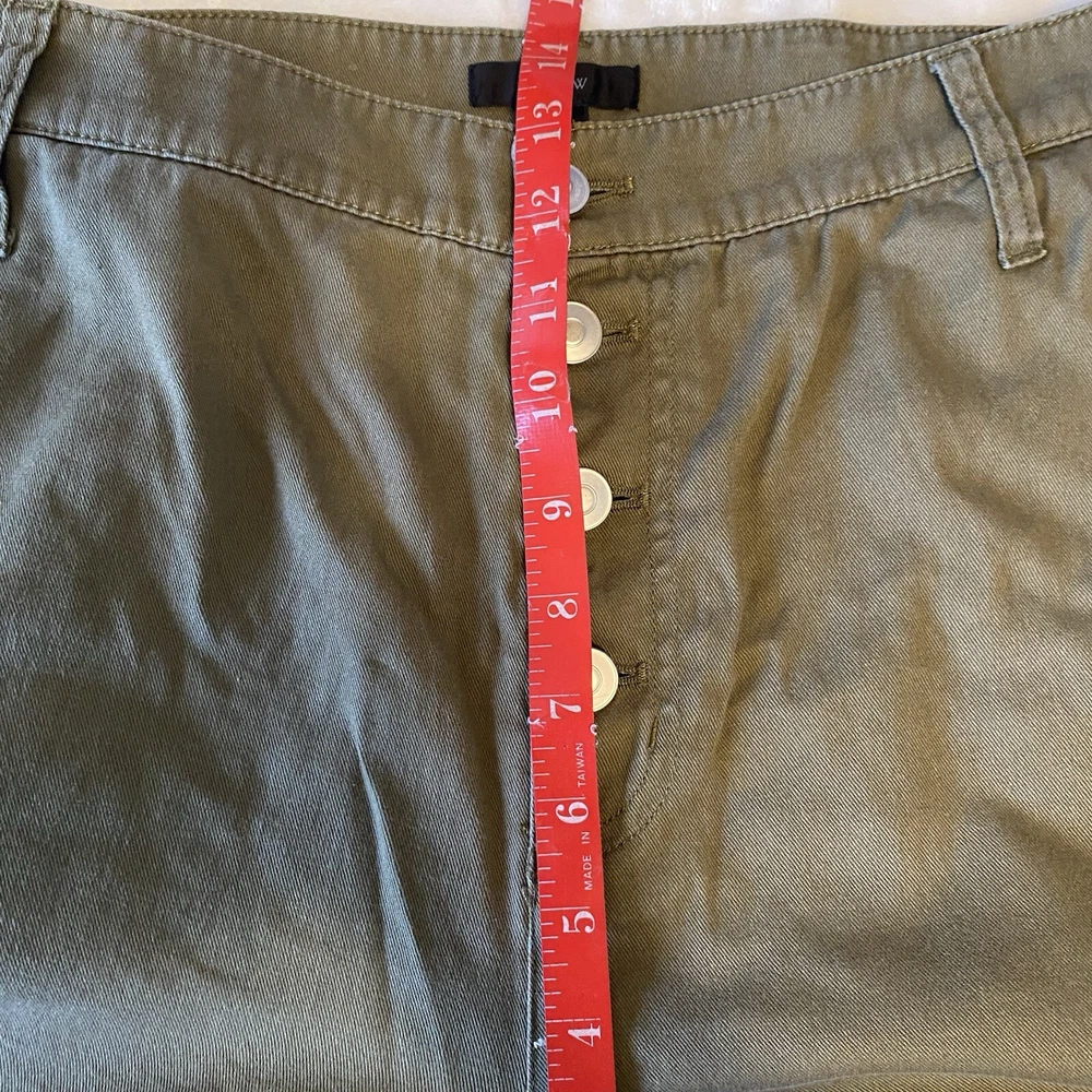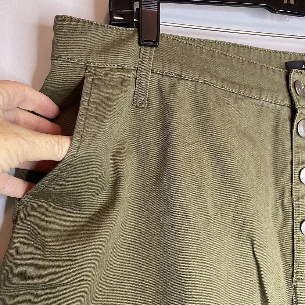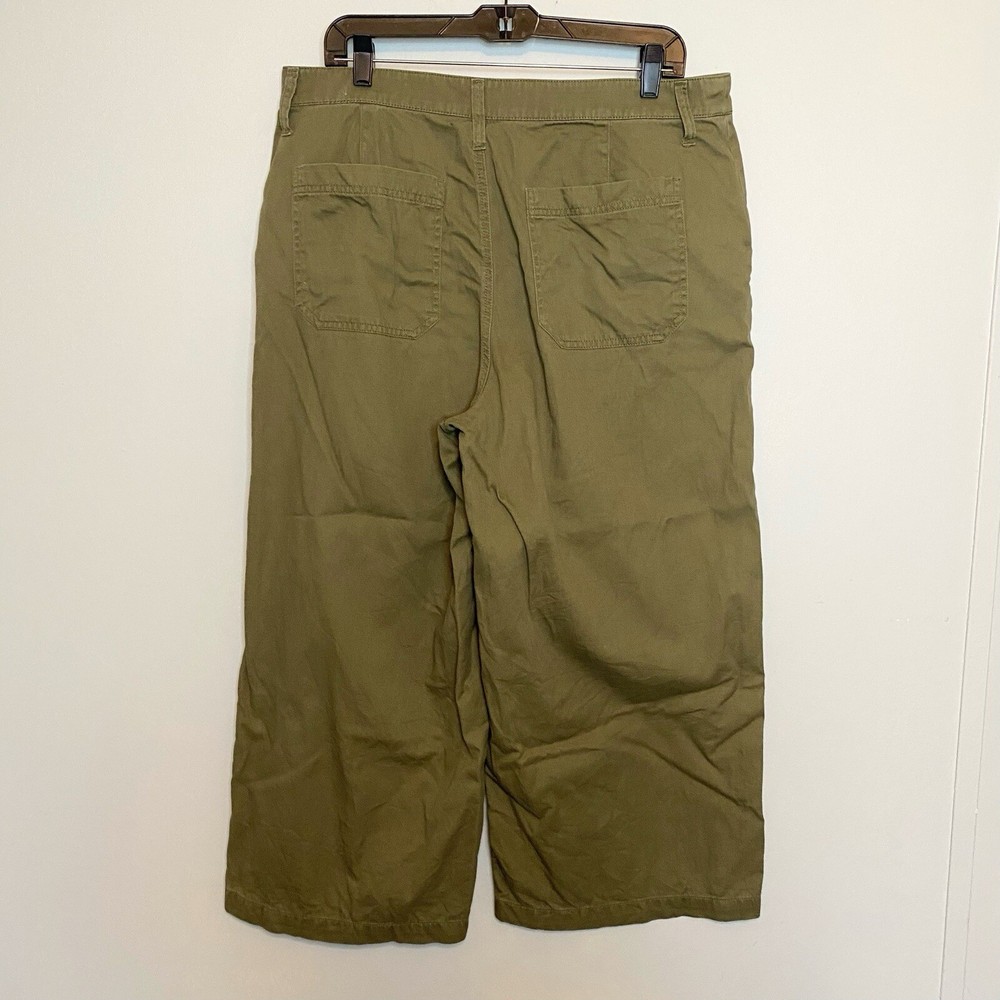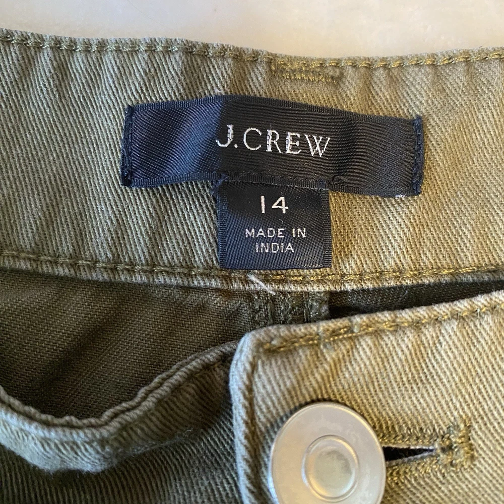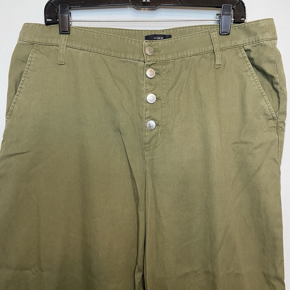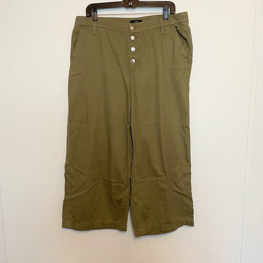 J Crew Crop Wide Leg Button Fly Pants Olive green color Size 14 measures about 18” across the waist and 24” inseam Cute wide leg twill pants feature a button fly and cropped silhouette for trendy style. - Button fly and closure - 4-pocket style - Solid color - Wide leg - Twill construction - Cropped - Approx. 13” rise Fiber Content 100% cotton Care Machine wash cold Excellent condition Smoke free Fast shipping