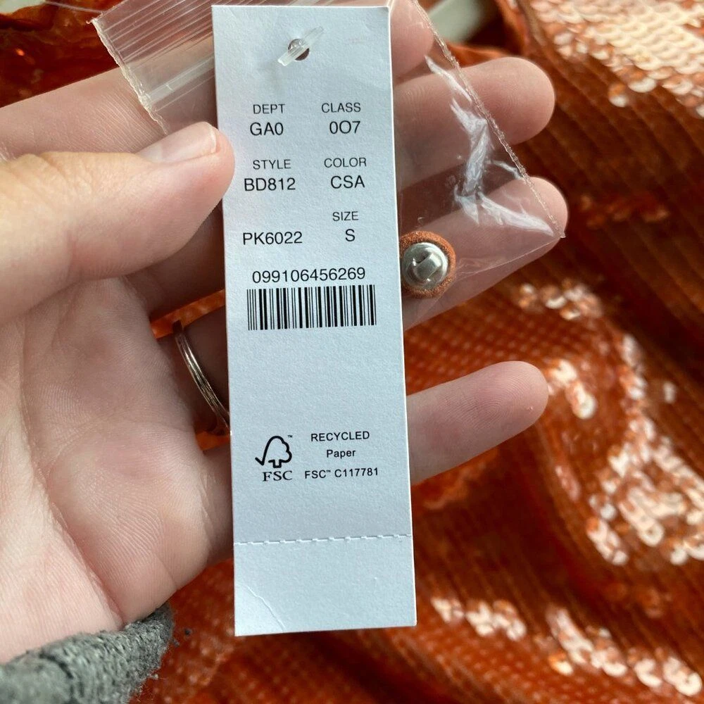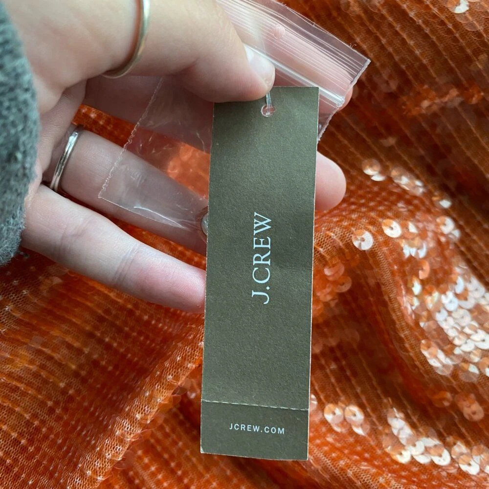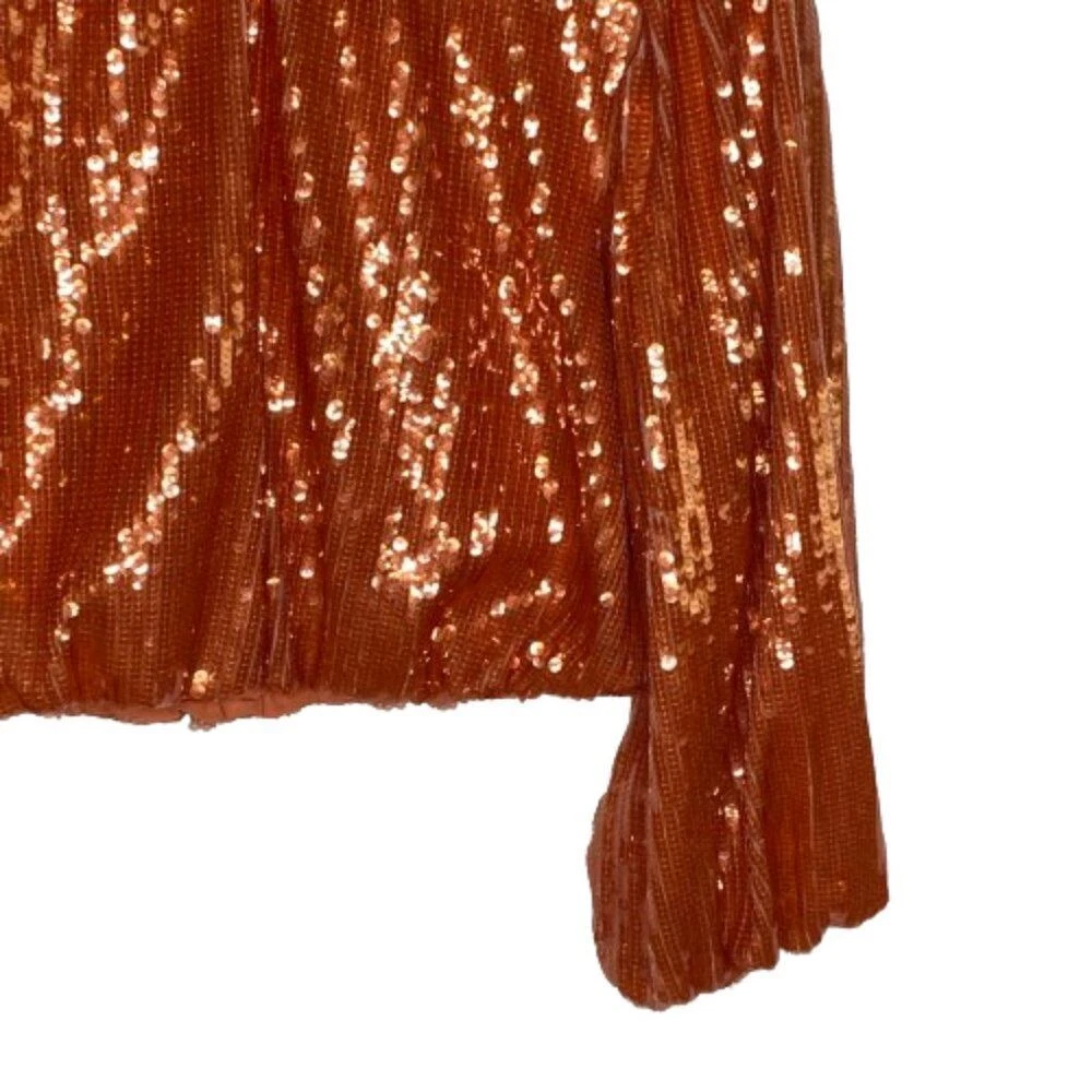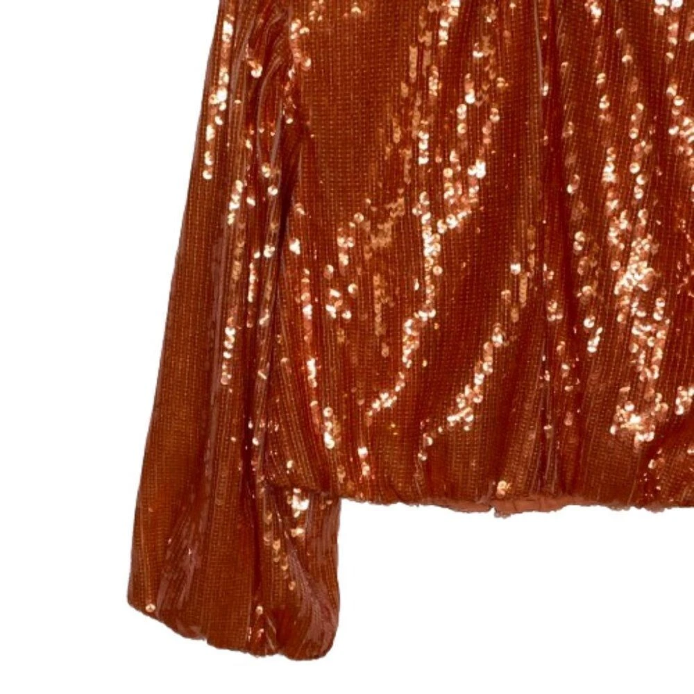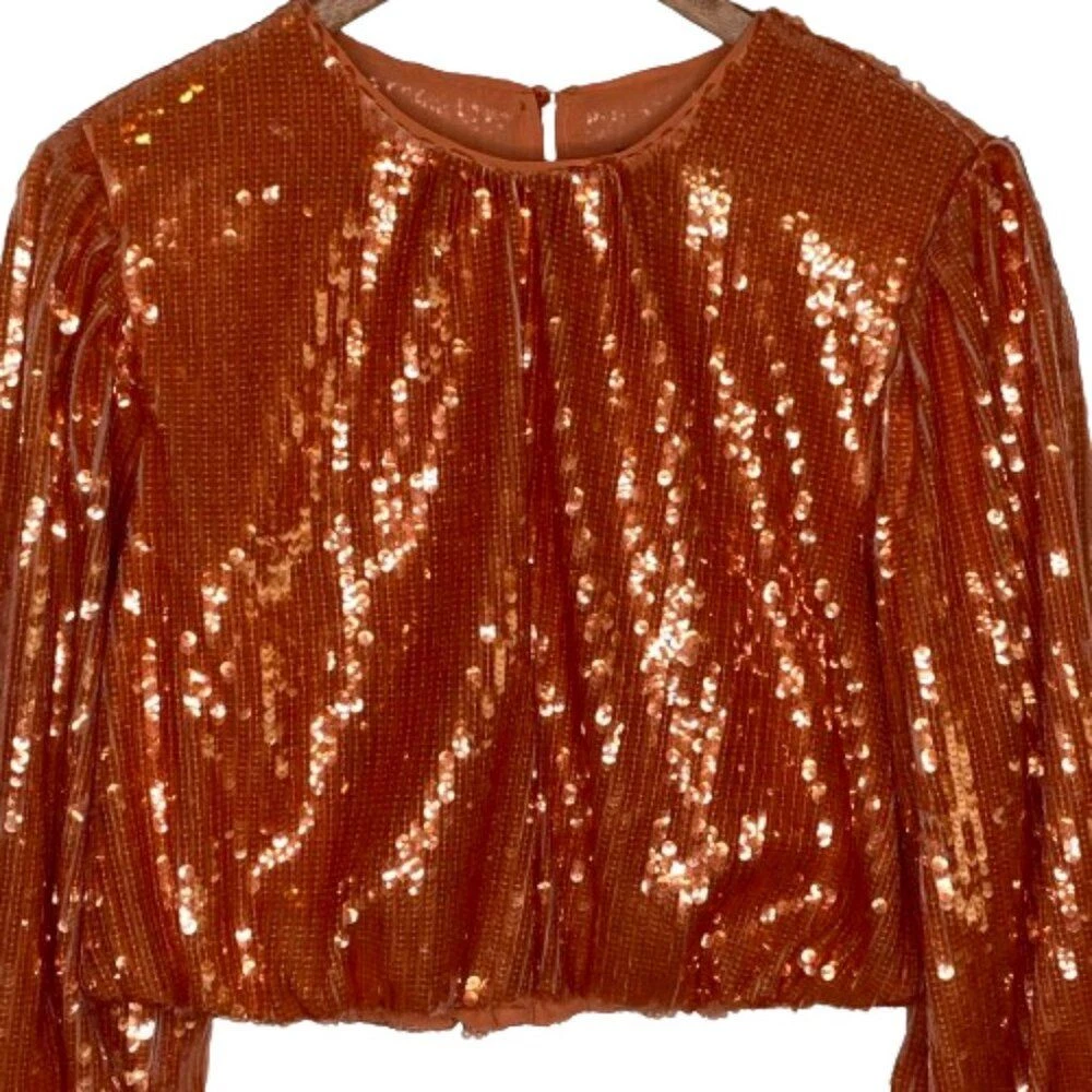 New With Tags Did notice a few sequins that are broken in half, but does not really affect the look of the top Pullover style with back keyhole button closure Bubble long sleeves with elastic cuffs Round neckline Blouson cropped elastic hem Fully lined 100% polyester Machine washable Approximate flat lay measurements: Shoulder to bottom hem length - 18" Pit to pit width - 19" Please compare measurements to something you already own to verify size and fit We are happy to answer any questions! We ship the next business day!