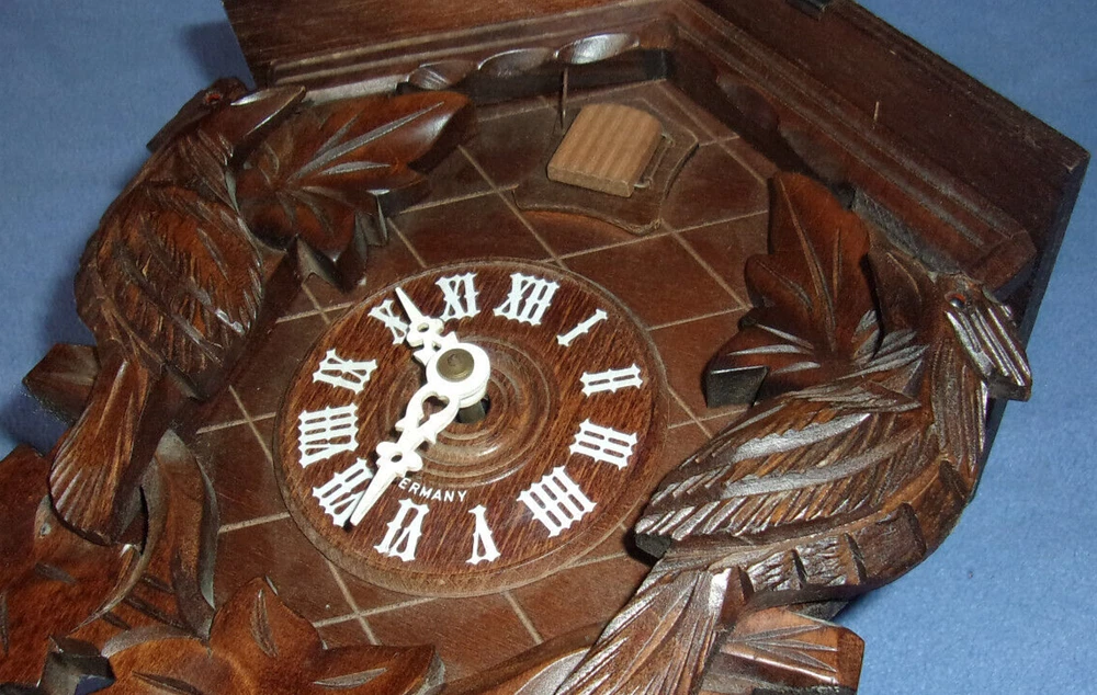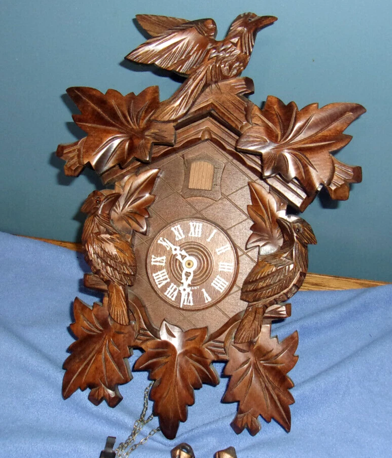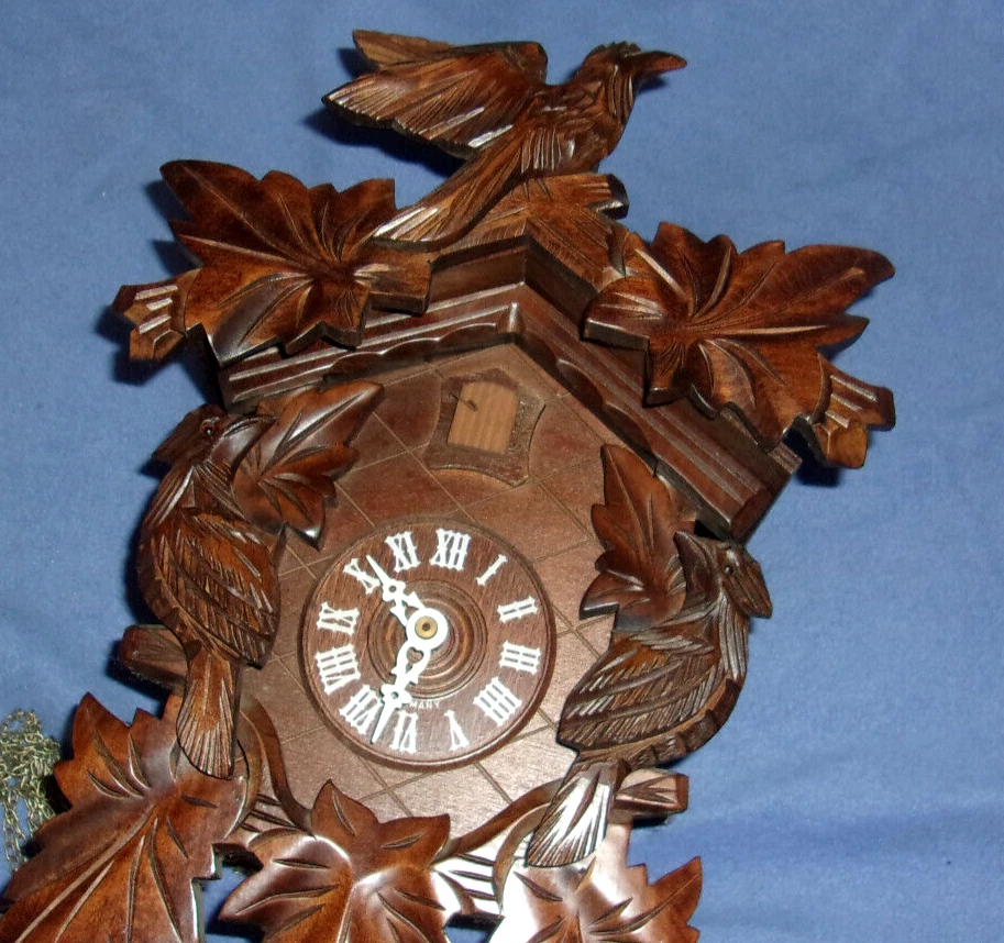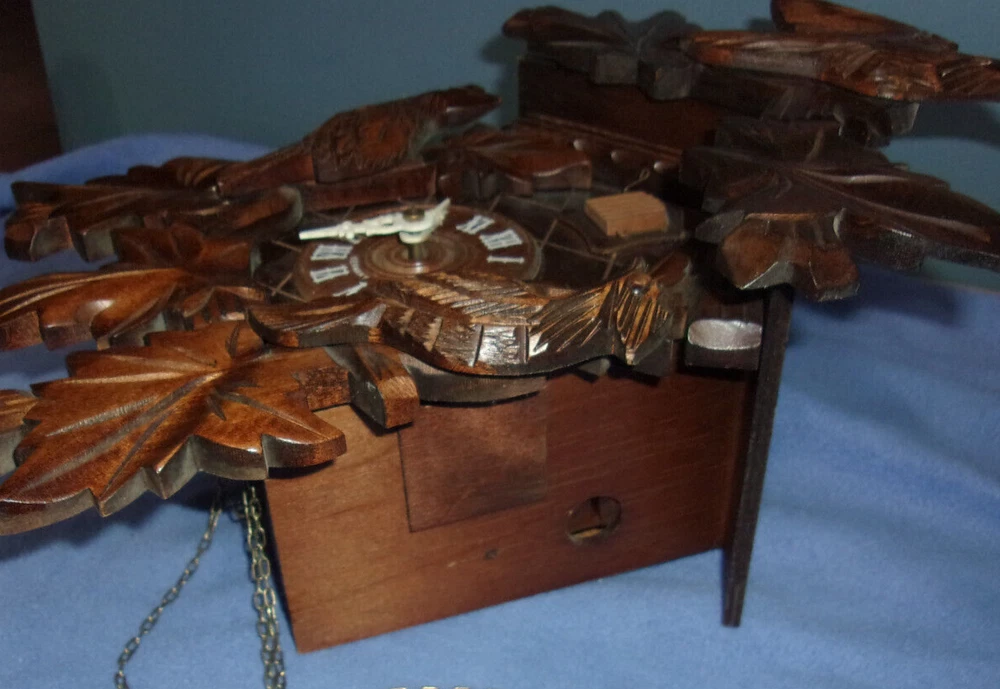 THIS AUCTION IS FOR A VINTAGE J. ENGSTLER BLACK FOREST GERMAN CUCKOO CLOCK NO. 859 THIS IS A USED ITEM IN VERY GOOD COSMETIC CONDITION BEING SOLD AS IS UNTESTED, NOT SURE IT RUNS - PLEASE SEE FULL DESCRIPTION: CLOCK HANDS ARE COMPLETE AND INTACT COMES WITH 2 CAST IRON PINE CONE WEIGHTS - EACH MEASURES APPROX. 4-1/2" THE CLOCK BODY MEASURES APPROX. 7" X 5" 3 BEAUTIFULLY HAND CARVED BIRDS WITH BEADED EYES ALL THE CLOCK NUMBERS ARE INTACT WILL NEED A LIGHT CLEANING SOME DUST IN CREVICES MECHANISM IS CLEAN CUCKOO DOOR AND BIRD IS INTACT BELLOWS ARE INTACT REAR DOOR AND SPRING ARE INTACT TOTAL CLOCK SIZE FROM ROOF PEAK TO BOTTOM LEAF IS APPROX. 11" THIS HAS BEEN ON WALL DISPLAY FOR YEARS , WE HAVEN'T HAD IT RUNNING IN MANY YEARS , DISPLAYS GREAT - SOLD UNTESTED SEVERAL MARKINGS ON MECHANISM AS FOLLOWS: SYNT. OIL , CLOCK 859 G.M. 1884288 , 1692176 25-J MADE IN GERMANY NO (O) JEWELS J. ENGSTLER VS - VILLIGEN REGULA Sign up for my newsletter by adding my eBay Store to your Favorites Surf our store for all kinds of great vintage novelty toys, comics and unusual items ! . . To save you money- we will combine shipping on all multiple item purchases. Please ask for a combined shipping invoice.. For more details on our policies please visit our e-bay store policies pages. . INTERNATIONAL INSURANCE: Insurance is now included on most International orders. Please see our e-bay store shipping policy page for country exclusions. . International Buyers: Import duties, taxes and charges are the buyers responsibility and are not included in the price or the shipping charge. Please check with your country's customs office prior to bidding/buying to determine what these additional charges may be. . We promise your satisfaction in every sale , Buy with confidence !!