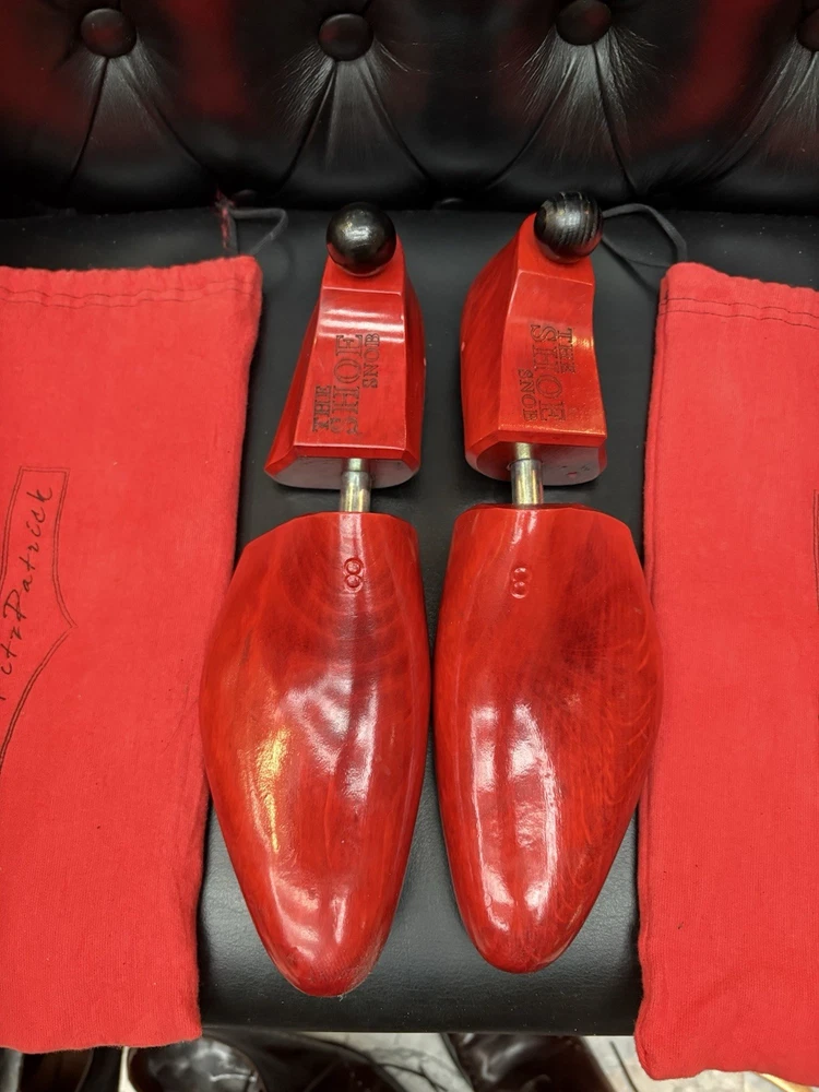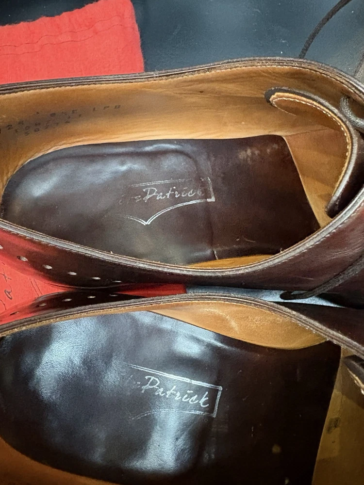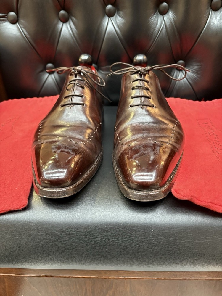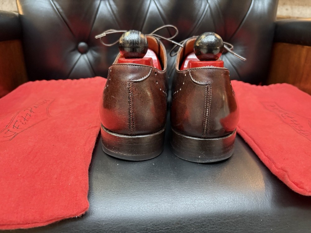 J Fitzpatrick Mens dark brown wholecut Oxford shoes in UK size 8.5, EU size 42.5, US size 9.5. E width fitting. These shoes have had a vibram rubber sole and steel toe plates added to the soles. They come with red 'shoe snob' shoe trees UK size 8 and red J Fitzpatrick dust bags.