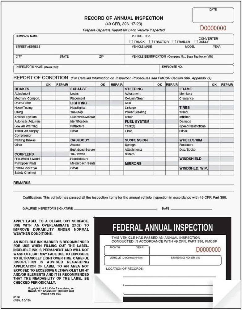 FOR YOU J. J. Keller 100-Pack, Record of Annual Inspection Form with Inspection Decal, 2-Ply Carbonless Form, DOT Compliant FEATURES Avoid fines while keeping you, your workers, vehicles, and highways safe and compliant! Reduce the stress of unwanted fines and penalties with these DOT annual inspection forms and decals. High-Quality, two-plies DOT inspection forms are carbonless in a continuous format. Durable forms reduce risk of fading over time. Forms and decals with consecutively numbered. Measures: 9 1/2” x 11”. Fade Resistant Inspection Decals are included. Annual inspection form and decal are consecutively numbered. No loss of important data with markings that are permanent and do not fade in sunlight or wash off. Comply with DOT Regulations. AVIR forms meet DOT annual vehicle inspection requirements under 49 CFR Section 396.21. Annual vehicle inspection labels meet requirements under 49 CFR 396.17(c)(2). Provides full reporting on the 13 required inspection categories. 100-Pack. Includes (100) Record Annual Inspection Forms with black and white Inspection Decals. Made in the USA. Product description Buy Forms with Confidence from J. J. Keller An Industry Leader Since 1953 Keep your operation running smoothly – and ensure you’re in compliance with regulations and requirements – when you use J. J. Keller’s wide range of affordable safety and compliance forms. A Family-Run Business Our founder, Jack Keller, started J. J. Keller & Associates, Inc. in Neenah, Wisconsin, as a consulting firm to help trucking companies comply with complex regulations. That was 70 years ago. Today, President & CEO Rustin Keller is the third generation of the Keller family to lead the business, which has grown to support companies of all types and sizes. Trust Our Wide Range of Experts J. J. Keller’s team of regulatory experts continually monitors the requirements of 300+ North American agencies to ensure your forms meet all requirements. Business leaders in transportation, manufacturing and industrial, healthcare, utilities, construction, education rely on J. J. Keller. An Extensive Selection of Compliance Forms Annual Vehicle Inspection Drivers Inspection Log Books Driver qualification HR Forms Forklift & Equipment Checklists Easily Complete Annual Vehicle Inspections For 13 Required Categories These 2-ply carbonless forms help meet applicable DOT requirements in §396.17–§396.21, providing full reporting on the 13 required inspection categories. Easily adhere the label to the inspected vehicle for proof of annual inspection. Satisfy DOT’s annual vehicle inspection requirements Includes plenty of room for recording identification data and component conditions Includes Minimum Periodic Inspection Standards Durable 100 lb. manila ply Measures 8½” W x 11” L Item model number 3136 Number of Items 100 Color Black, White Is Discontinued By Manufacturer No Brand J. J. Keller & Associates, Inc. Material Paper, Plastic Material Type Paper, Plastic Manufacturer Part Number 3136 Item Weight 0.01 ounces Shape Rectangular Manufacturer J. J. Keller & Associates, Inc. Finish Type Painted Package Dimensions 14.02 x 10.63 x 0.63 inches Size 100-pack 10.63 inches x 14.02 inches x 0.63 inches. Weight: 0.01 oz PAYMENT We accept all payments via Ebay using Credit Cards , PAYPAL , Apple Pay and many others SHIPPING We are always working hard to ensure your package arrives as soon as possible. Please understand that some factors like weather, high postal traffic, and the performance of shipping companies are outside of our control. DELIVERY & RETURN POLICY We offer a 30-Day Return Policy on items in which you are not completely satisfied with. You have the option of a full-refund or an exchange of the item. No returns are available on items shipped outside of the USA. WELOCME TO BUY EZ Checks High Security Check Paper with Hologram & 20 Security Features | 500 S 128.89 USD 138.59 USD Free shipping 7% off Zzrywuty Money and Rent Receipt Book with Cardboard Insert,2-Part Carbonless,5.3 10.87 USD 11.44 USD Free shipping 5% off Money and Rent Receipt Book 2-Part Carbonless 7-5/8" X 11" Spiral Bound 200 Sets 11.89 USD 12.52 USD Free shipping 5% off 500 CMS 1500 Claim Forms, Current HCFA 02/2012 New Version Valid for HCFA 1500 C 36.57 USD 38.49 USD Free shipping 5% off Professional Money and Rent Receipt Book Two Part Carbonless Copy Spiral Bound(3 28.0 USD 29.47 USD Free shipping 5% off 12 Check Registers for Personal Checkbook - Checkbook Ledger Transaction Registe 10.86 USD 11.43 USD Free shipping 5% off 12 Pack Checkbook Register, Check Register Books for Personal and Work Use, Tran 8.07 USD 8.49 USD Free shipping 5% off 20 Pack Checkbook Register, Check Registers for Personal, Blank Ledger Transacti 9.49 USD 9.99 USD Free shipping 5% off Estate Planning Kit Includes Last Will and Estate Guide, POA, Living Will and Me 37.99 USD 39.99 USD Free shipping 5% off Nextdaylabels - CMS 1500 / HCFA 1500 Insurance Claim Forms - Laser/Ink-Jet Compa 37.57 USD 39.55 USD Free shipping 5% off