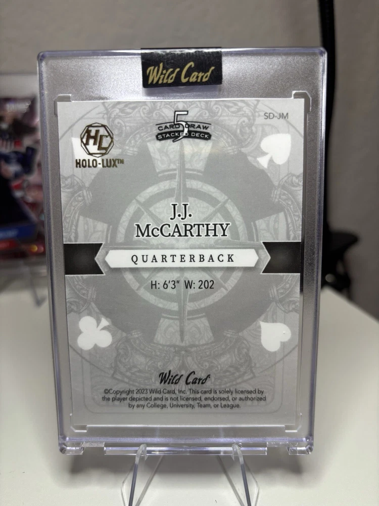 This is a rare and highly sought-after sports trading card featuring J J McCarthy, a talented player from the Michigan Wolverines and Minnesota Vikings teams. The card is from the 2023 Wild Card SP Promo set and has a print run of 1/1, making it a one-of-a-kind collector's item. In addition to its exclusivity, the card also boasts several impressive features, including being serial numbered, a short print, and a parallel/variety card. It's perfect for any football fan or sports trading card collector looking to add a unique and valuable piece to their collection. Don't miss out on this opportunity to own a piece of sports history!