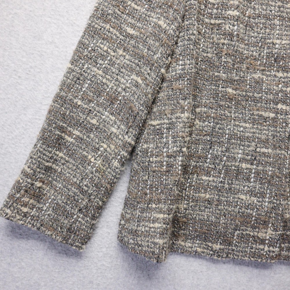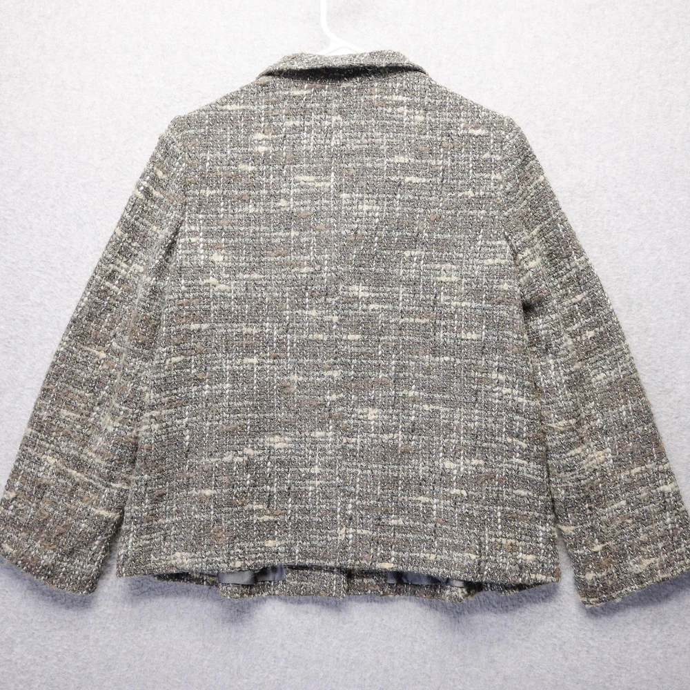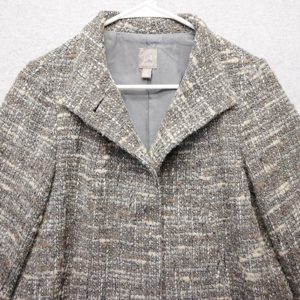 J Jill Jacket Womens Extra Small Petite Gray Wool Blend Tweed Button Up Coat with Pockets Condition: Gently worn, no visible flaws. Clean and well cared for, ready to wear. All buttons intact and pockets functional. Shell: 43% Wool, 25% Acrylic, 14% Viscose, 12% Polyester, 6% Polyamide Lining: 51% Acetate, 49% Nylon Color: Gray with natural beige and brown undertones, classic tweed pattern Button front closure with hidden buttons and high neck collar for added warmth Hidden front hand pockets for convenience Fully lined interior for comfort Tag size: XS Petite Made in Vietnam Professional dry clean only as recommended on care tag Perfect for business, office, or casual outerwear in cool weather Pre-Owned items can vary in size from the original tag. Please check photos of current measurements regarding exact sizing, and compare to your favorite items at home. All items are measured lying flat. EBay requires the title to reflect the original tag size. However, if an item has a significant difference in size between what the tag says and what my measurements show, I will put the current measurements in the item specifics. Before purchasing, please study the photos for anything you find unusual regarding the condition of the item. Send me a message and I will guide you. All pre-owned items have been recently laundered and stored in sealed bags to comply with eBay policy. Happy shopping and God Bless!