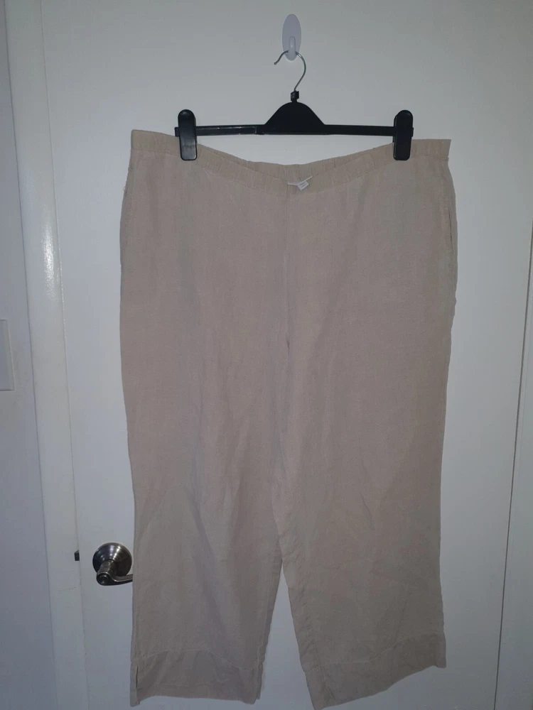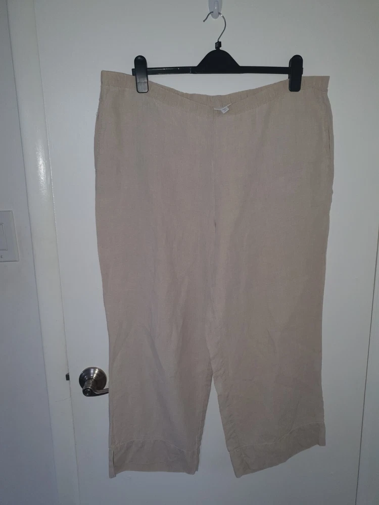 The J. Jill Pure Jill wide-leg pants are made of beige linen, featuring a solid pattern with a relaxed fit and elastic waist closure for comfort. These cropped pants in size L are designed for casual wear and travel, ideal for a nature-inspired, beachy, or hippie style. The canvas fabric adds a tropical vibe to the relaxed wide-leg design, making them a versatile and stylish addition to any woman's wardrobe.