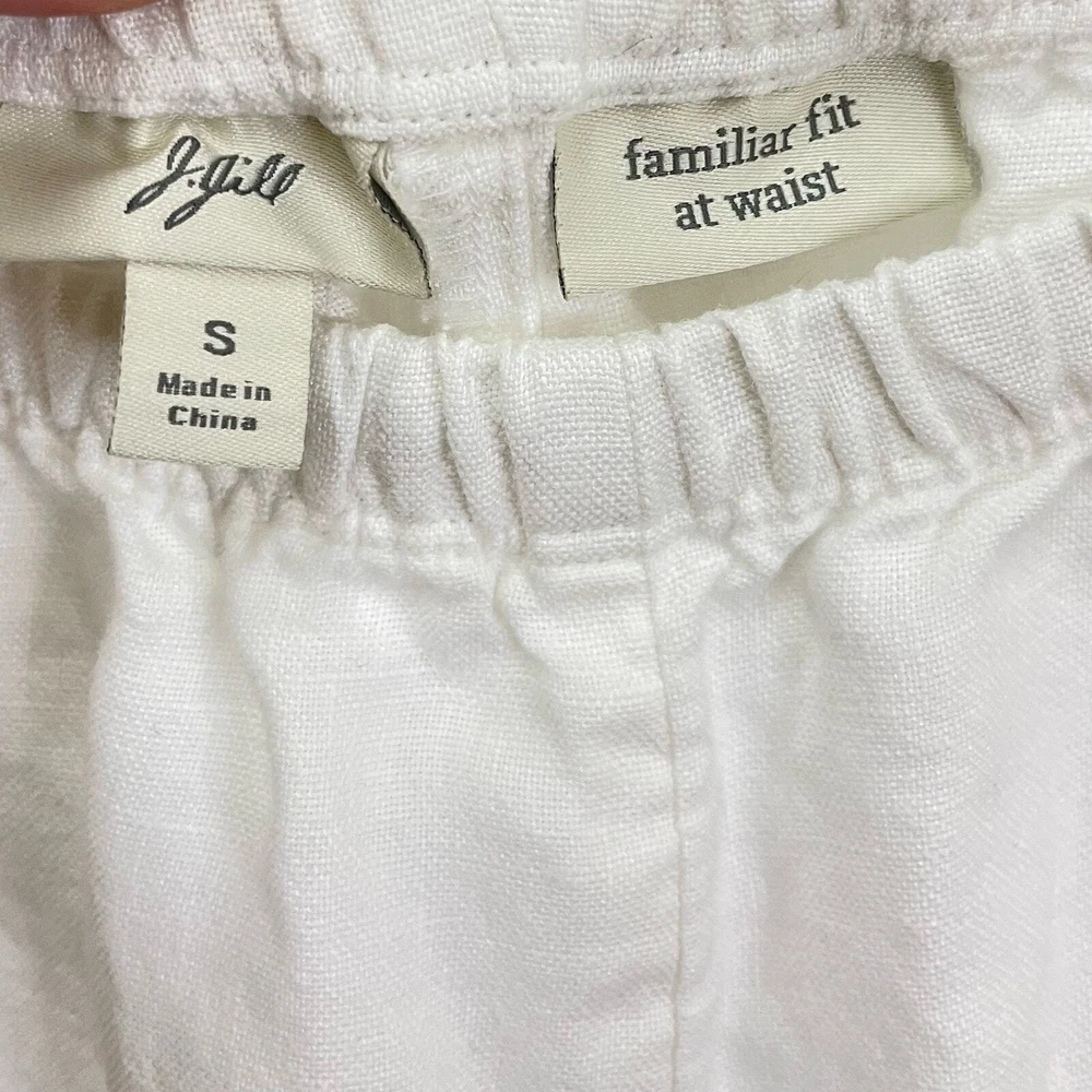 J. Jill White 100% Linen High Rise Elastic Waist Pull on Cropped Pants Familiar Fit at Waist 100% linen Semi sheer Elastic waist Pockets High rise Size small *Approximate measurements: Waist- 13.5" across Rise- 11" Inseam- 24" *Excellent preowned condition. One tiny blemish on pocket