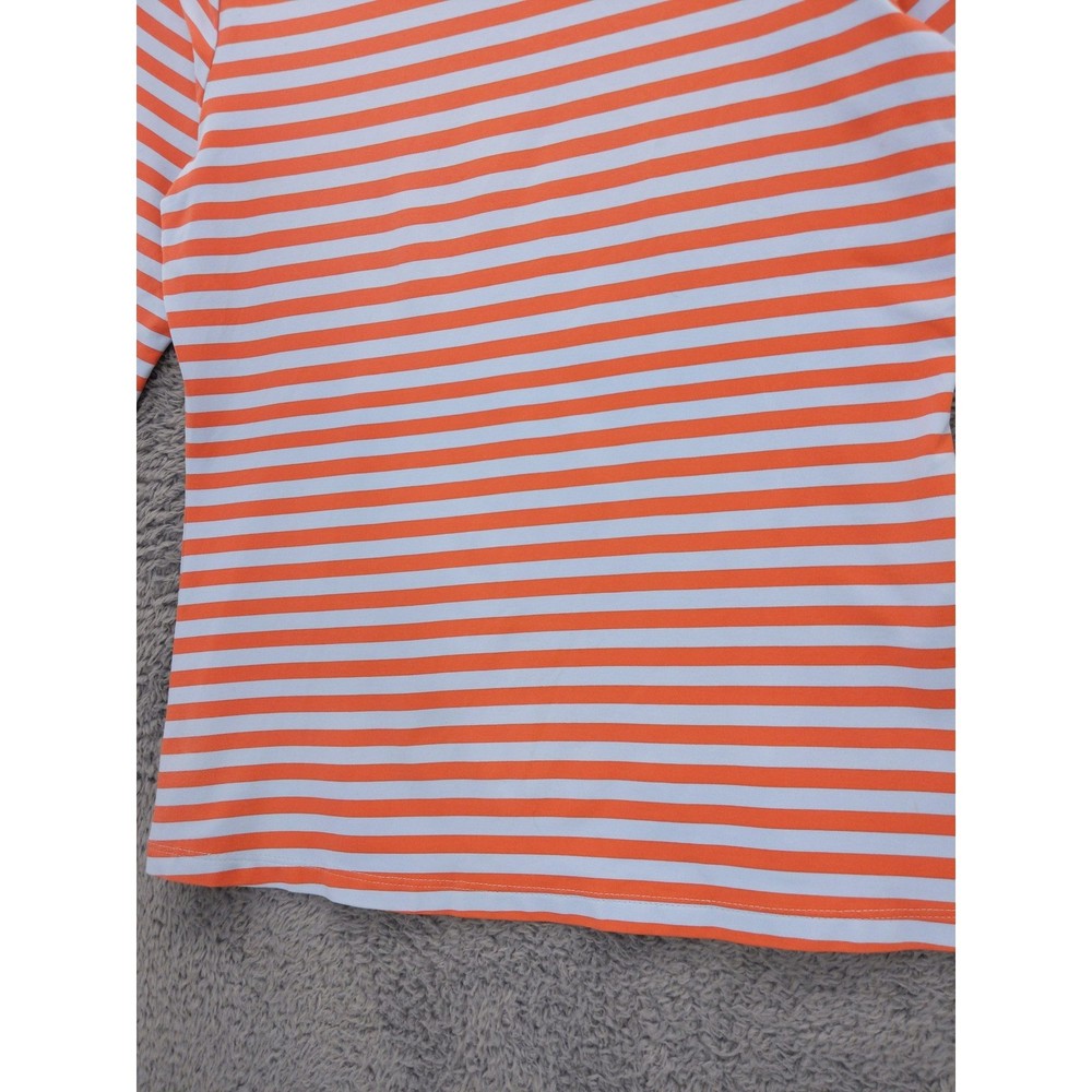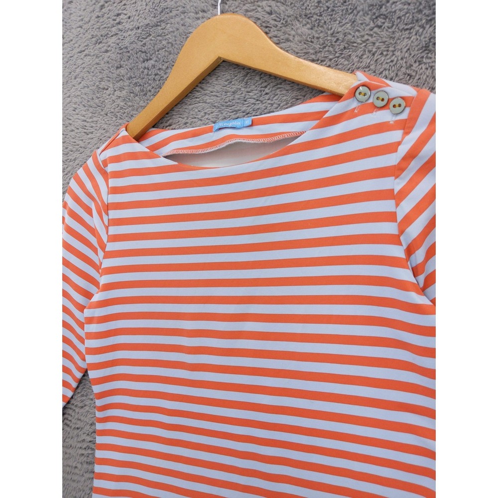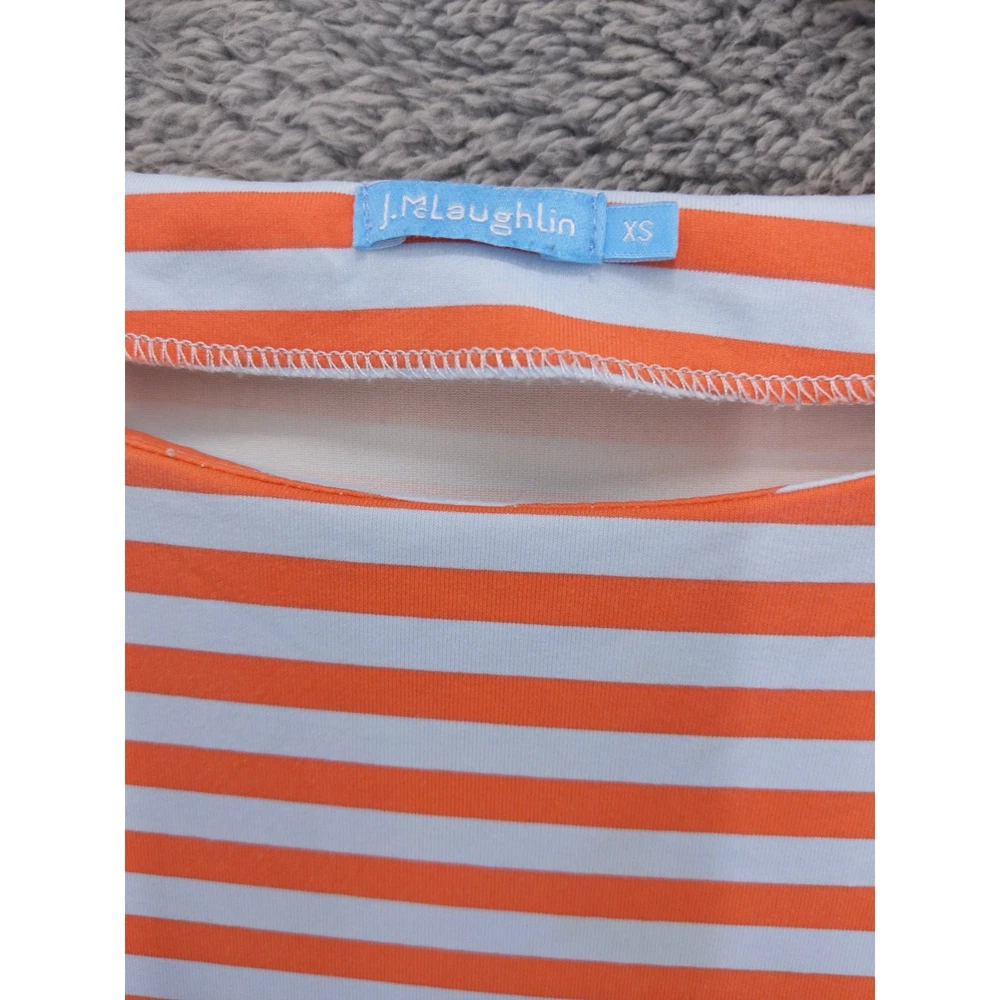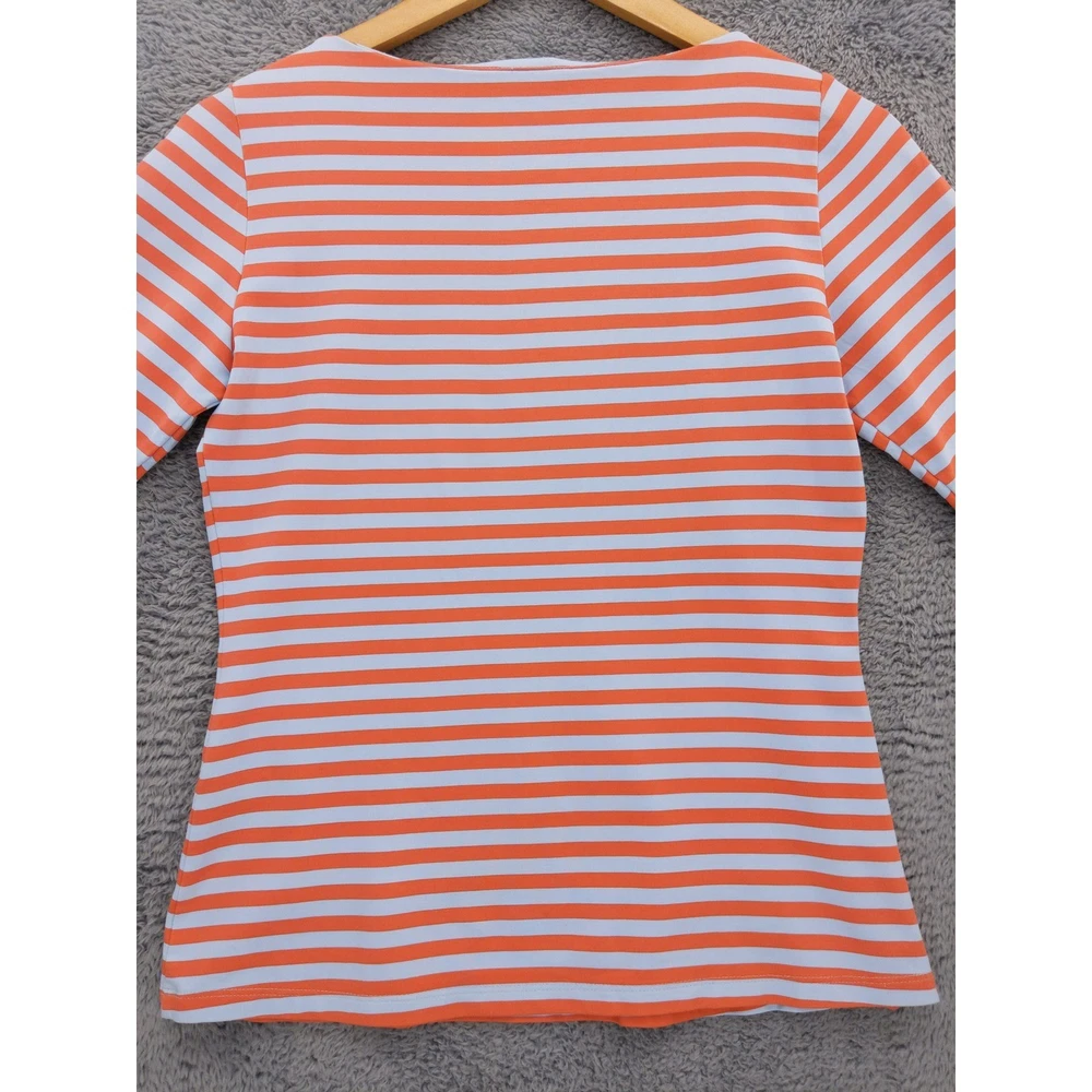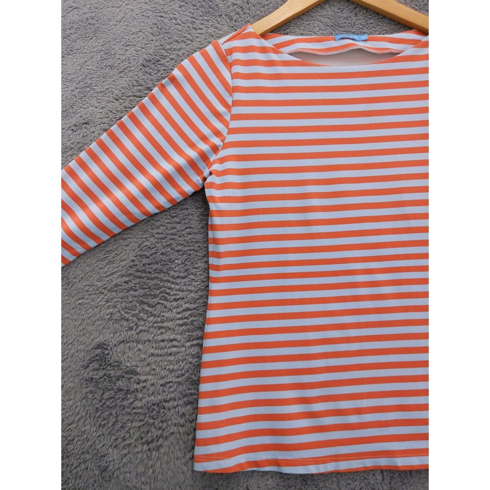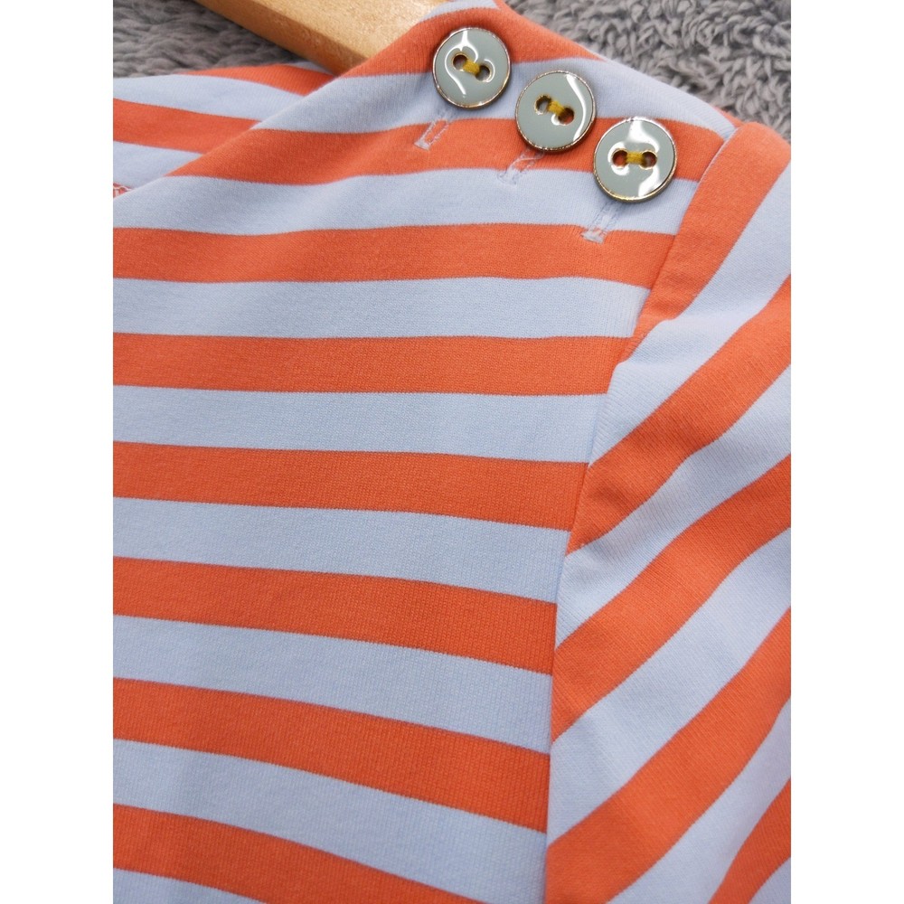 J McLaughlin orange and light blue striped boat neck top with 3/4 length sleeves. Features decorative button detailing on the left shoulder. Perfect for a casual day out or a relaxed weekend brunch. Measurements: • Chest Across - 17 in • Neck to Hem (Back) - 21 in Excellent used condition with no holes, tears, heavy wear, or stains.