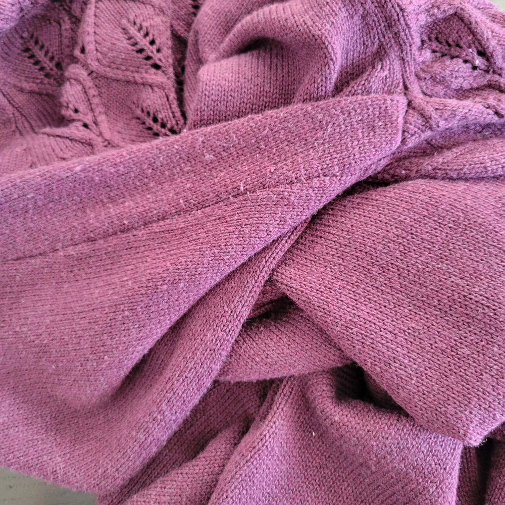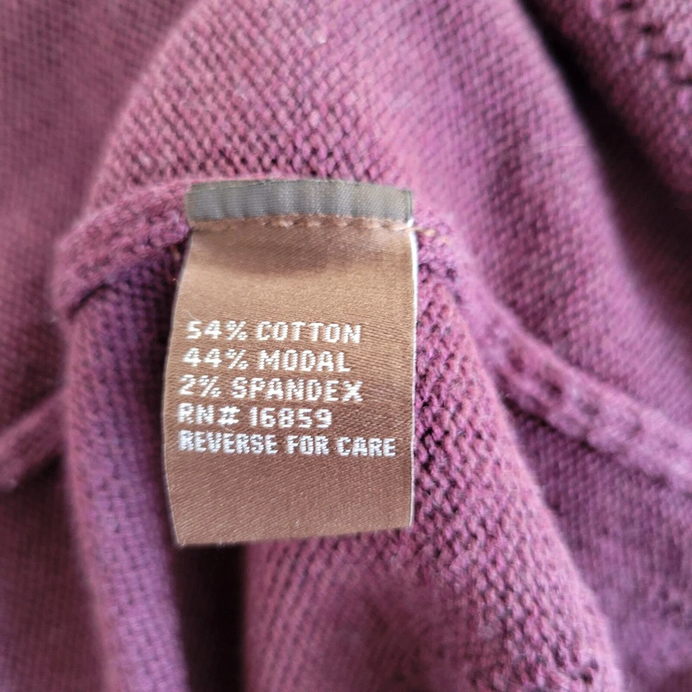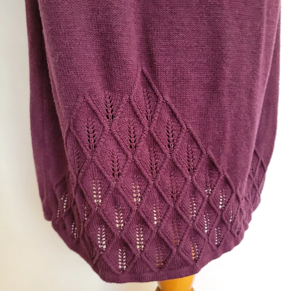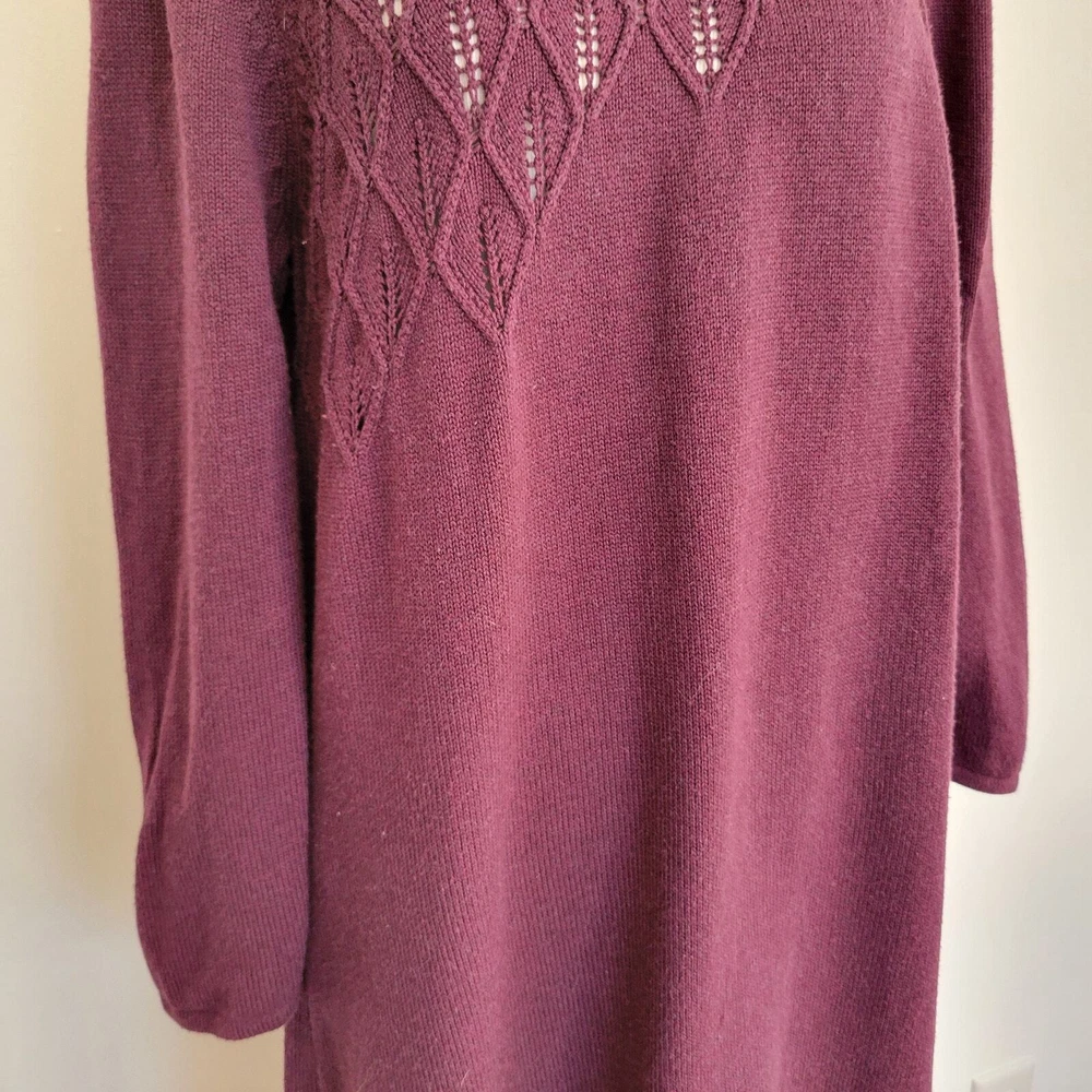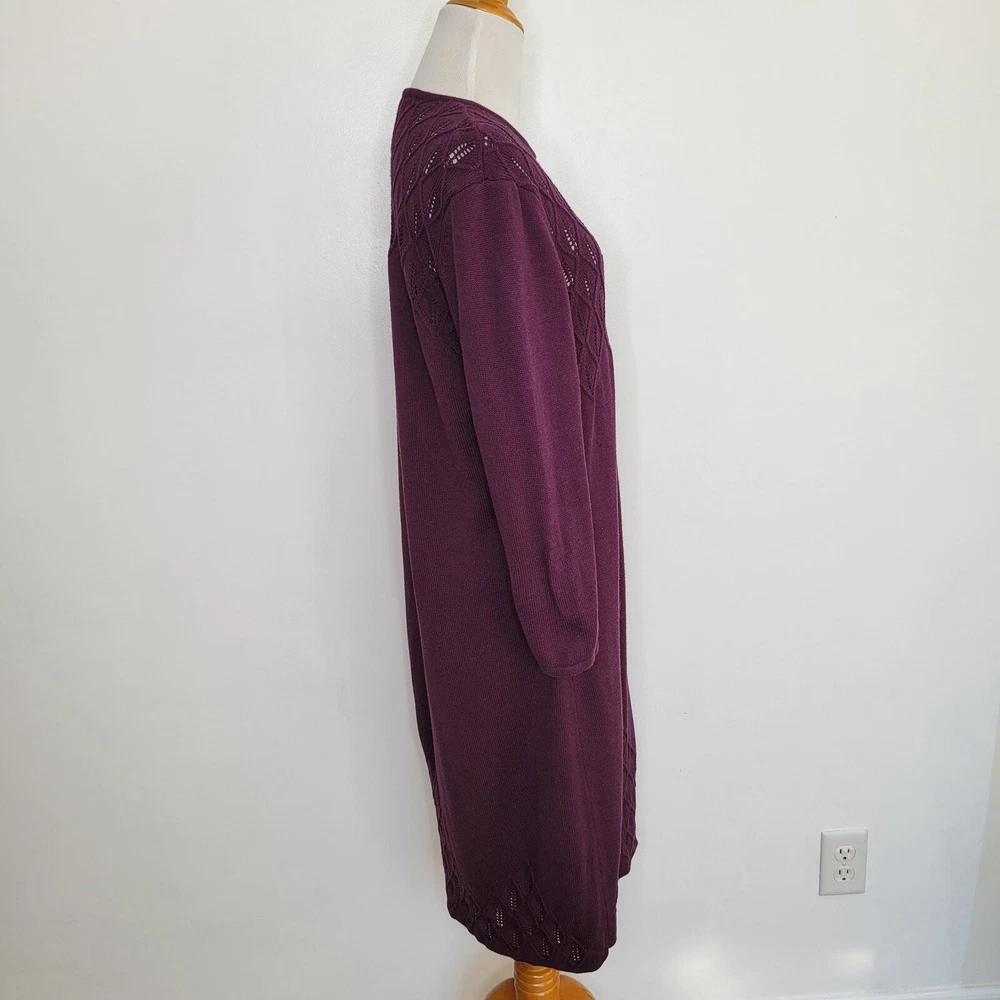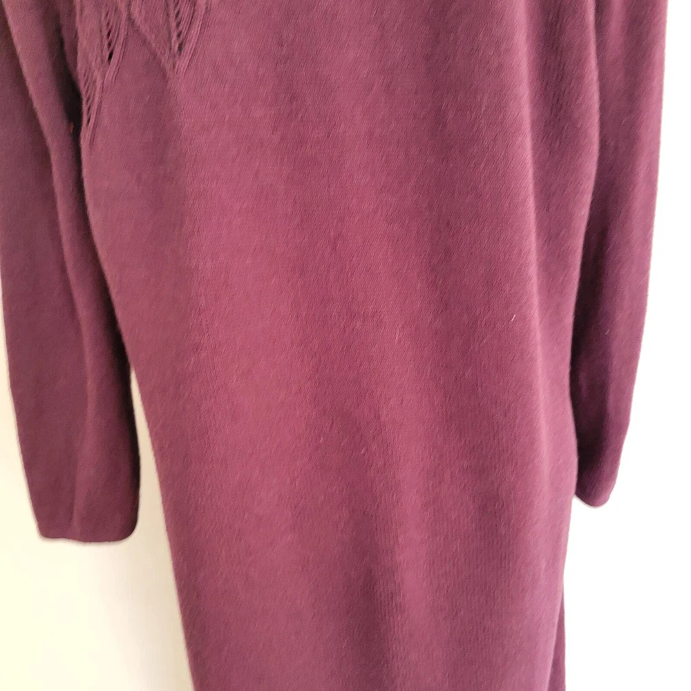 J. McLaughlin knit sweater dress Size XL extra large 54% cotton/44% modal Hand wash Pullover styling Round neck 3/4 sleeves Sangria purple Crochet detail Stretchy No pockets Unlined Approx. lay-flat measurements: Length: ~42.5" Pit to pit: ~20.5" Sleeves: ~19.5" Good pre-owned condition. There is some wash wear, esp. in underarm area, but no holes/stains