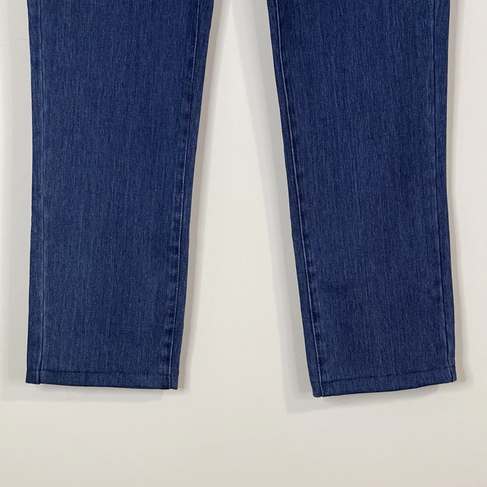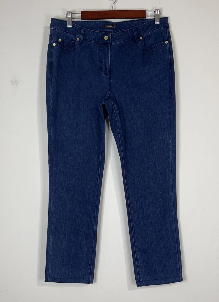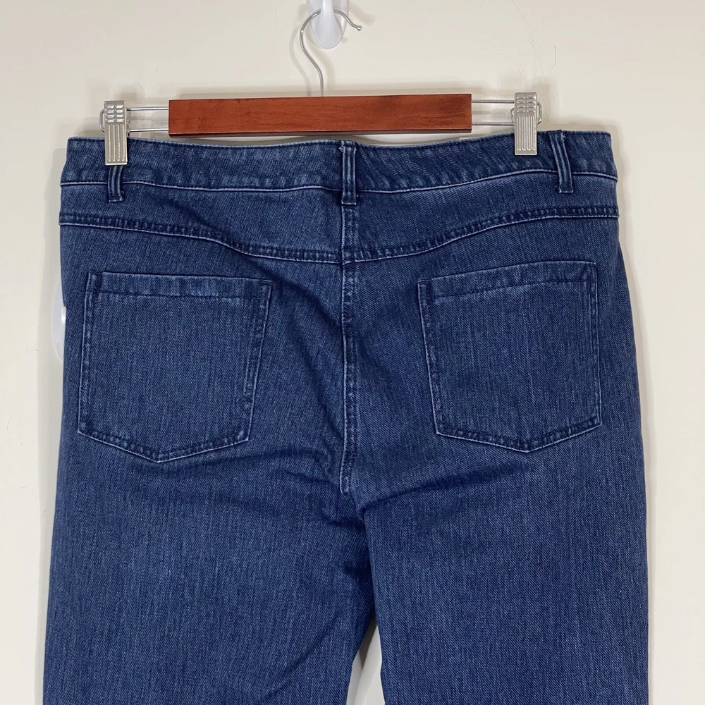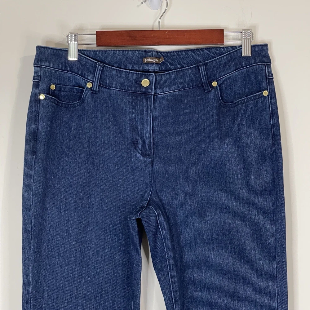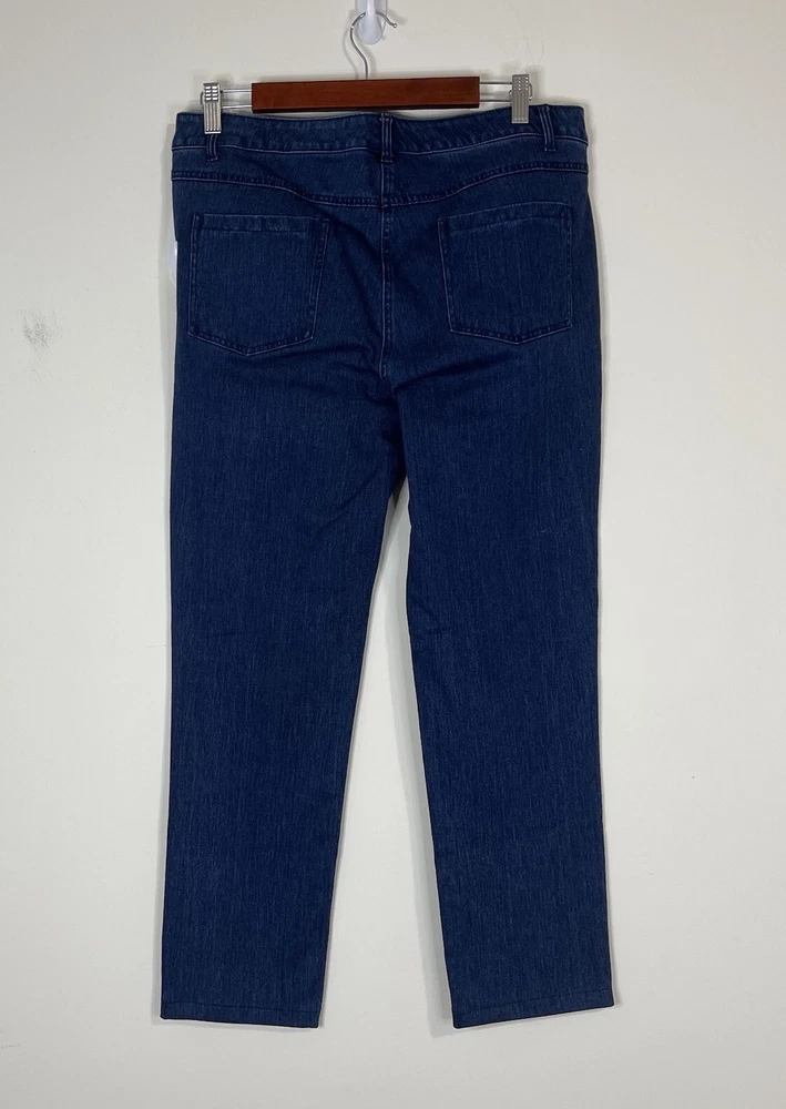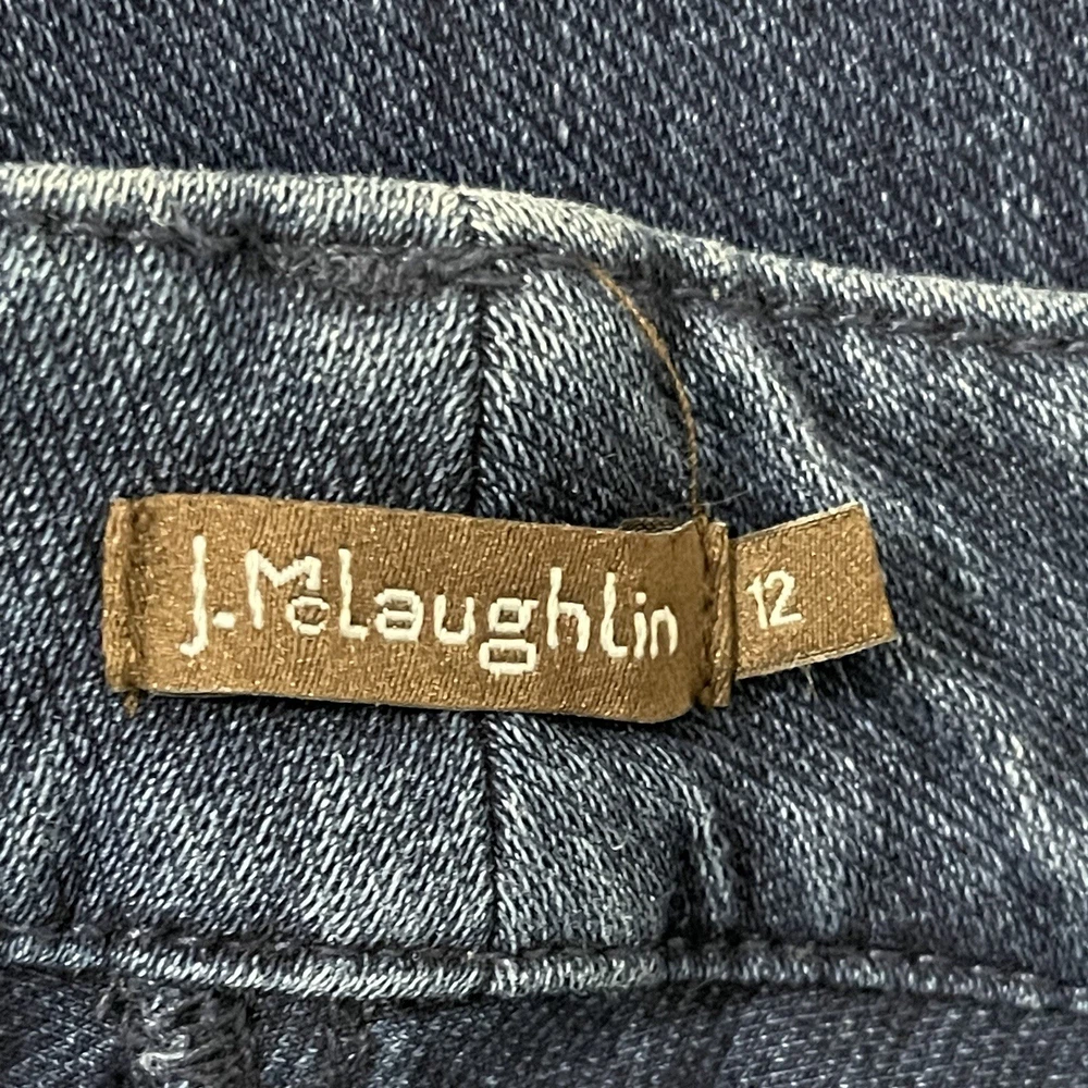 Condition: Pre-owned: Good used conditions with flaw (Hem has been altered, please see pictures for exact conditions ) Brand: J. McLaughlin Style: Straight Dark Denim Jeans Size : 12 Color: Blue Material: 95% Cotton, 5% Spandex Waist: Approx. 16” Hips: Approx. 17.5” Front Rise: Approx. 9.5” Inseam: Approx. 26.5” Features: -Button zip closure -5 pocket style -Straight leg -Mid-rise -Dark wash -Machine wash Please see measurements and pictures to be sure of fit. Size may change from previous washing. Waist is measured from front left side seam to front right side seam. Rise is measured from the end of the crotch seam to the middle front waistband. Inseam is measured from the end of the crotch area to the end of the leg opening. All measurements are approximate and measured flat across.