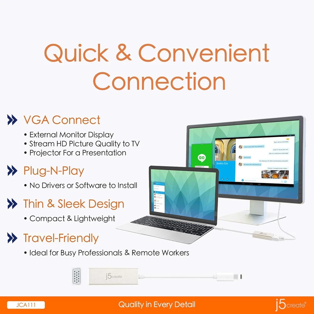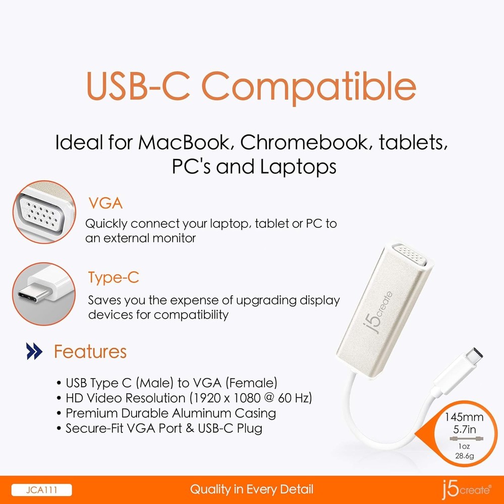 KleverKosmetics Our eBay Store About Us Contact Us Add to Favorite Sellers J5create USB Type-C to VGA Adapter Silver - JCA111 Lets you easily connect your USB Type-C devices to an external monitor, HDTV or projector. Show videos, photos and presentations on a larger screen for more colleagues or friends to see. Offers high-definition output. Ideal for your Apple MacBook, Chromebook or other laptop with a USB Type-C port. Features a male USB Type-C end and a female VGA end. Connects your devices to VGA (1080p resolution), HDMI (4K resolution) and DP (4K resolution). Effortless USB-C to VGA Connectivity: Easily connect your USB-C laptop or desktop to a VGA-equipped monitor or projector with this USB-C to VGA Adapter. No need to upgrade your displayjust plug in and start working or streaming instantly. Hassle-Free Plug-and-Play Setup: No drivers, no softwarejust instant compatibility. With DisplayPort Alternate Mode support, this adapter works seamlessly with MacBook, Chromebook, tablets, and Windows laptops. Crisp and Clear HD Resolution: Enjoy sharp visuals with support for VGA resolutions up to 1920 x 1200 or 1080p at 60Hz. Perfect for presentations, extended displays, or high-definition content playback. Compact and Travel-Ready: Designed for convenience, this pocket-sized adapter is lightweight and easy to carry, making it the perfect companion for business trips, meetings, or home office setups. Premium Aluminum Housing for Secure Connections: The durable aluminum casing not only enhances longevity but also ensures a stable and reliable connection for uninterrupted performance. Return and Refund Information • Please be aware that colors on the screen may appear slightly different in person. • Please be familiar with product. Feel free to contact us if you have any questions. • DUE TO HEALTH AND SANITARY ISSUES CONCERNING COSMETICS OR SKINCARE WE DO NOT ACCEPT RETURNS ON THESE ITEMS. ALL SALES ARE FINAL. • WE WILL ONLY ACCEPT RETURNS WHEN THE ERROR IS ON OUR END. • Attention VeRO members: We're not affiliated with or endorsed by the companies mentioned in this listing. All trademarks and copyrights are acknowledged, they are only used for informative description of the items offered for sale. Warranty information We are not an authorized dealer of this product and any warranty included with the product may not be honored by the manufacturer.
