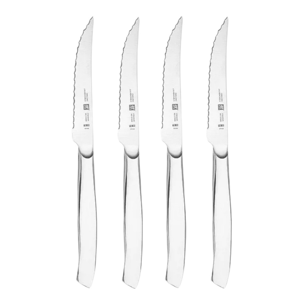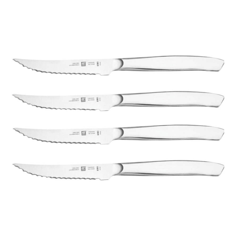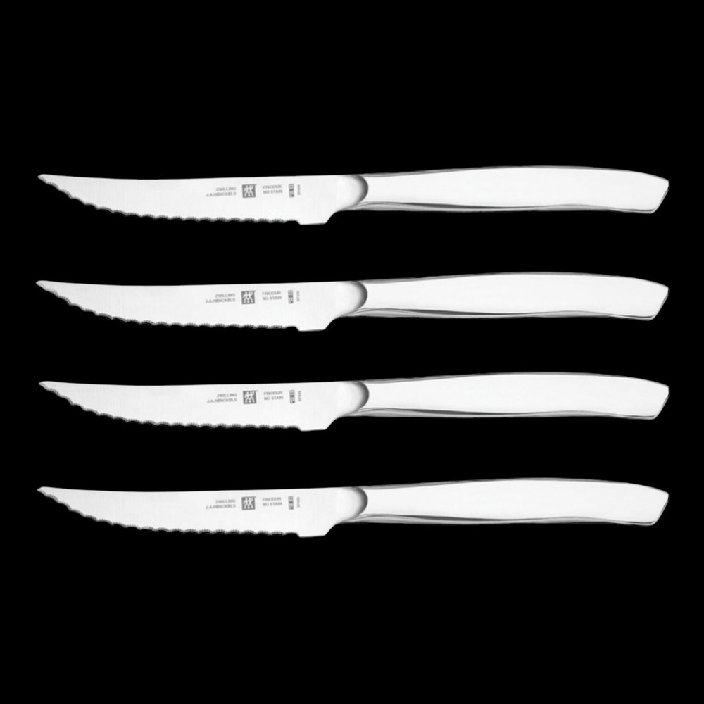 Country/Region of Manufacture: Germany Set Includes: Serrated Knife Blade Length: 4 in Brand: ZWILLING J.A. HENCKELS Personalize: No Number of Items in Set: 4 Features: Easy Clean Handle Material: Stainless Steel Type: Steak Knife Blade Edge: Serrated Material: Stainless Steel Color: Silver