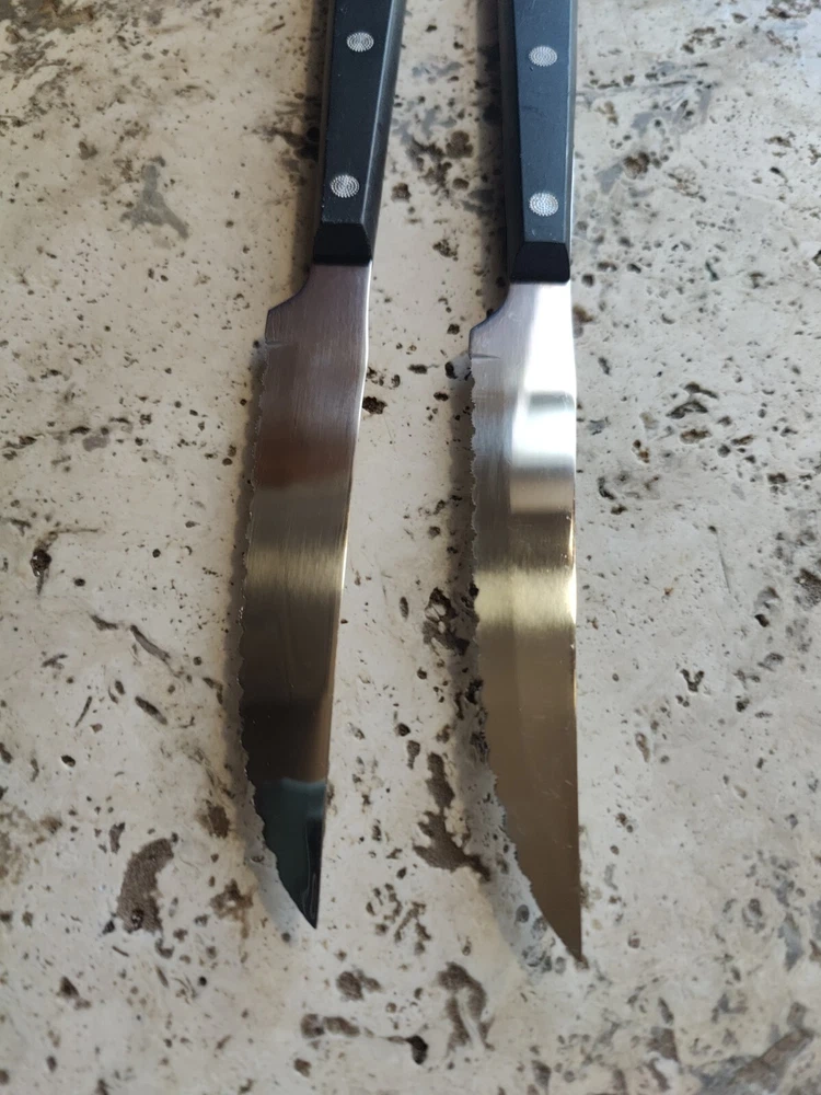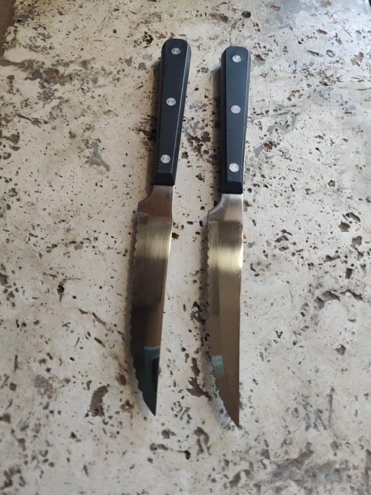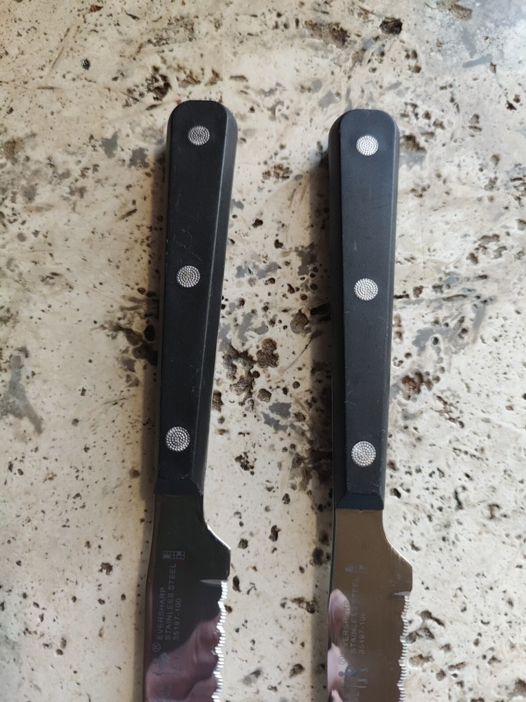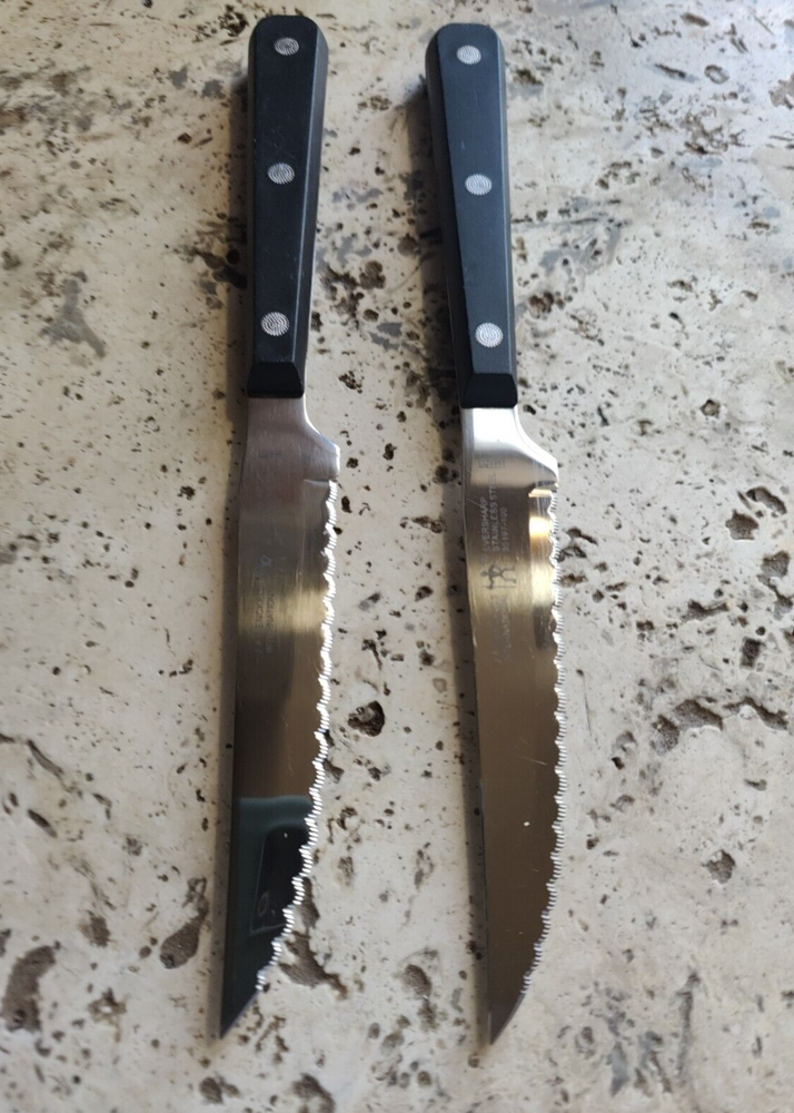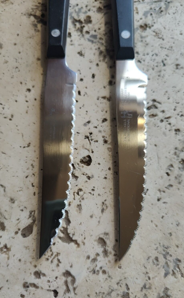 The J.A. Henckels Steak Knife Eversharp 35197-100 is a set of two steak knives with a blade length of 4.75" inches. The knives are made of black serrated stainless steel and are designed for cutting meat. They are dishwasher safe for easy cleaning and have composite handles for a comfortable grip. Both are preowned and show typical wear from use including scratches and buffs to the blade and handle.