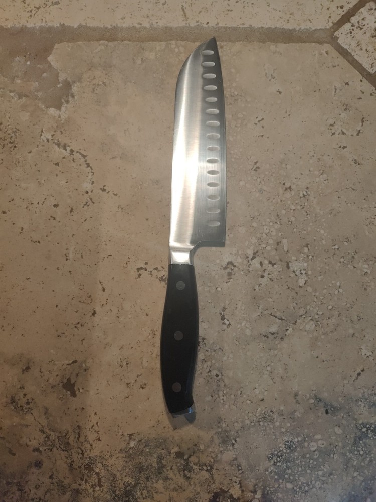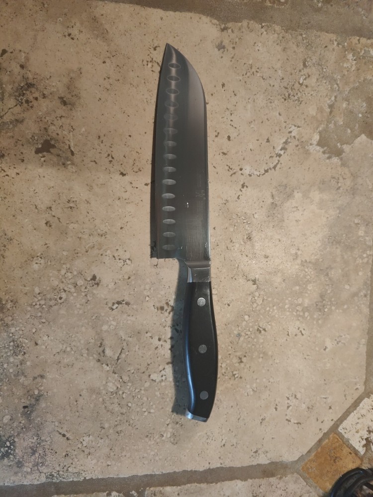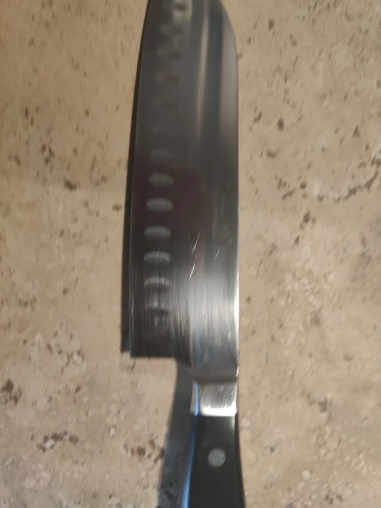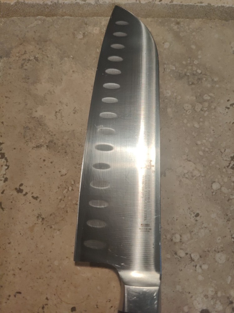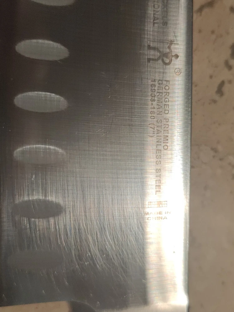The J.A. Henckels International 7" Chef Knife 19008-180 is a high-quality chef's knife made by ZWILLING J.A. HENCKELS. This stainless steel knife has a 7-inch blade length, making it ideal for a variety of kitchen tasks. This is a preowned knife that does show typical signs of wear from use including scratches and buffs to both the blade and handle.