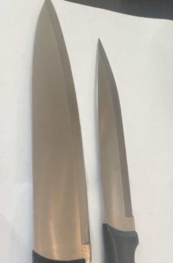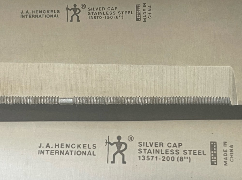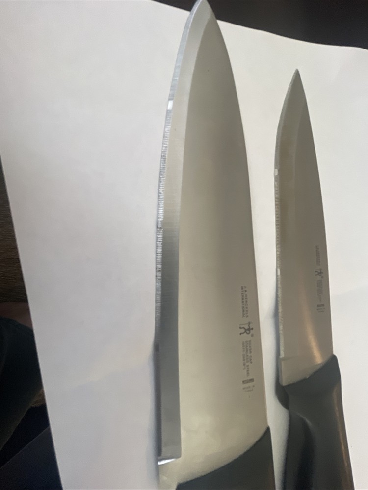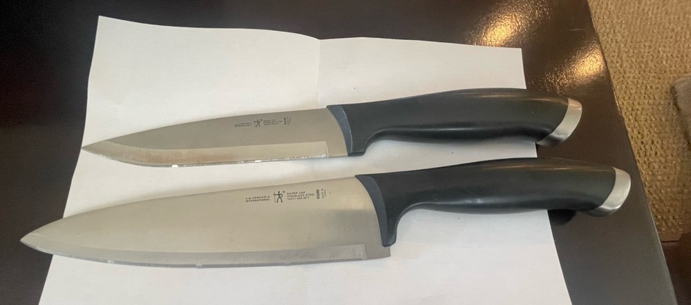 This set of J.A. HENCKELS knives includes an 8-inch and a 6-inch chef's knife, perfect for any kitchen. The blades are made in China and have a distinct style, making them a great addition to any collection. The brand is well-known for producing high-quality knives and these are no exception. The larger 8-inch knife is great for chopping and slicing, while the smaller 6-inch knife is perfect for more delicate tasks. Both knives have a sleek design and are made with the attention to detail that ZWILLING J.A. HENCKELS is known for. These knives are a great choice for anyone who loves to cook and wants a reliable set of knives to help with their culinary creations.