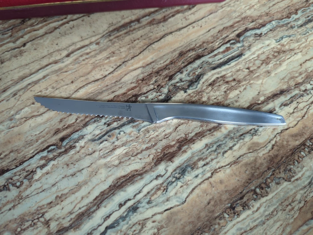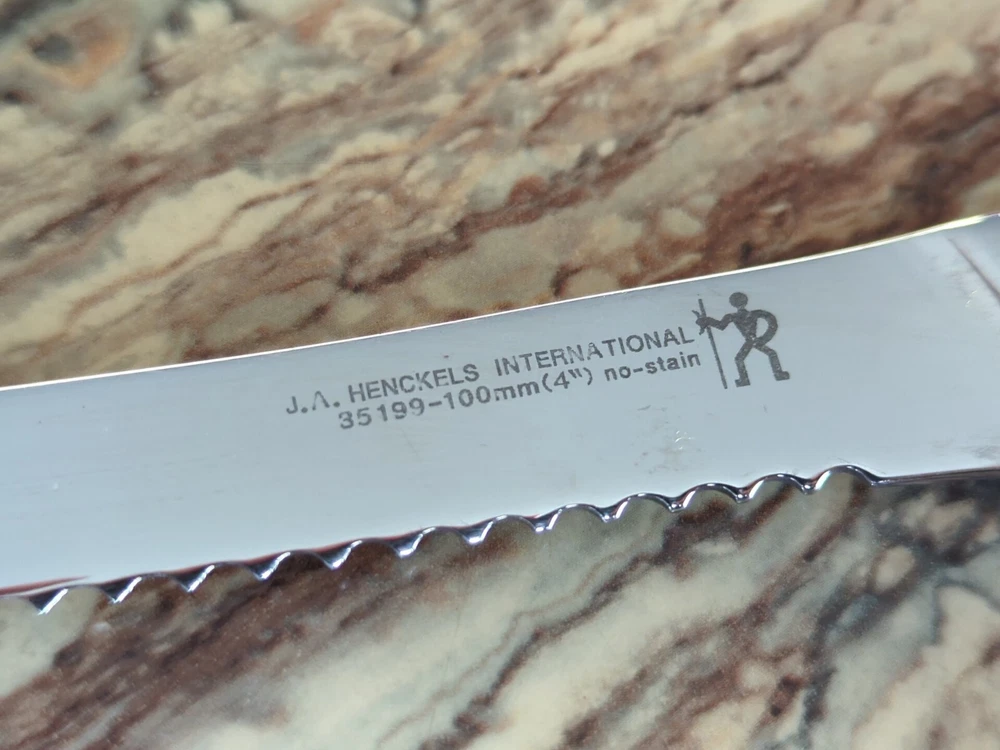 Set of 8 Used J.A. Henckels Solingen 35199-100 No-Stain Serrated Steam Knives. Great condition for their age. Some scratching from normal use. Lots of life left in them! Includes 8 knives and the original storage case.
