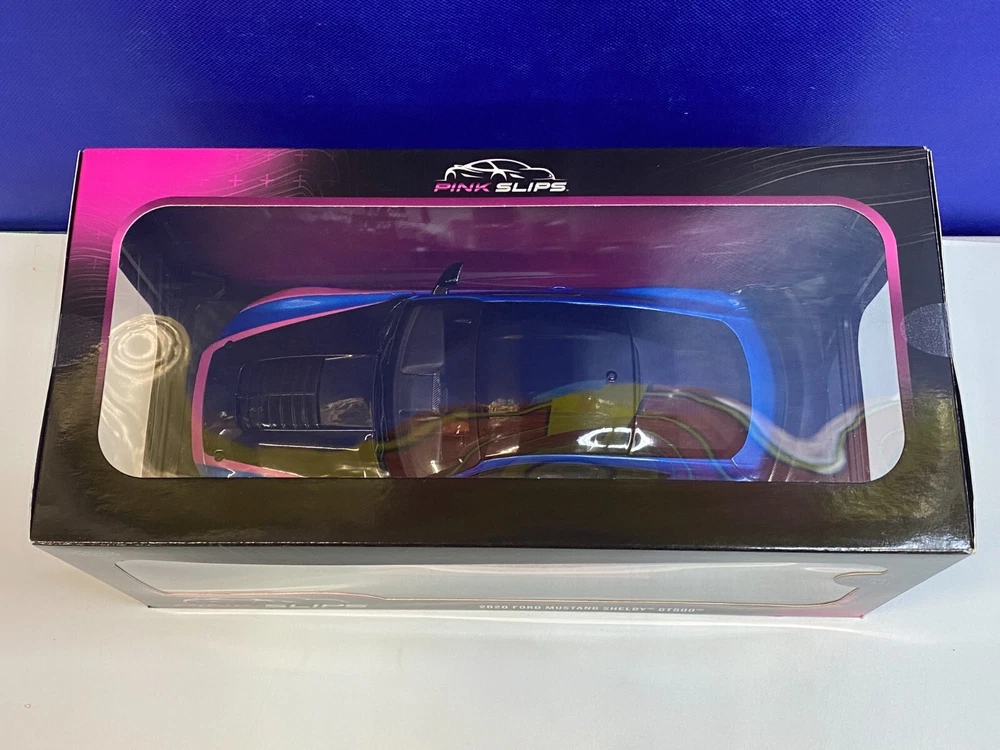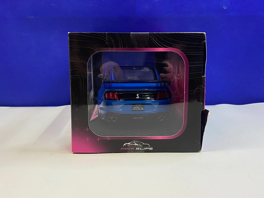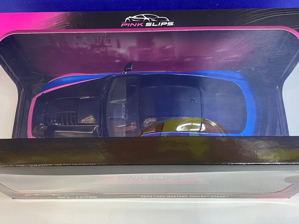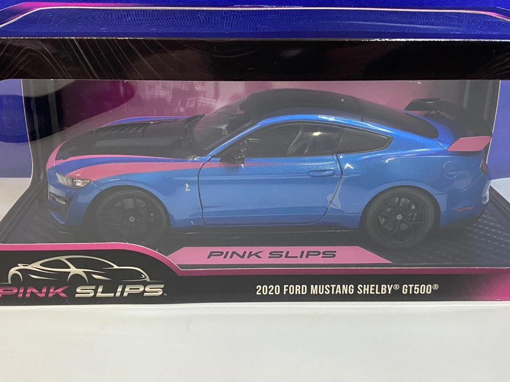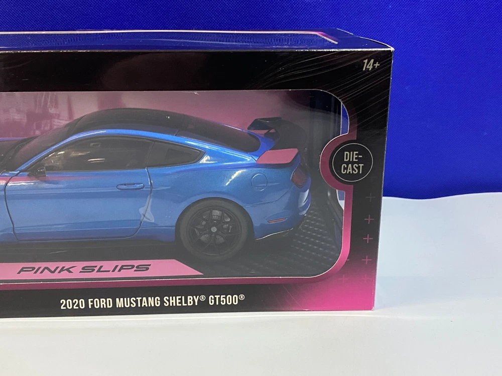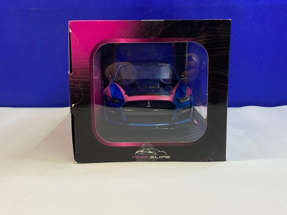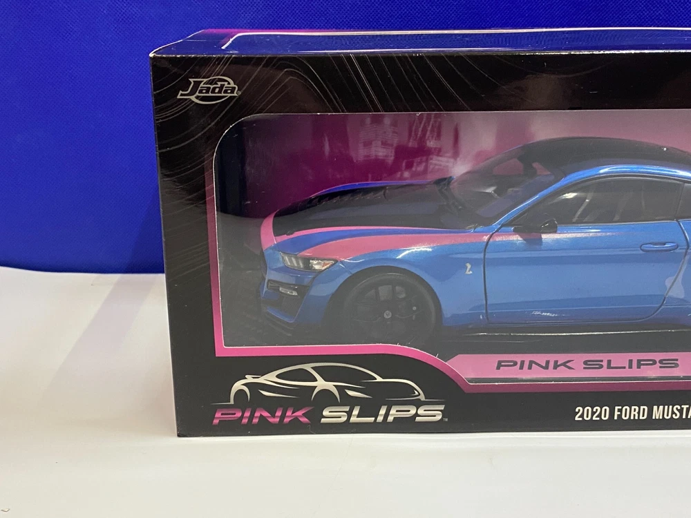 UP FOR YOUR CONSIDERATION IS A JADA 1/18 SCALE PINK SLIPS BLUE & PINK FORD MUSTANG SHELBY GT500. ITEM IS NEW IN THE PACKAGE. CAR & BOX (BOX HAS SMALL TEAR ON THE BACK AS SHOWN IN PICTURES) LOOK TO BE IN NICE CONDITION. CHECKOUT PICTURES FOR FURTHER DESCRIPTION. THE ITEM IN THE PICTURES IS THE ITEM YOU WILL RECEIVE. WILL BE PACKAGED AND SHIPPED WITH CARE. THANKS FOR LOOKING.. I PACK ALL ORDERS WITH CARE AND SHIP THEM IN A TIMELY MANNER TO ENSURE SAFE ARRIVAL OF YOUR GOODS. IF SOMETHING ARRIVES AND IS NOT TO YOUR SATISFACTION, PLEASE LET ME KNOW AND I WILL MAKE IT RIGHT. FEEDBACK WILL BE GIVEN TO BUYERS, WHEN FEEDBACK IS GIVEN TO SELLER. THANK YOU FOR YOUR BUSINESS.