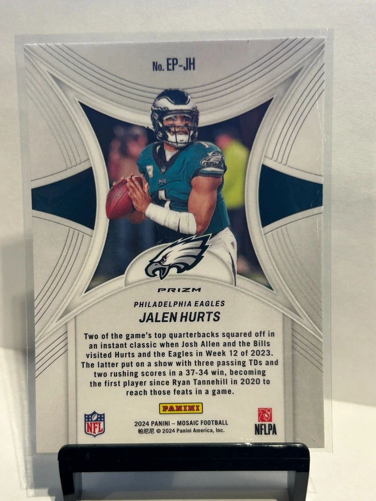 This is a rare and valuable sports trading card featuring Jalen Hurts, the talented quarterback for the Philadelphia Eagles. The card is from the 2024 Panini Mosaic set, specifically the Epic Performers insert set, and has a green prizm parallel/variety. The card number is EP-JH and it was manufactured by Panini in 2024. This card is a must-have for any NFL fan, especially those who collect sports trading cards. It features an authentic image of Jalen Hurts and is sure to be a standout addition to any collection. Don't miss out on this opportunity to own a piece of NFL history!