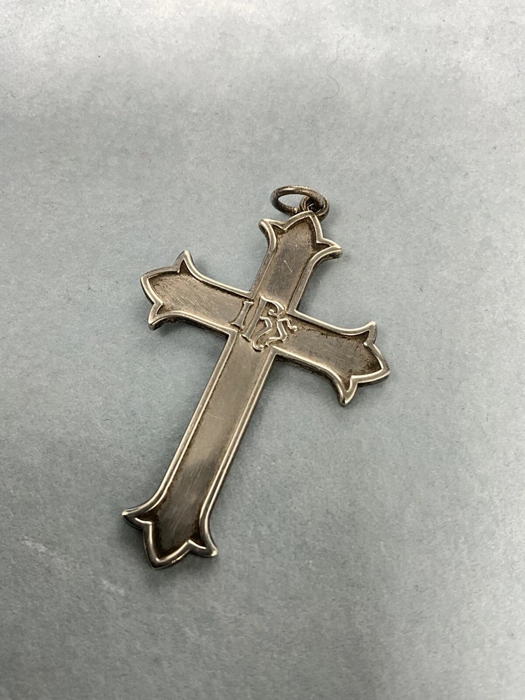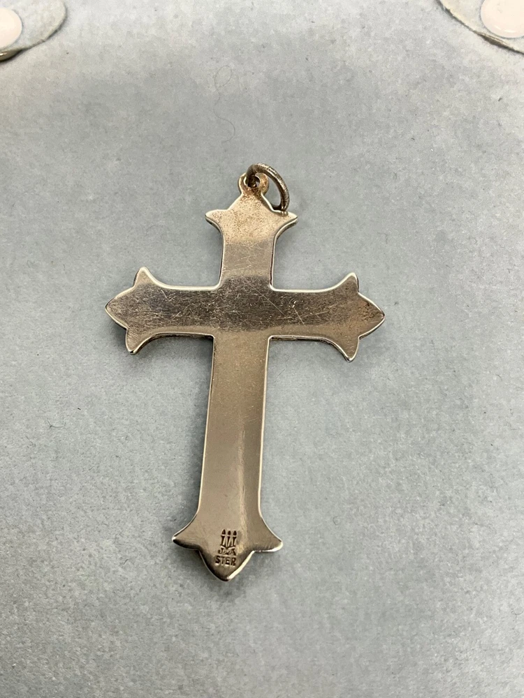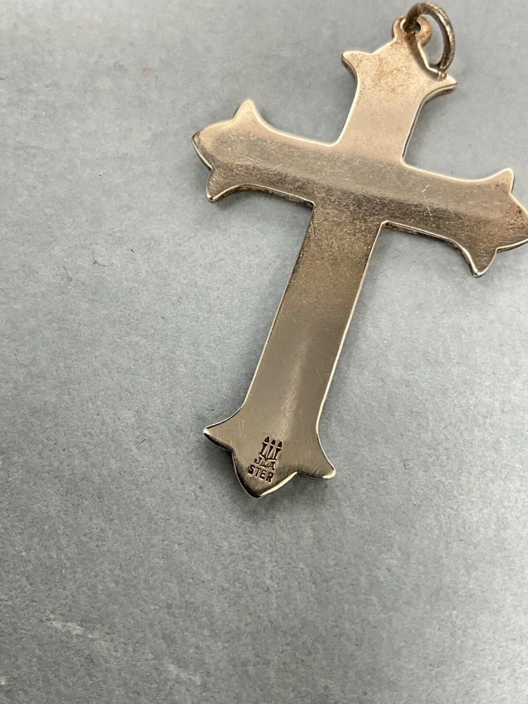You are bidding on JAMES AVERY 925 Sterling Silver Cross Pendant 2 1/4” 11.8g Overall in excellent condition. Showing very minor signs of wear on the backside. Some silver tarnish remains on the front (can be ultrasound or fine brush cleaned). Measures approx 2 1/4” x 1”. Marked on the backside.