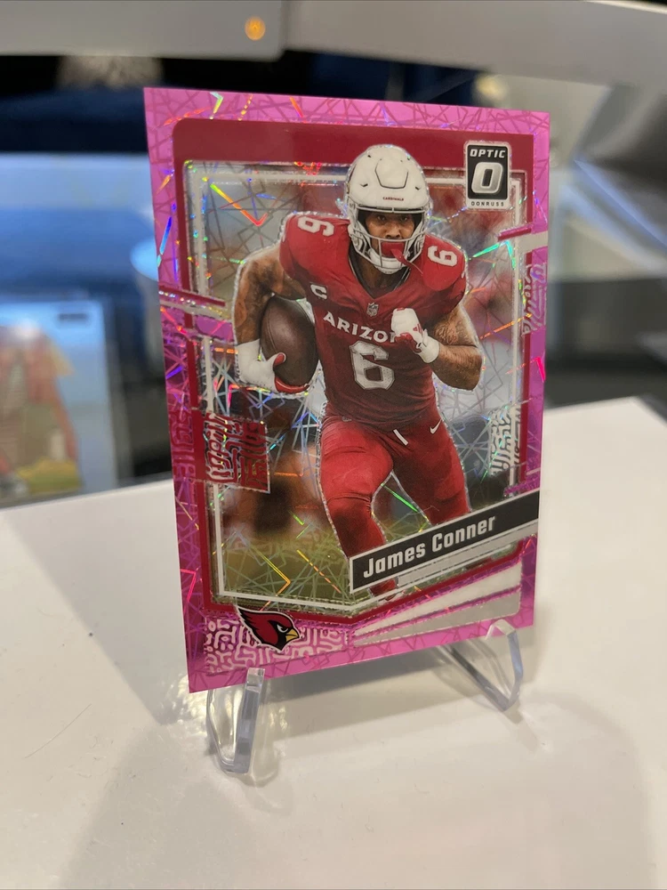 This is a rare and highly sought-after sports trading card featuring James Conner of the Arizona Cardinals. The card is from the 2023 Panini Donruss Optic set and has a print run of only 79. It is a Pink Velocity Prizm parallel variety, making it a unique addition to any collection. The card is in standard size and has been manufactured in the United States by Panini. It is an original and licensed reprint, with features such as being serial numbered and a short print. The card is named after the player himself and has the card number 3. This is a must-have for any fan of the National Football League (NFL) and sports trading cards.