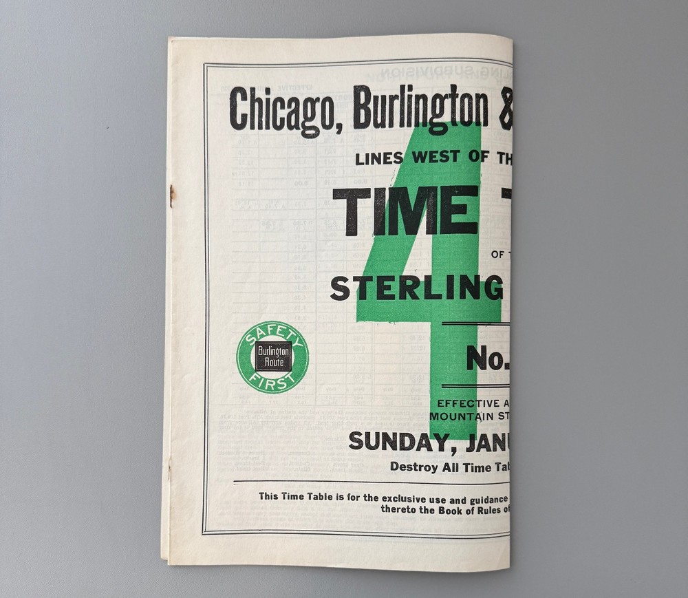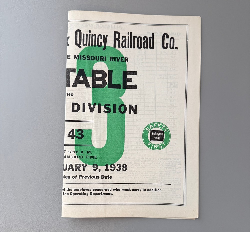 JAN 9 1938 CHICAGO BURLINGTON & QUINCY STERLING DIVISION EMPLOYEE TIMETABLE #43. Very nice, employee timetable for the Chicago Burlington & Quincy Railroad, Sterling Division, from January 9, 1938. #43 timetable. Horse blanket style. Great condition overall. Will ship via USPS Priority Mail, with insurance & tracking, and will be packed well for transit. PICK-UP is always available. We will combine shipping on multiple auctions when possible. Please wait to checkout until a revised invoice is sent. Please check out our other auctions as well, including other railroad collectibles!