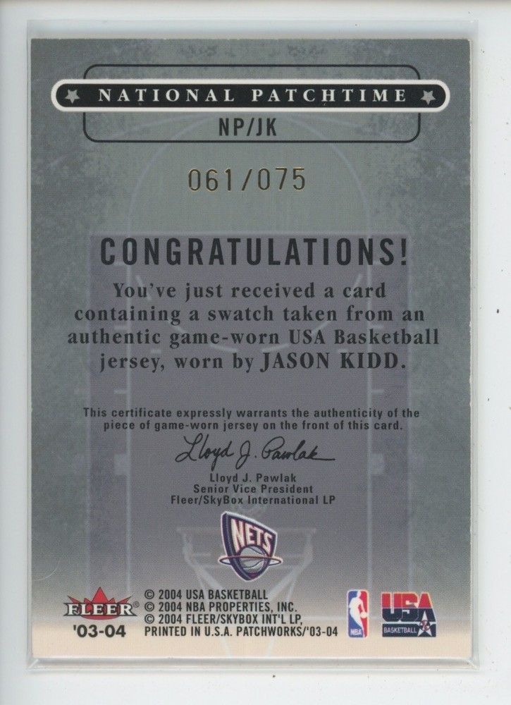 You are bidding on... JASON KIDD JERSEY LOGO PATCH /75 2003-04 FLEER PATCHWORKS NATIONAL PATHTIME USA If listing is an auction we will not end the auction early! If the listing is A Buy It Now, you may make an offer through the BIN option on the listing page, we will not respond to messages regrarding ending a listing early or asking for a "best price". We provide pictures of the front and back of every card for you to see condition before bidding, but we feel all cards are NM-MT, unless otherwise noted. If card is graded then we trust the 3rd party grading companies for thier opionion! United States SHIPPING ONLY USA Shipping Is $5.00 for the 1st Card and .50 each card after the 1st. If you purchase 13+ shipping will be a flat $10.00. You can combine shipping on all cards won in a 3 day period, no exceptions to this rule as we have everything automated. If you are outside the USA and choose to purchase any of our items your shipping will be though eBay's Global Shipping Program, The Global Shipping Program and it's shipping rates are determined through eBay and not us, so you need to familiarize yourself with their rates before bidding.