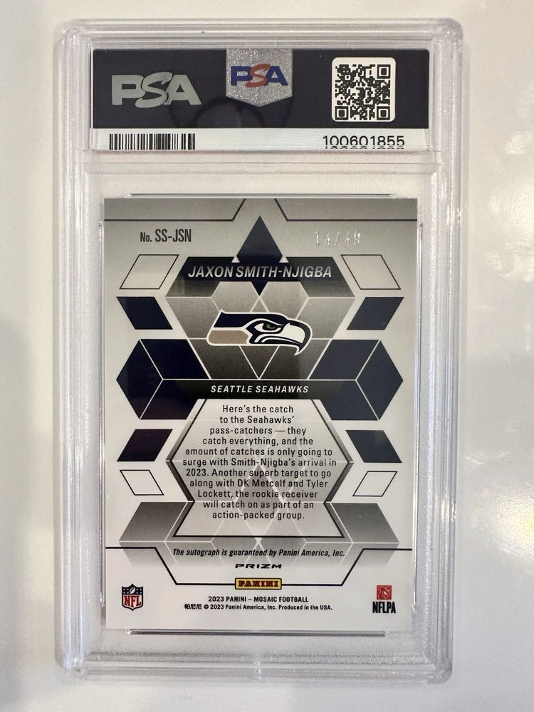 JAXON SMITH-NJIGBA 2023 MOSAIC SHOWTIME ROOKIE PURPLE RC AUTO /49 PSA 9 is a football trading card featuring Jaxon Smith-Njigba, signed by him and part of the Mosaic Showtime Rookie Purple set. This original card from 2023 is serial numbered, a rookie card, and has a purple design. It is a parallel variety with a limited edition of 49.