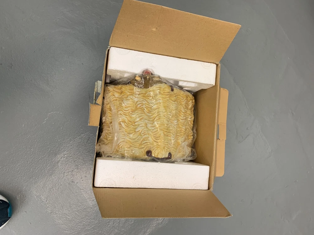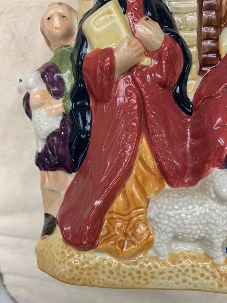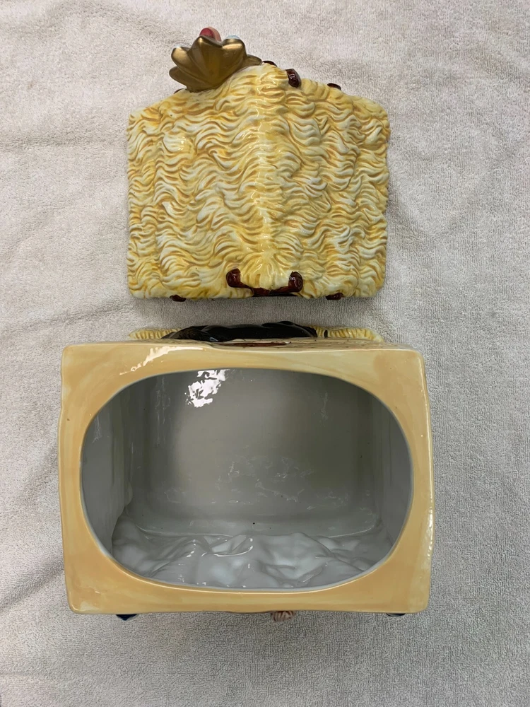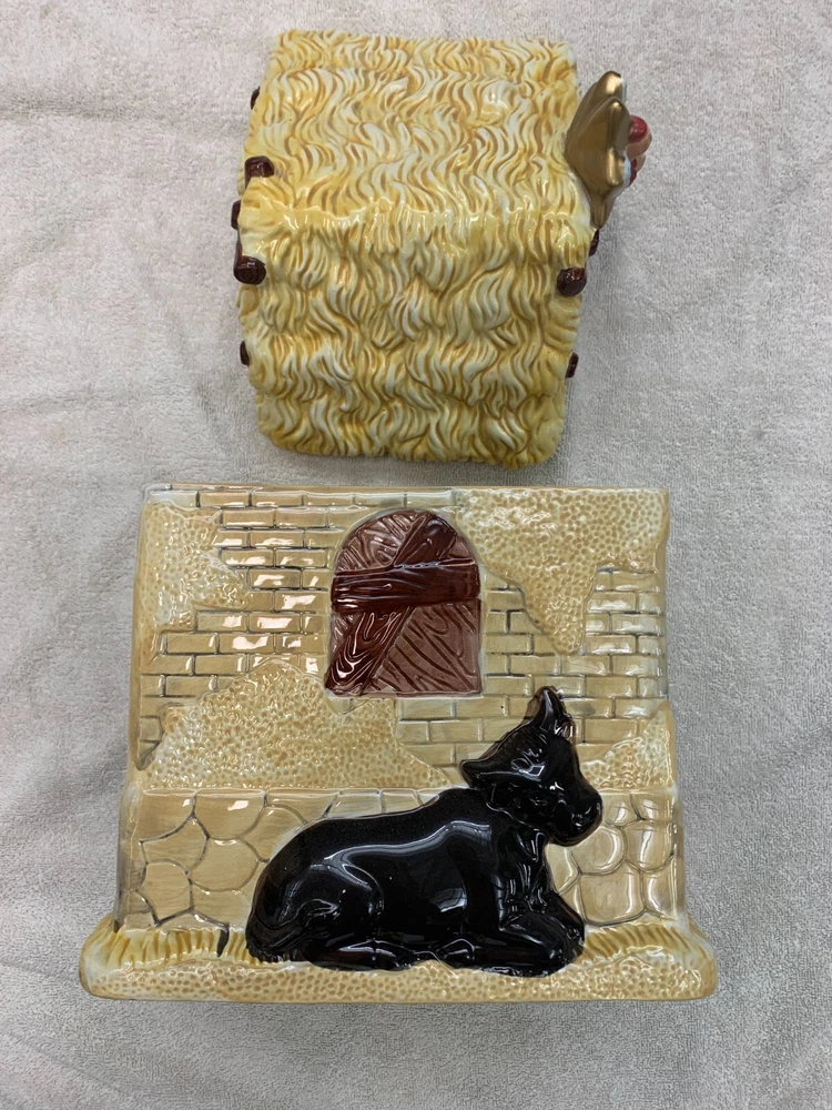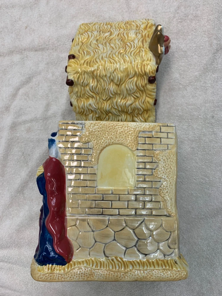 Celebrate the birth of Jesus with this eye-catching ceramic cookie jar from Jay Imports. Featuring a detailed & colorful nativity scene with dimensional figures and animals, this jar is perfect for storing your favorite holiday treats. The jar comes with a roof lid with angel/star and includes two items in total. Made with care, it's a great addition to any Christmas decor. Whether you're using it to serve cookies or as a decorative piece, this nativity scene cookie jar is sure to bring joy to your home this holiday season. 12" high x 10" wide x 7 1/2" deep One tiny chip in Shepard's pink robe- easily touched up. (see detail) Otherwise, item is pristine.