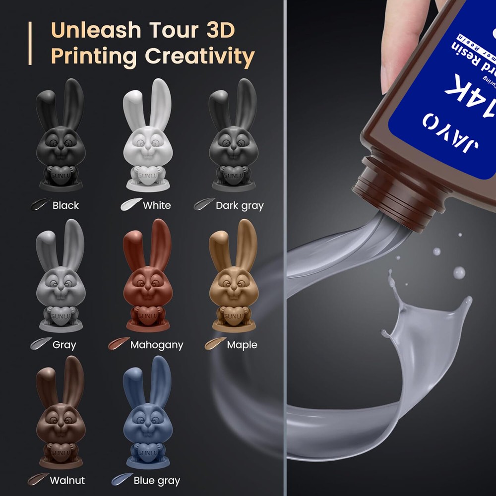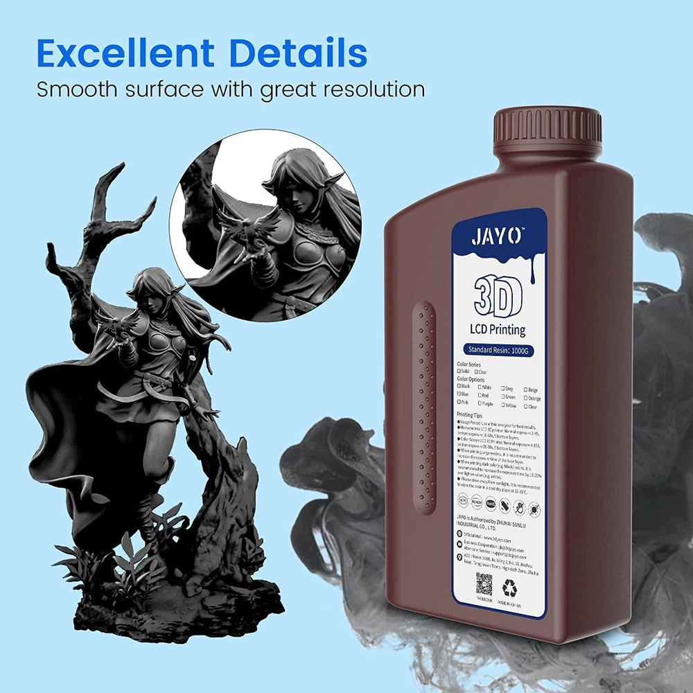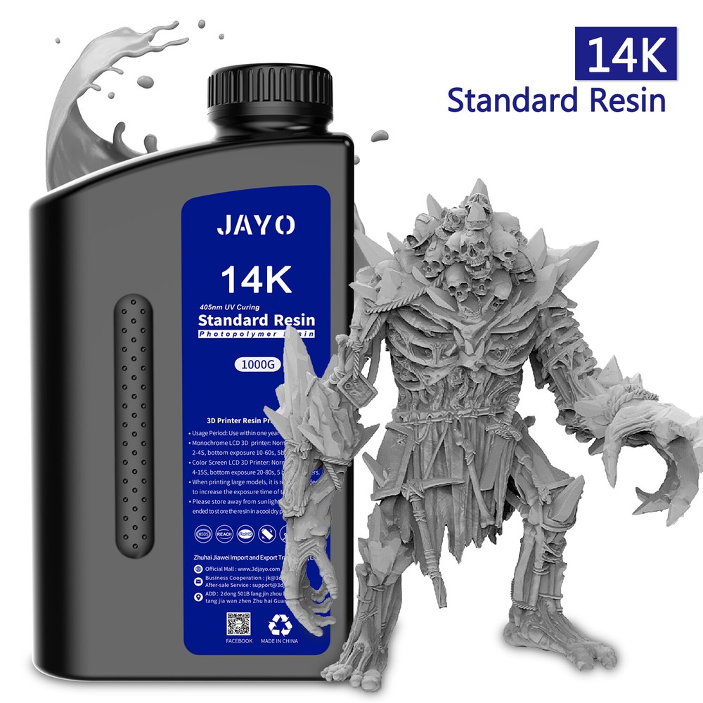 JAYO 14K High Precision 3D UV Resin 405nm For LCD / DLP / SLA 3D Resin Printer 14K Ultra-high Precision Resin - JAYO 14K 3D printer standard resin, the details of the printed resin model are super delicate and shows excellent results. The matte texture makes the 3d printed resin model more expressive and vivid. It is very suitable for printing figures that need to show rich details. Premium 3D Printing Rapid Resin - The upgraded matte 405uv 3D printer photopolymer resin has stronger light resistance and can more accurately display the details of the resin printed model. After rapid curing, the original color and effect of the resin are maintained, improving the success rate of printing. Low Shrinkage 3D Printing Resins - JAYO 3d resin R&D team focuses on improving the printing stability of 3D resin and reducing the volume shrinkage during the curing process. With JAYO 14K 3D resin, the printed model will not prone to deformation or cracking after wash and curing. Low Odor 405nm UV Photopolymer Resin - After testing, JAYO 3D 14K standard resin has a lower printing odor compared to other 3D resins in the market, providing 3D resin users with a more comfortable printing environment. JAYO resin is also easy to use and can easily clean the print model with alcohol or ethanol. Widely Compatible 3D Resin - JAYO has independent production lines for various 3d resins, such as JAYO red wax resin, standard resin, upgraded standard resin, water-washable resin, ABS-like resin, nylon resin, etc. JAYO 3D resins are suitable for most resin 3D printers on the market. Type 14K Standard Resin Easy to Clean with Alcohol Weight 1KG Features 14K Ultra-high Precision, Matte Texture, Super Delicate, Lower Printing Odor Curing Wavelength 395-405nm Surface Hardness 80-84 D Molding Shrinkage 6%-8% Elongation at Break 10% Bending Strength 10 Mpa Bending Modulus 1224 MPa Bottom Exposure Time RGB Screen: 40-100 s Mono Screen: 30-80 s Layers Exposure Time RGB Screen: 6-15 s Mono Screen: 2-3.5 s 3D Printer Resin