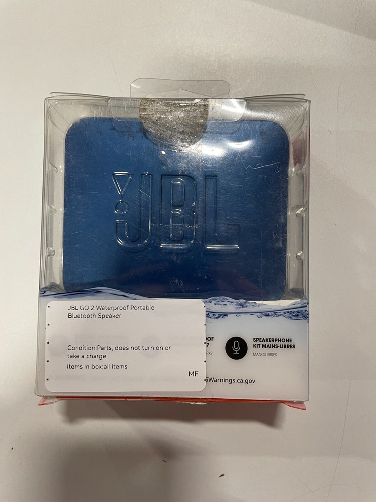 MPN:JBLGO2BLUAMCompatible Brand:UniversalType:Portable SpeakerSeller Notes:“Does NOT turn on & does NOT take a charge”Color:BlueFeatures:Bluetooth, WaterproofConnectivity:BluetoothCompatible Model:UniversalAudio Inputs:AUXBrand:JBLgtin13:050036354295Model:JBL Go 2UPC:050036354295